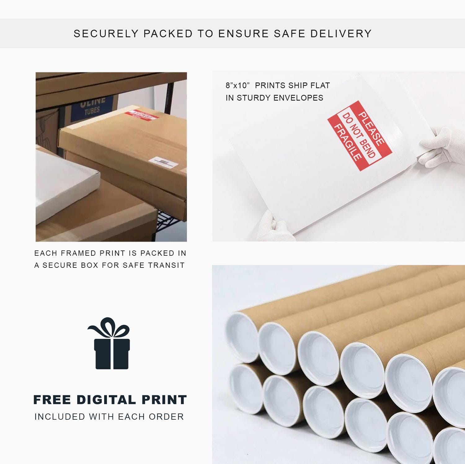 All prints are made to order. UNFRAMED prints typically ship in 2-4 business days and FRAMED prints usually ship in 5-9 business days. Once shipped, you will receive a tracking number to follow your order's journey.