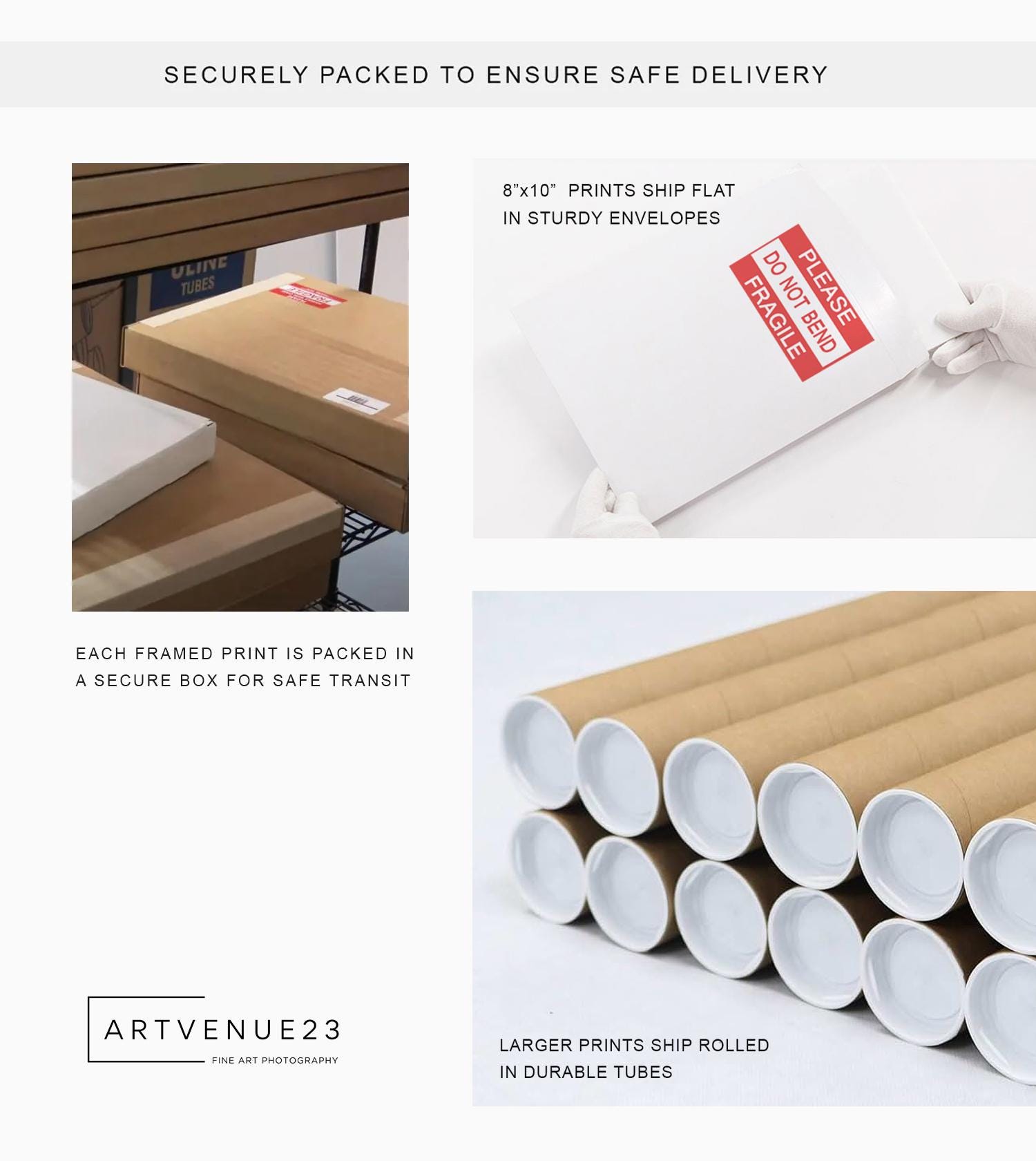 All prints are made to order. UNFRAMED prints typically ship in 2-4 business days and FRAMED prints usually ship in 5-9 business days. Once shipped, you will receive a tracking number to follow your order's journey.