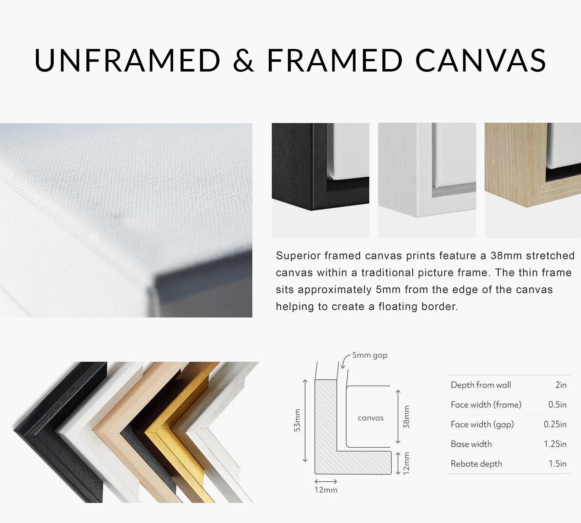 β’ Giclee printed on premium 38mm stretched canvas, elegantly set within a classic floating frame (framed canvas) or custom stretched over wooden pine frame.