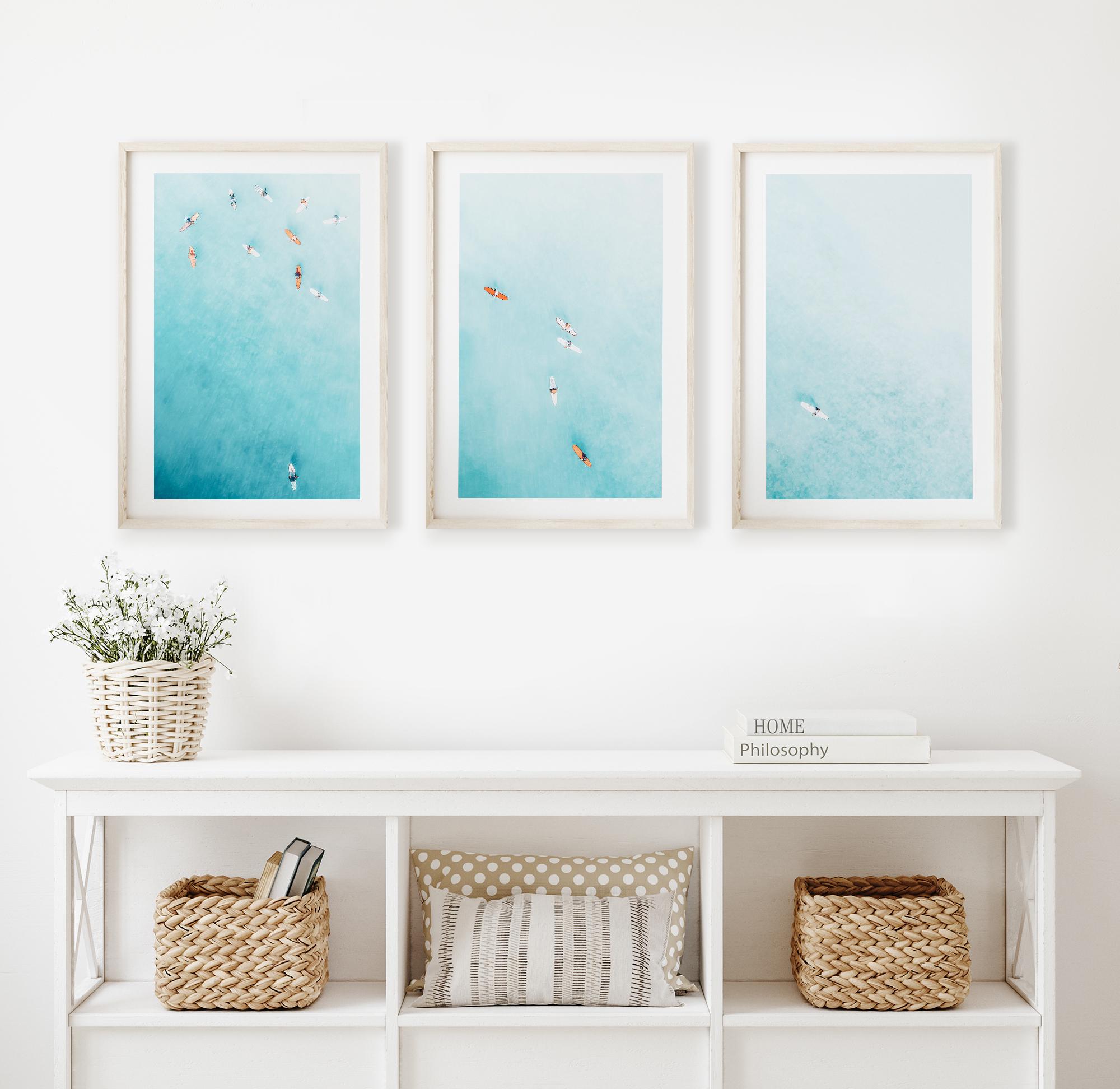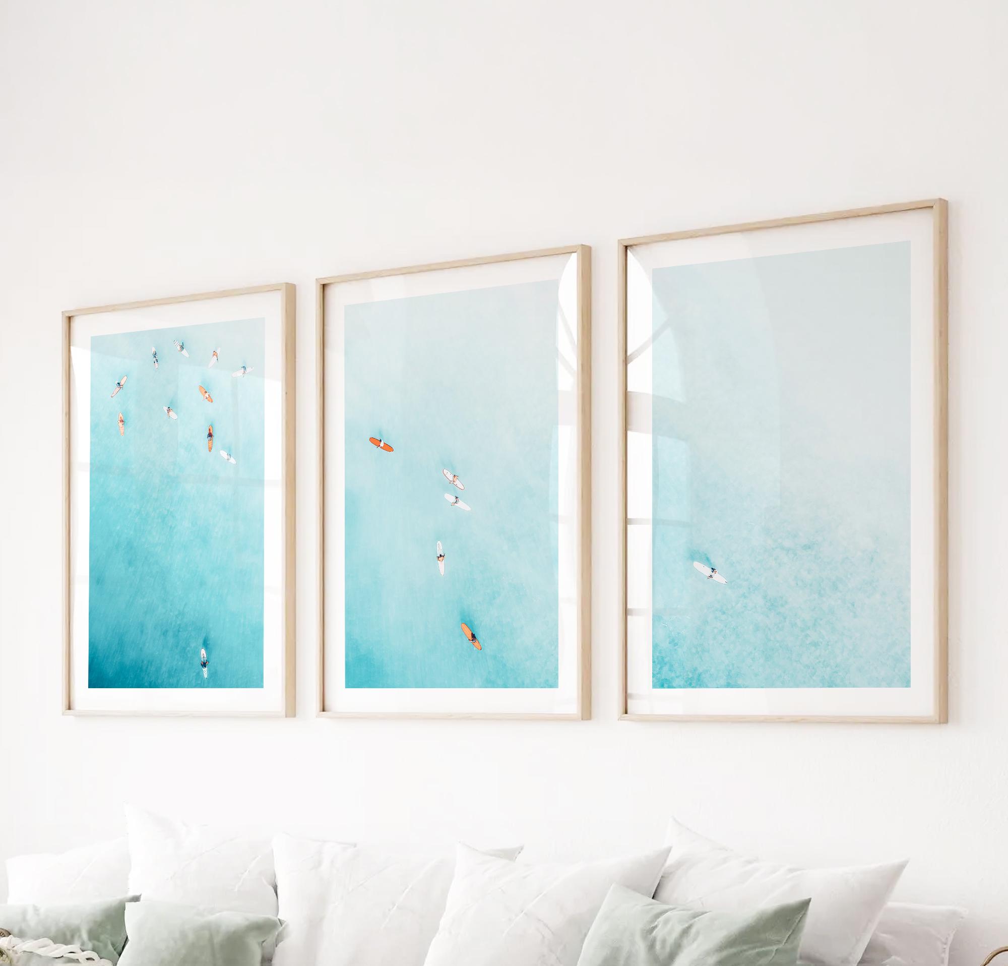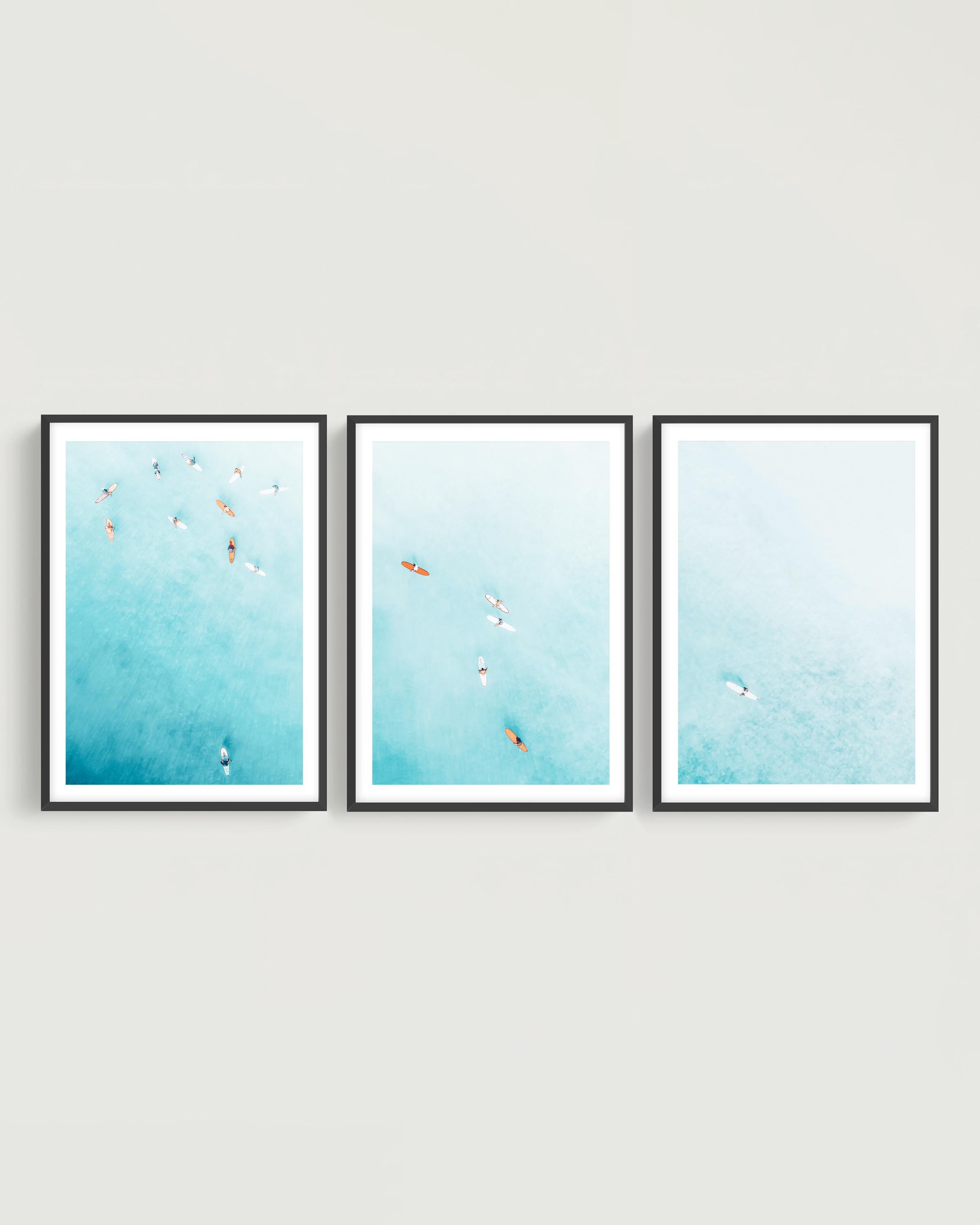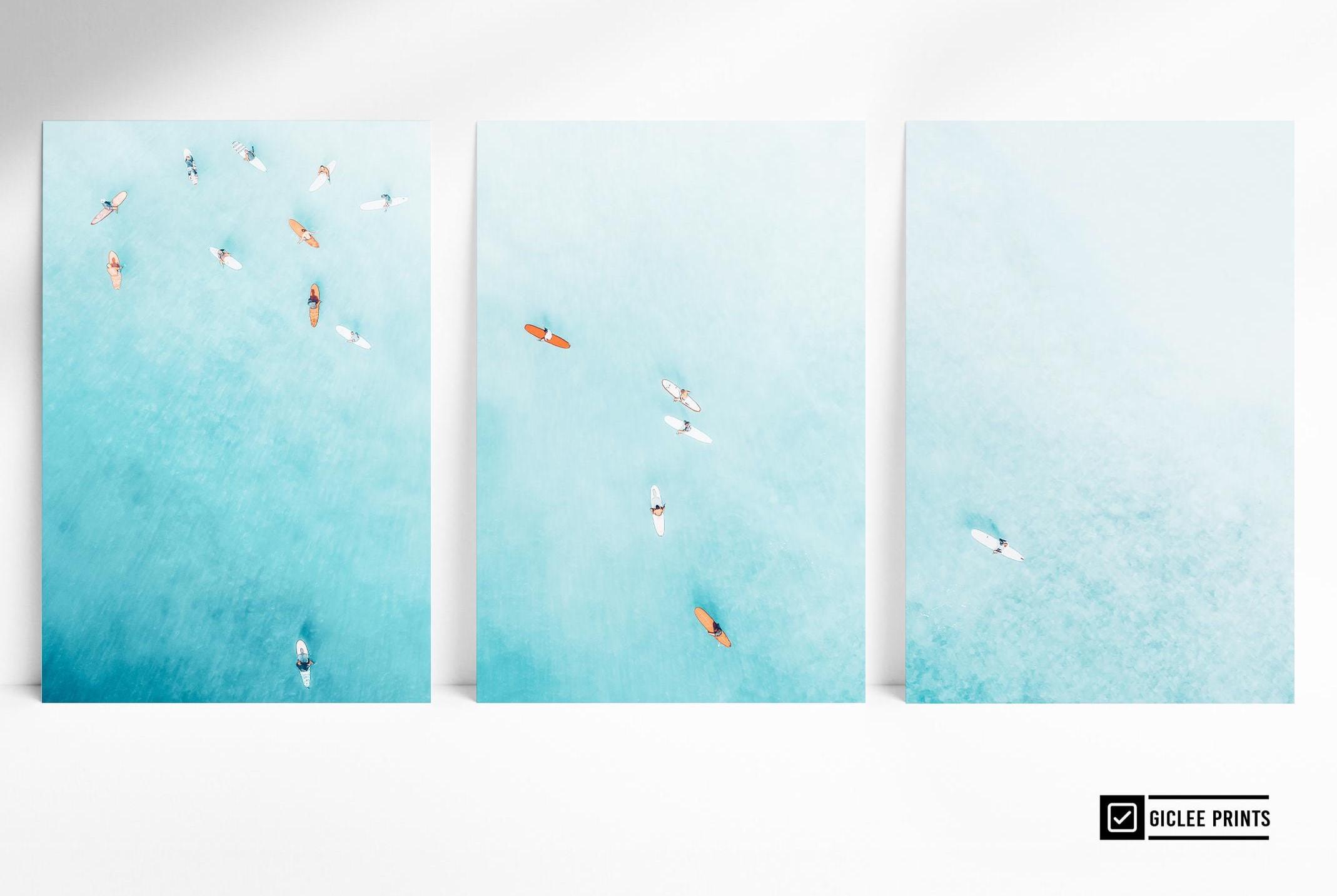 Set of 3 fine art aerial photos of teal ocean and surfers, perfect for beach houses, bedrooms, living rooms, or serene office spaces. The size selected in the dropdown refers to each individual print. This set includes 3 prints in the same size - for example, choosing 11x14 means you will receive three 11x14 prints, creating a total wall art display measuring approximately 33x14 inches when arranged side by side.