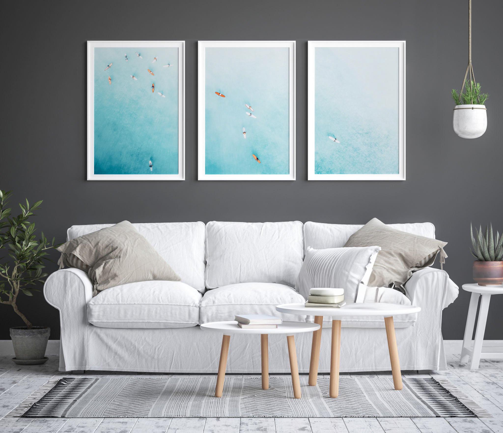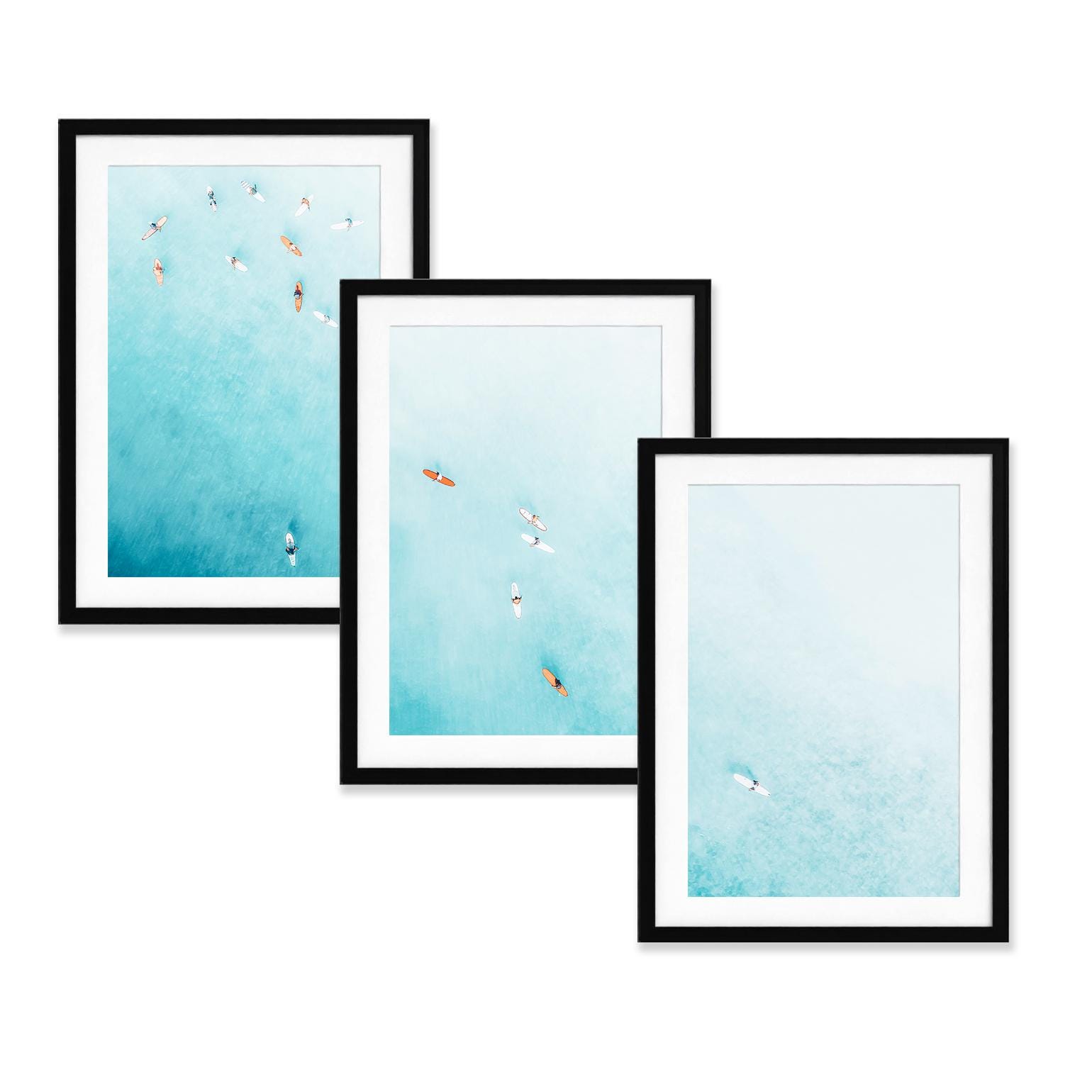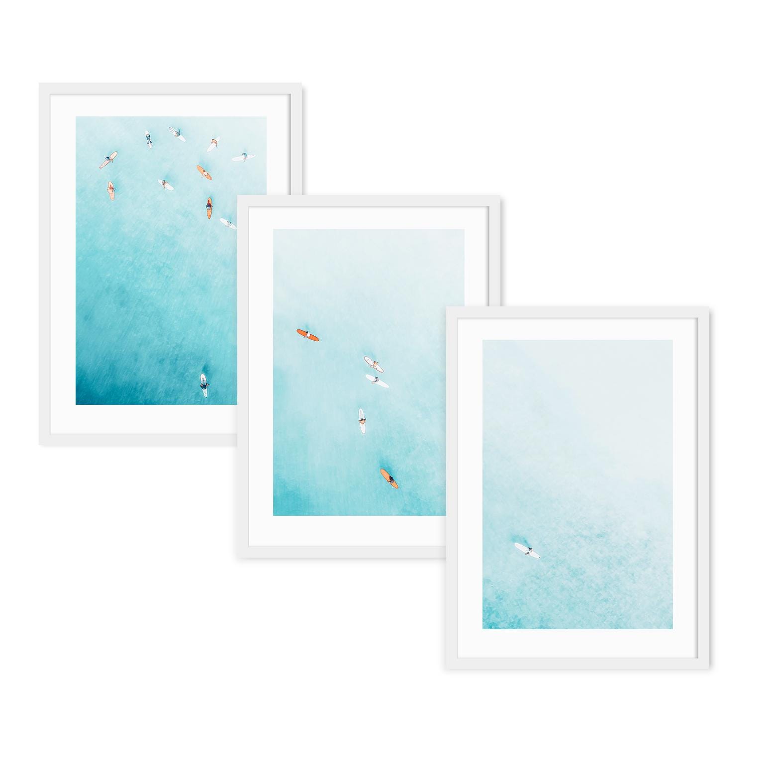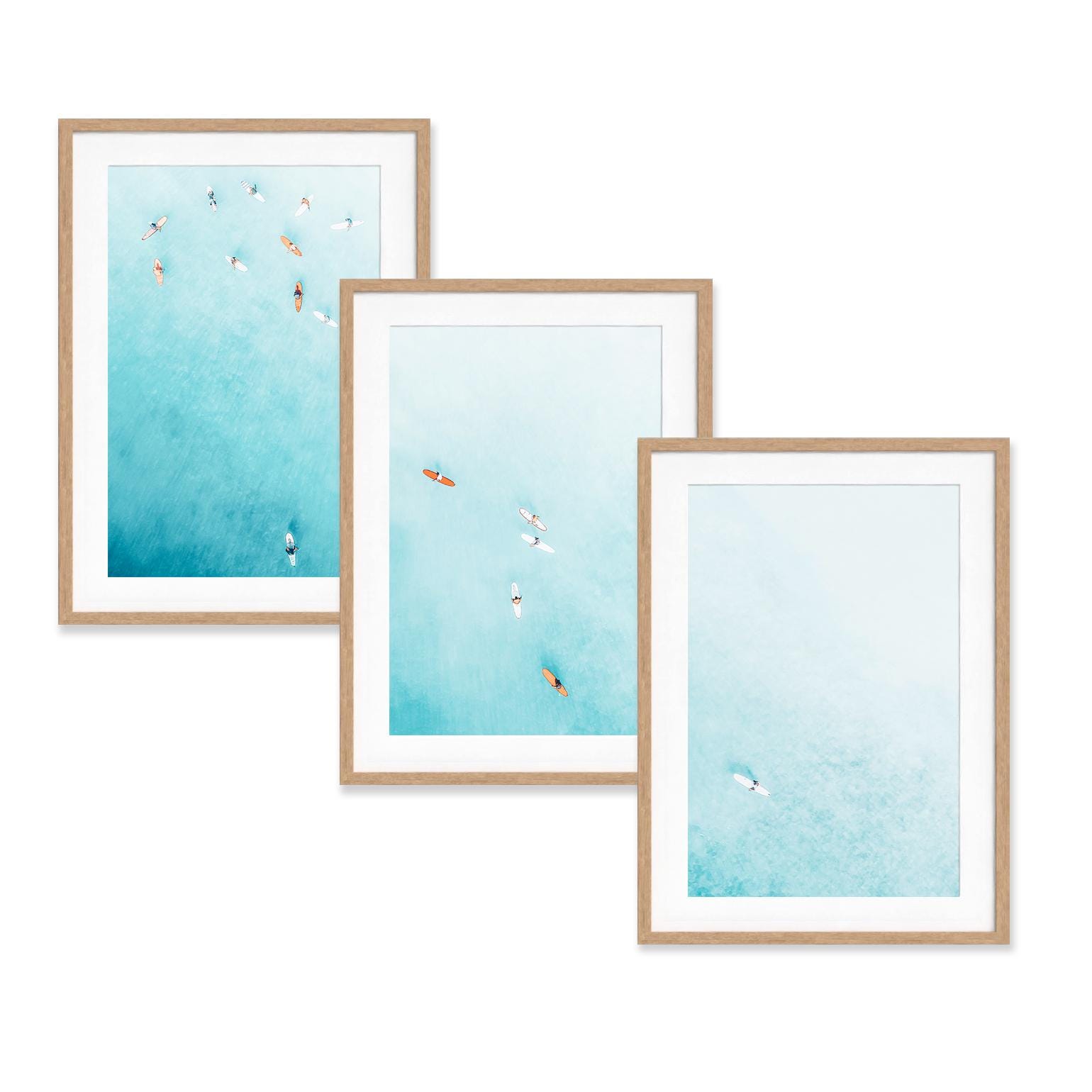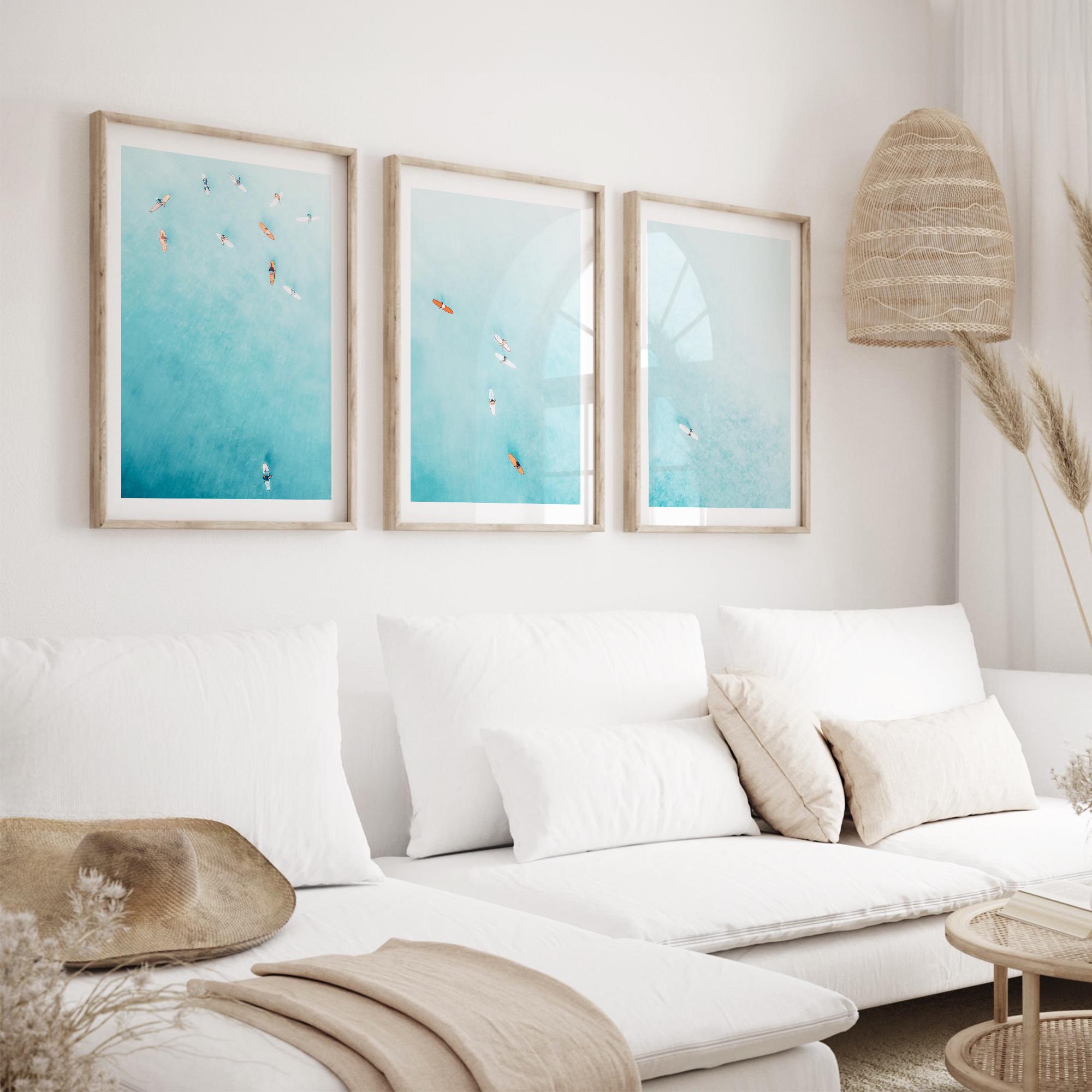 Set of 3 fine art aerial photos of teal ocean and surfers, perfect for beach houses, bedrooms, living rooms, or serene office spaces. The size selected in the dropdown refers to each individual print. This set includes 3 prints in the same size - for example, choosing 11x14 means you will receive three 11x14 prints, creating a total wall art display measuring approximately 33x14 inches when arranged side by side.