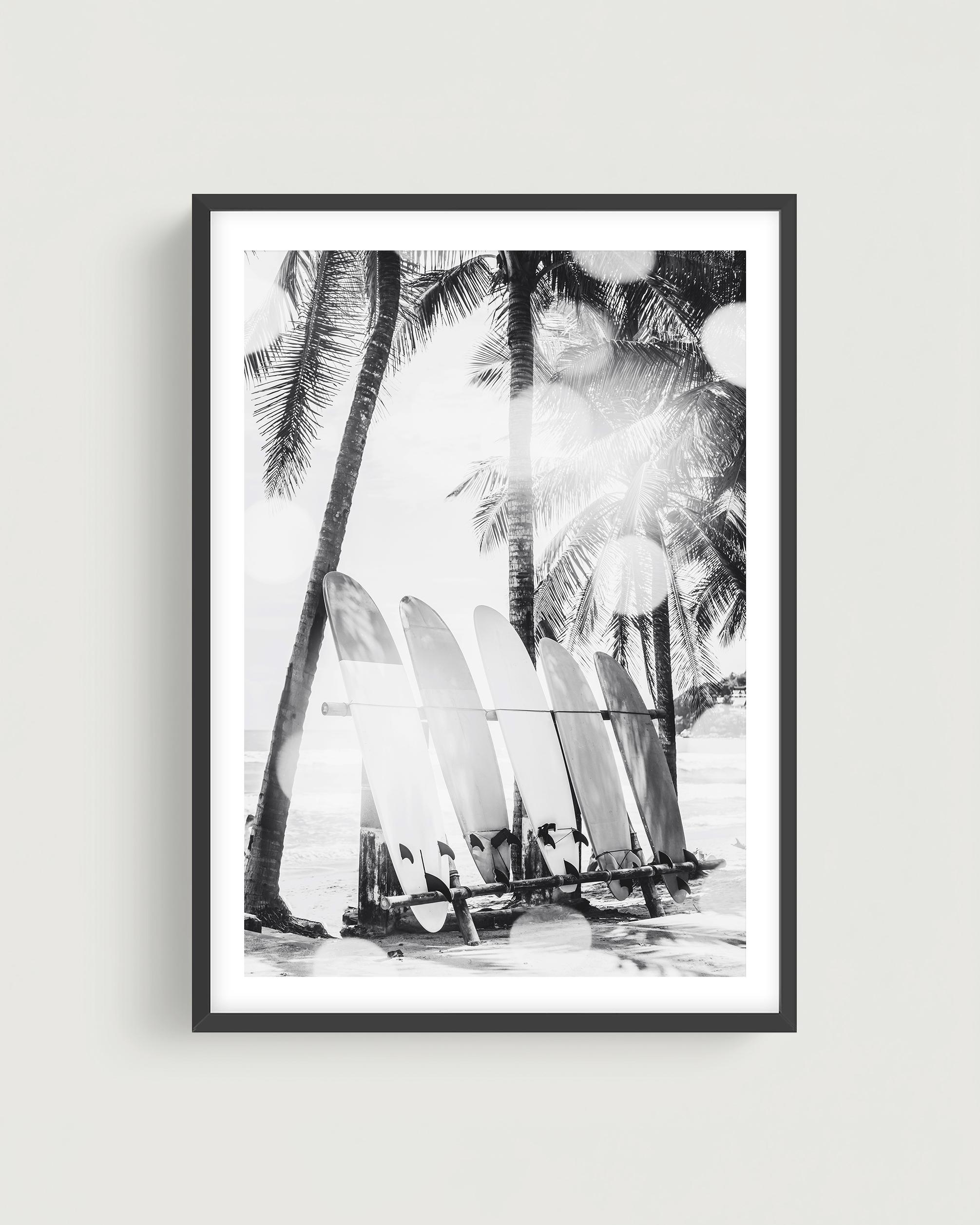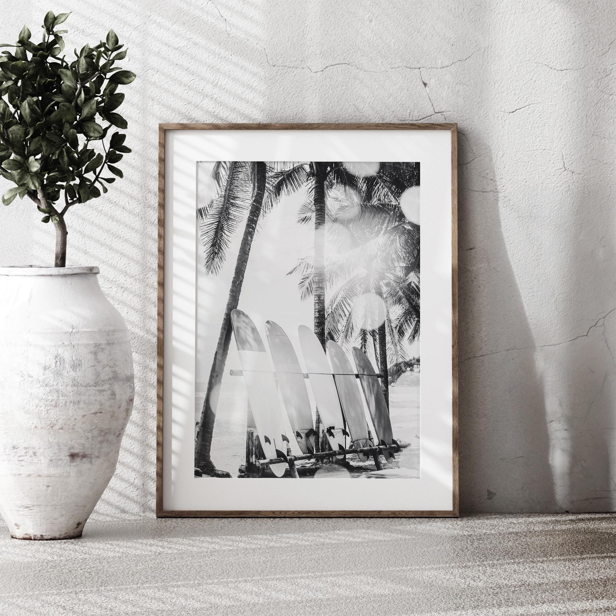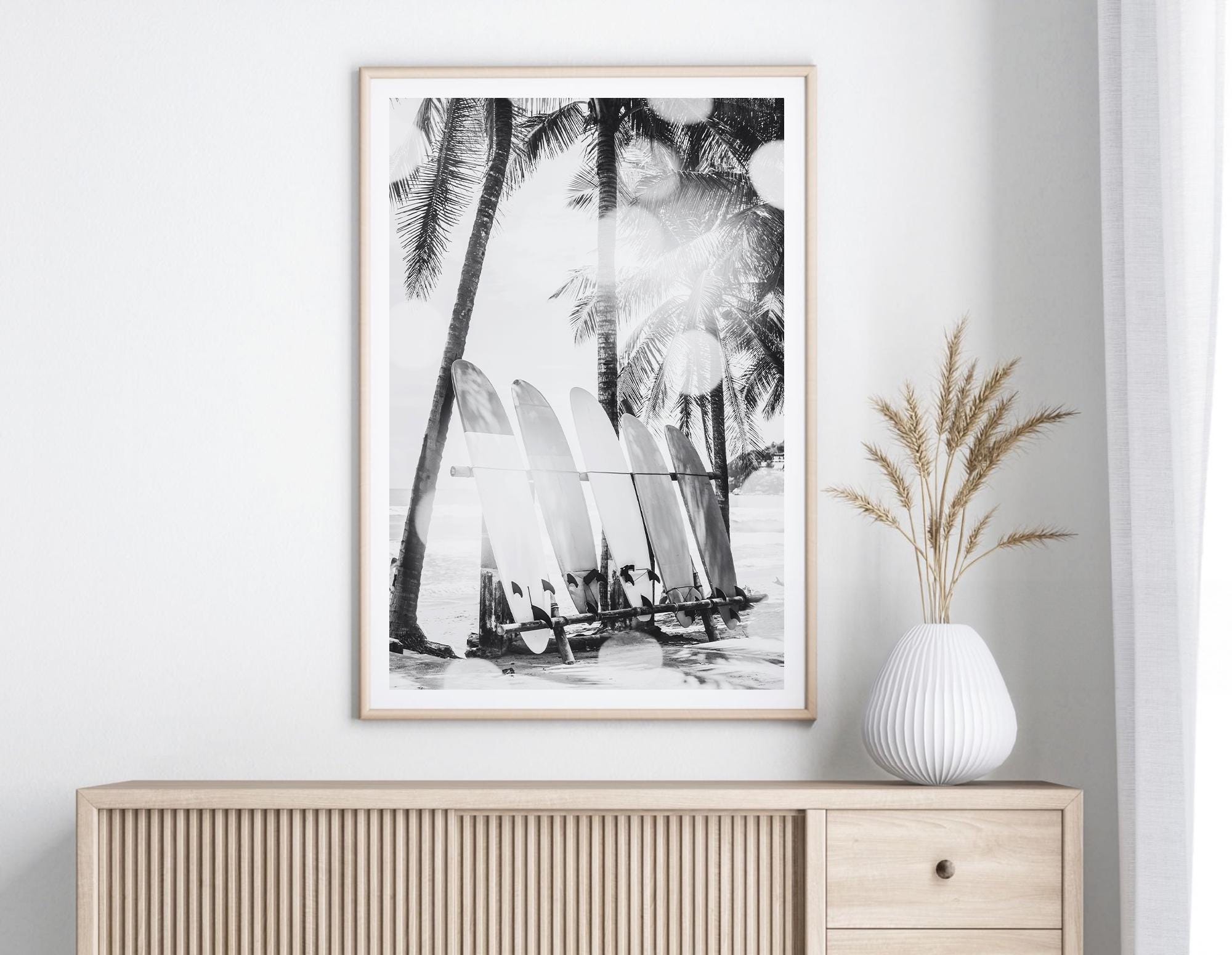 Add a coastal touch to your home with this stunning black and white wall art featuring surfboards leaning against palm trees. A perfect piece for beach house decor or surf lovers, this vintage-inspired print brings the laid-back summer vibes right to your walls.