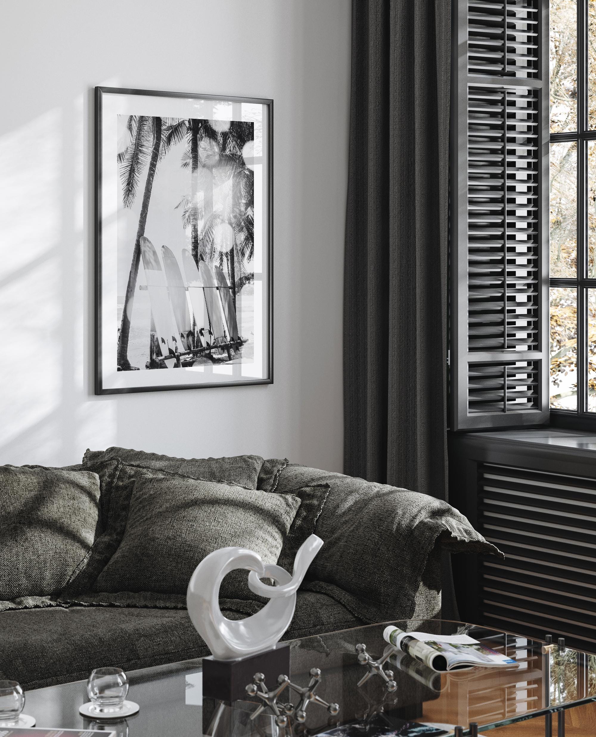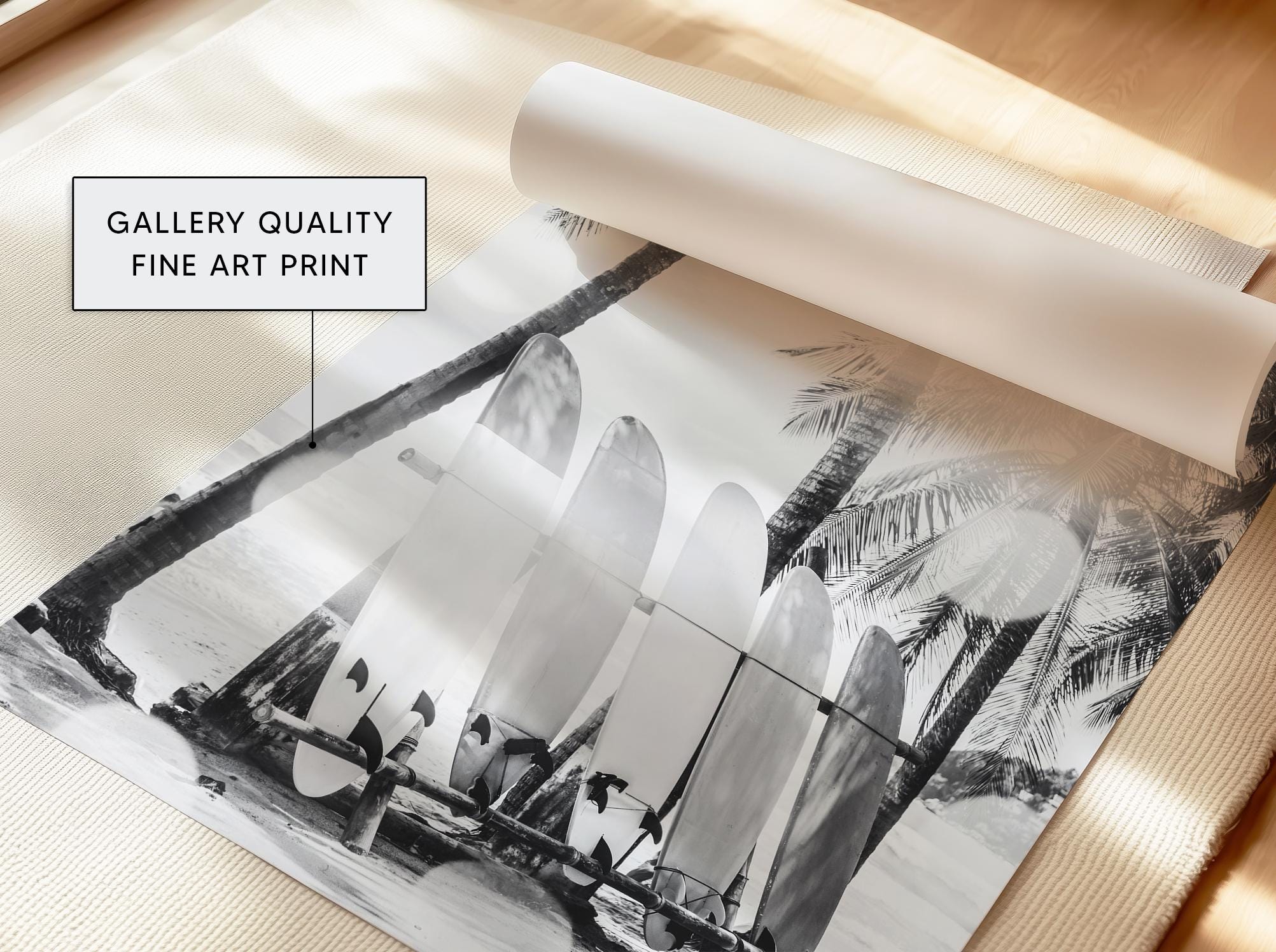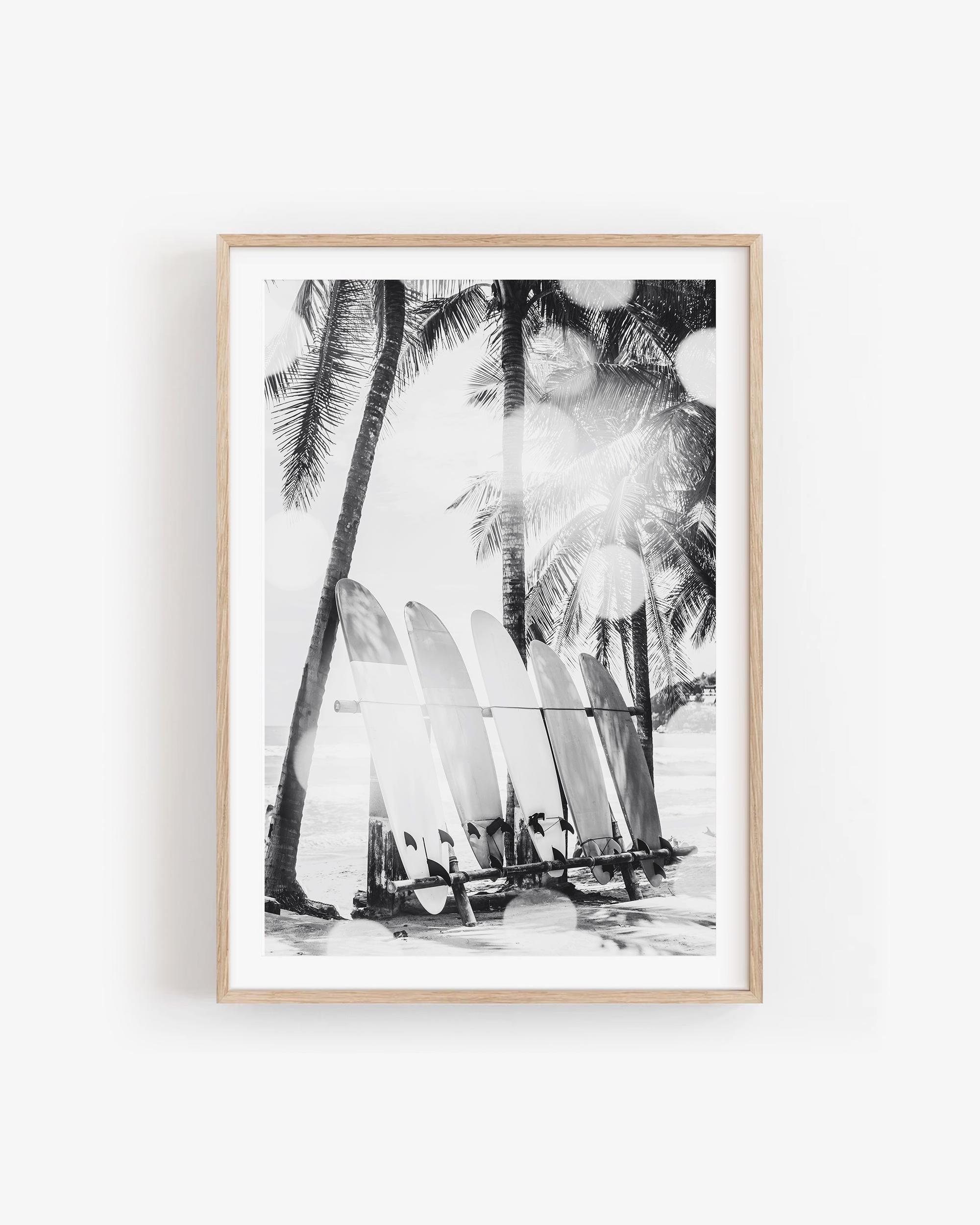 Add a coastal touch to your home with this stunning black and white wall art featuring surfboards leaning against palm trees. A perfect piece for beach house decor or surf lovers, this vintage-inspired print brings the laid-back summer vibes right to your walls.