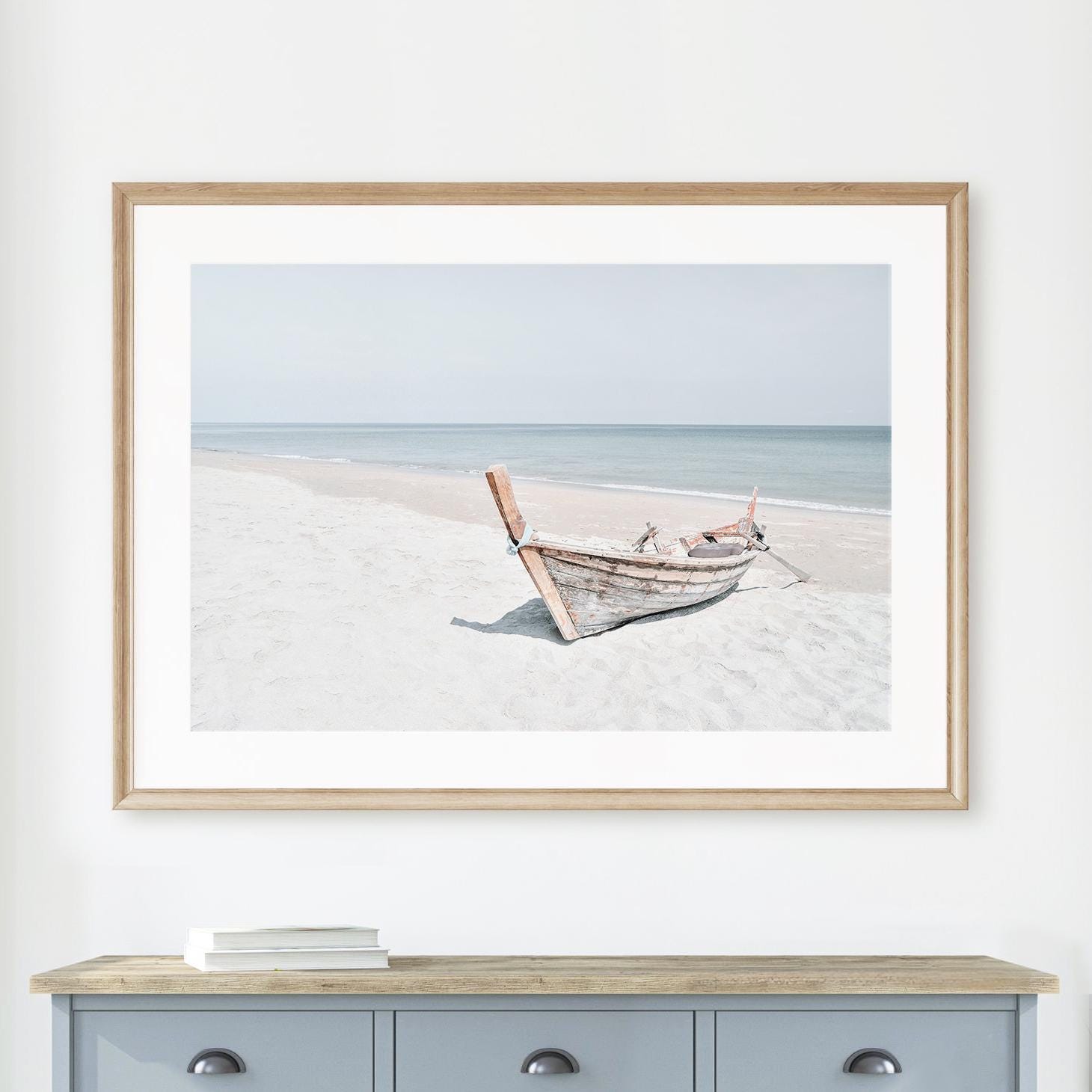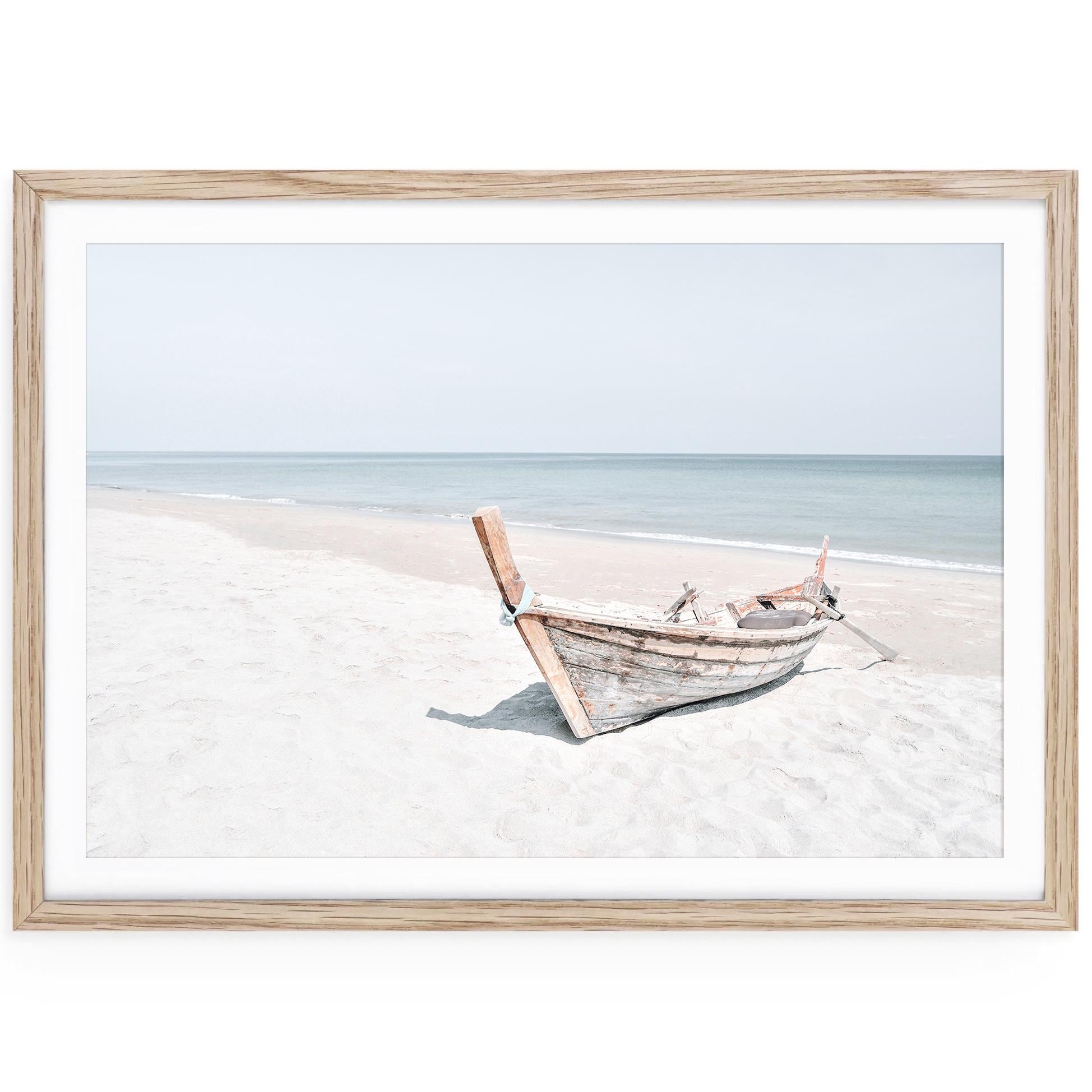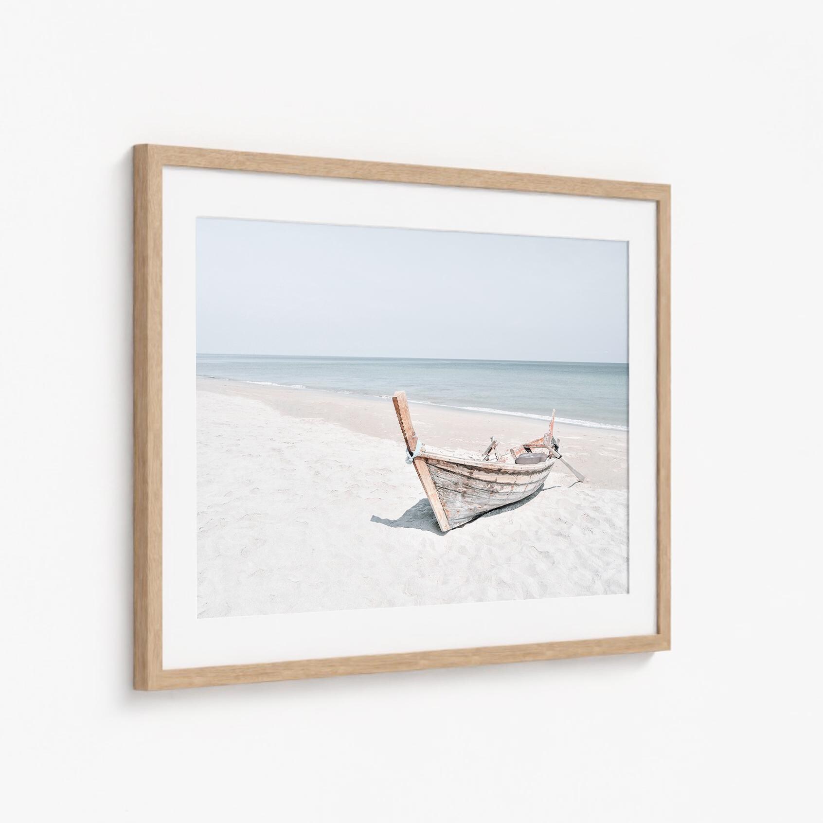 Coastal Boat Print, Minimalist Beach Fine Art, Framed or Unframed Large Horizontal Wall Decor
