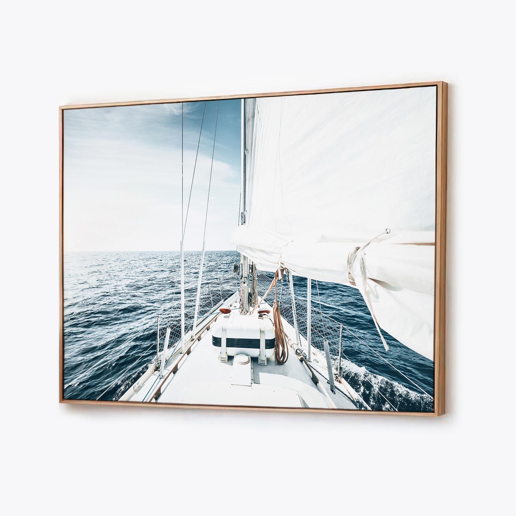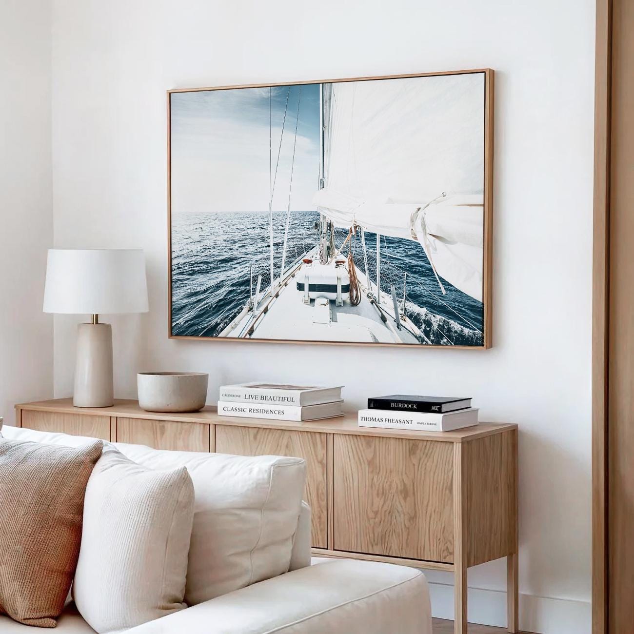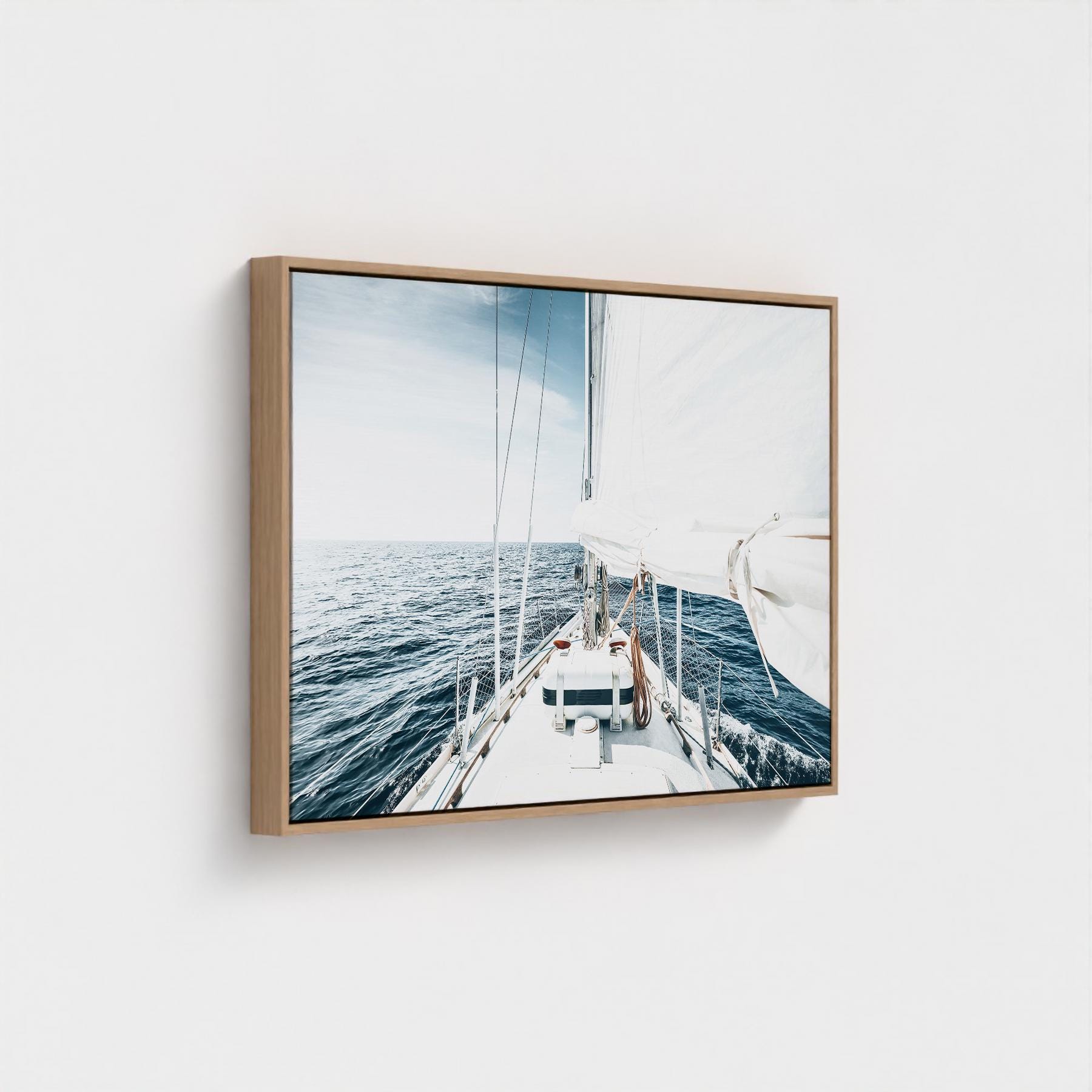 Bring the freedom of the open sea into your home with this sailing yacht canvas wall art. Perfect for modern coastal spaces, this framed ocean wall art captures the quiet elegance of nautical life instantly creating a calming, elevated atmosphere in any room. Giclee printed on premium 38mm stretched canvas, elegantly set within a classic floating frame. The thin wooden frame sitting 5mm from the canvas edge, creates a striking floating effect.