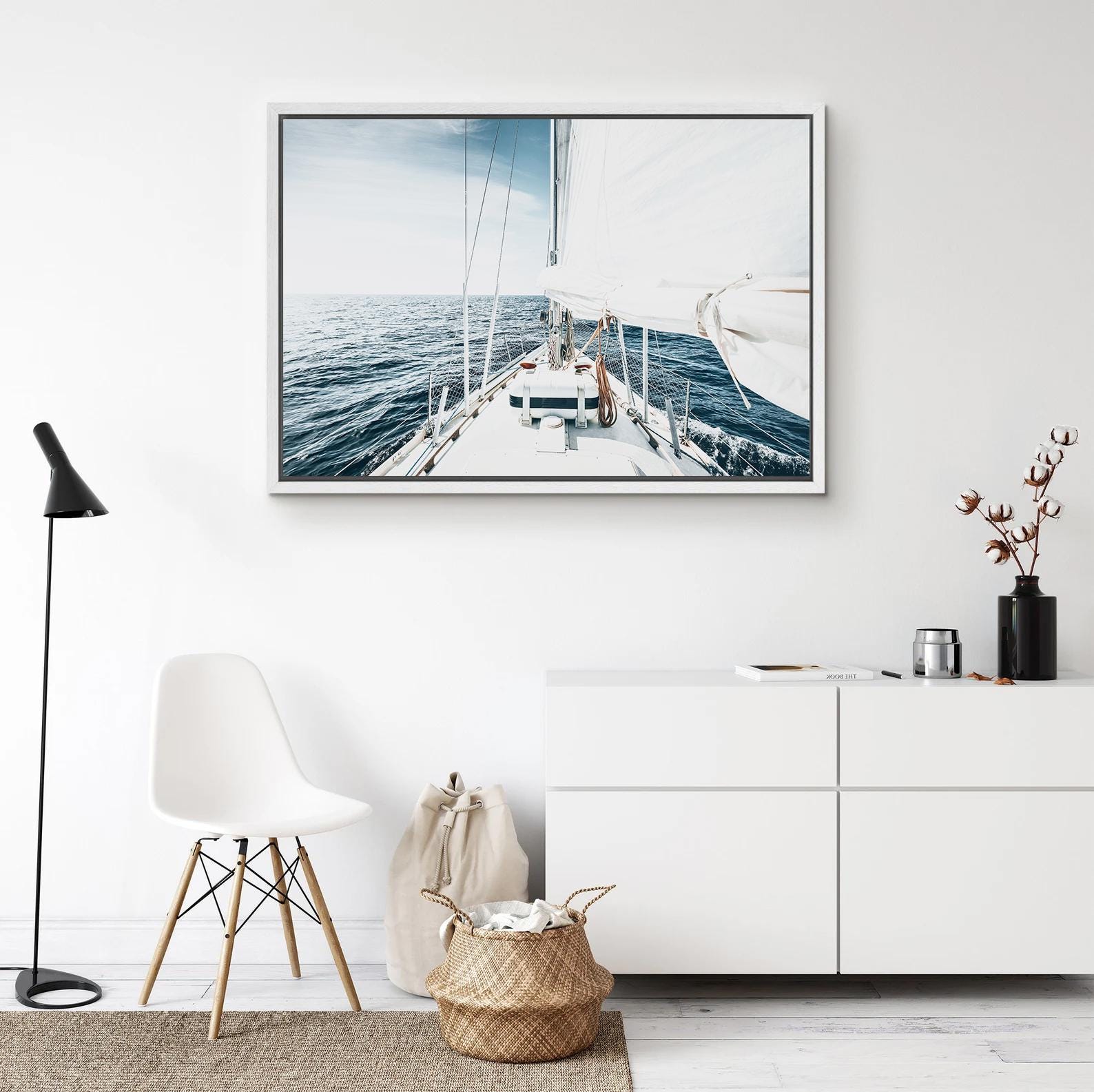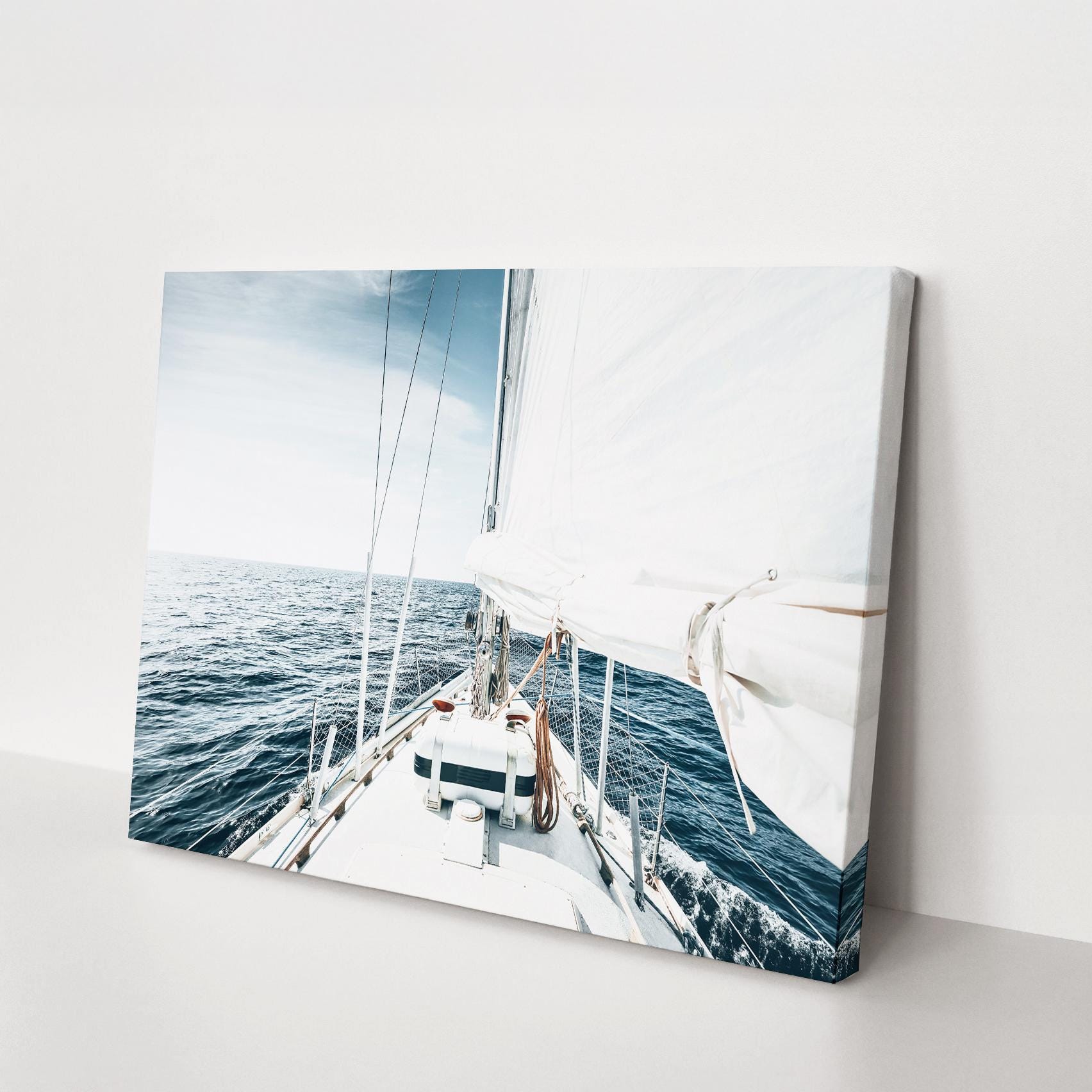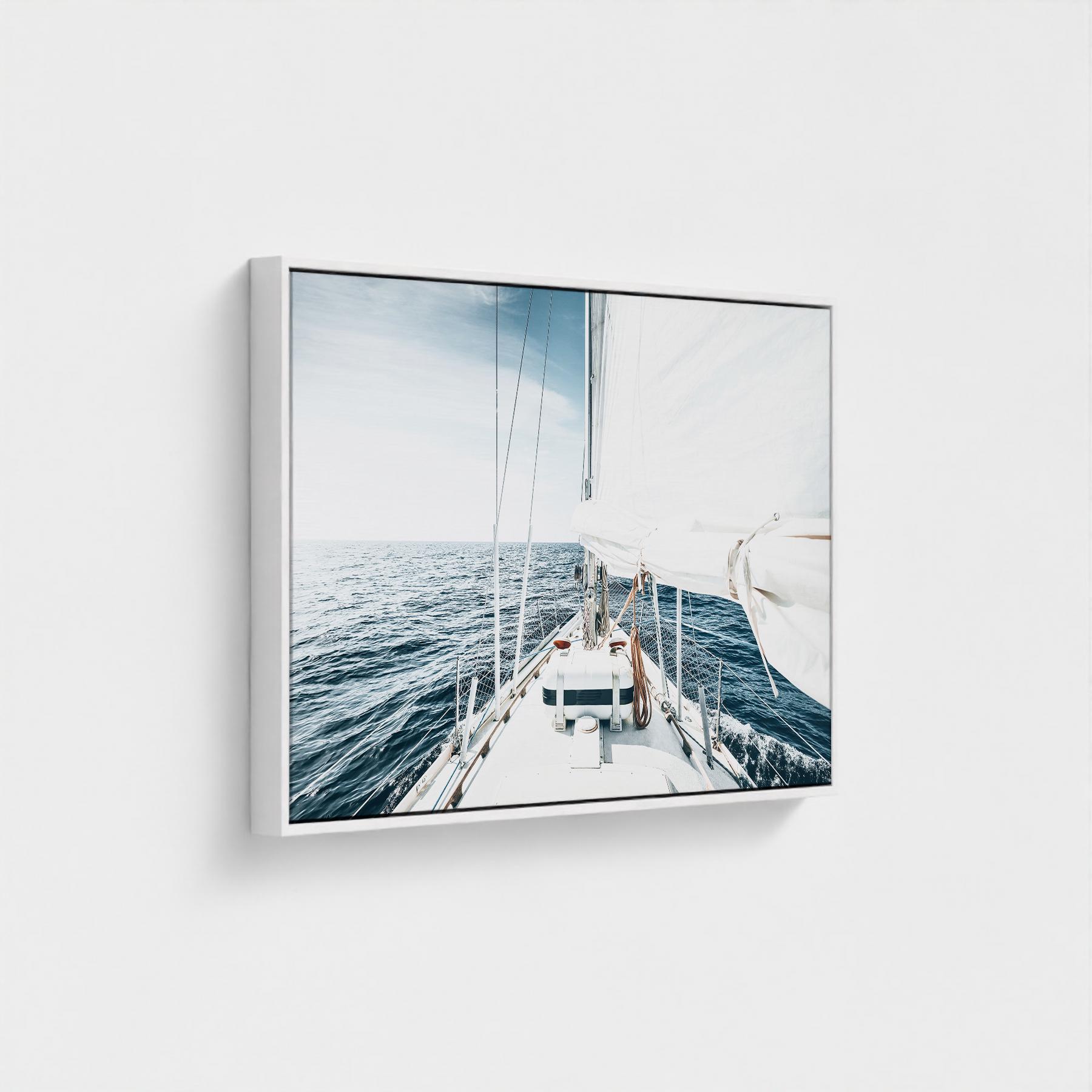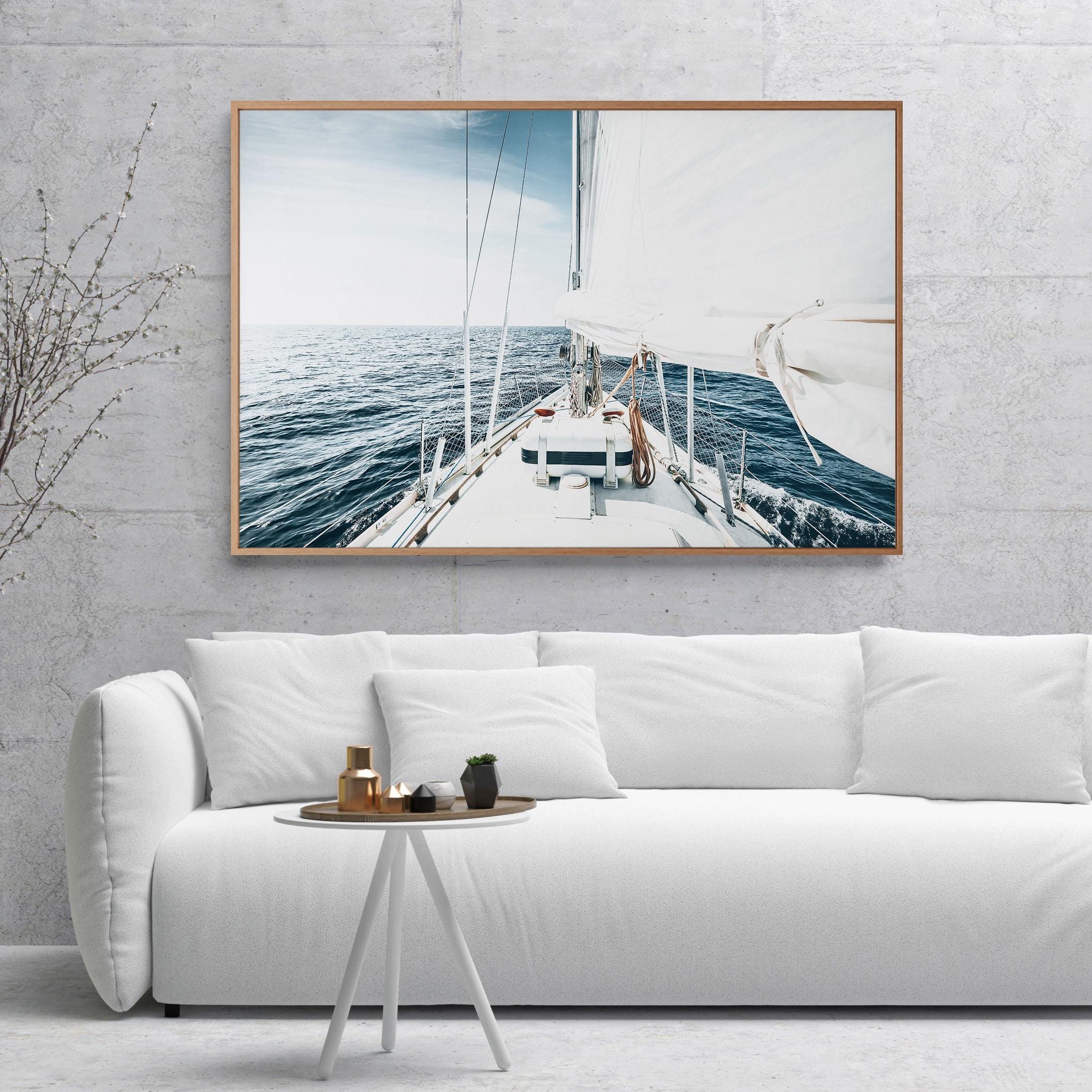 Bring the freedom of the open sea into your home with this sailing yacht canvas wall art. Perfect for modern coastal spaces, this framed ocean wall art captures the quiet elegance of nautical life instantly creating a calming, elevated atmosphere in any room. Giclee printed on premium 38mm stretched canvas, elegantly set within a classic floating frame. The thin wooden frame sitting 5mm from the canvas edge, creates a striking floating effect.