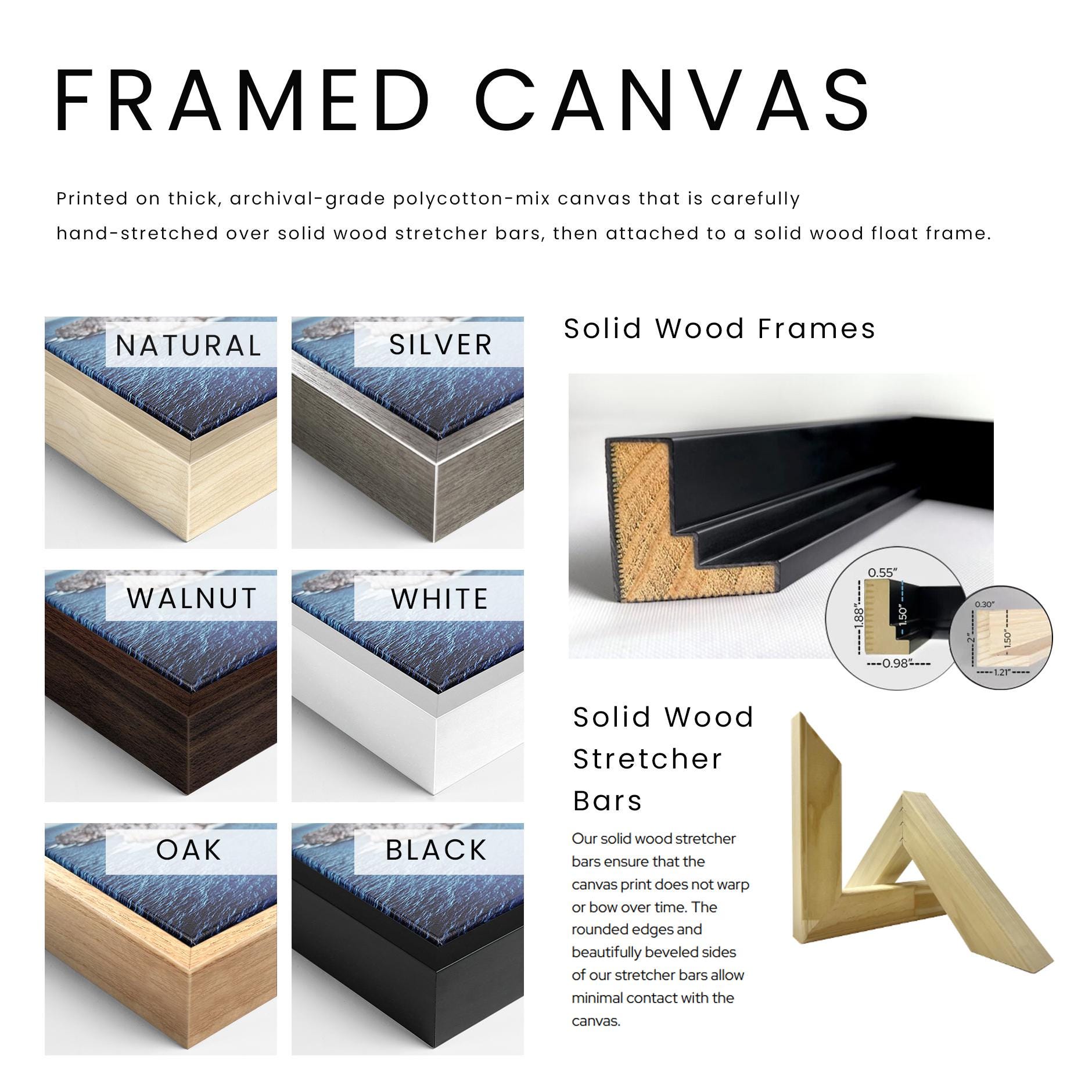 • Framed canvas are crafted from sustainably sourced wood. A thin, frame sits 5mm from the canvas edge, creating a floating effect.