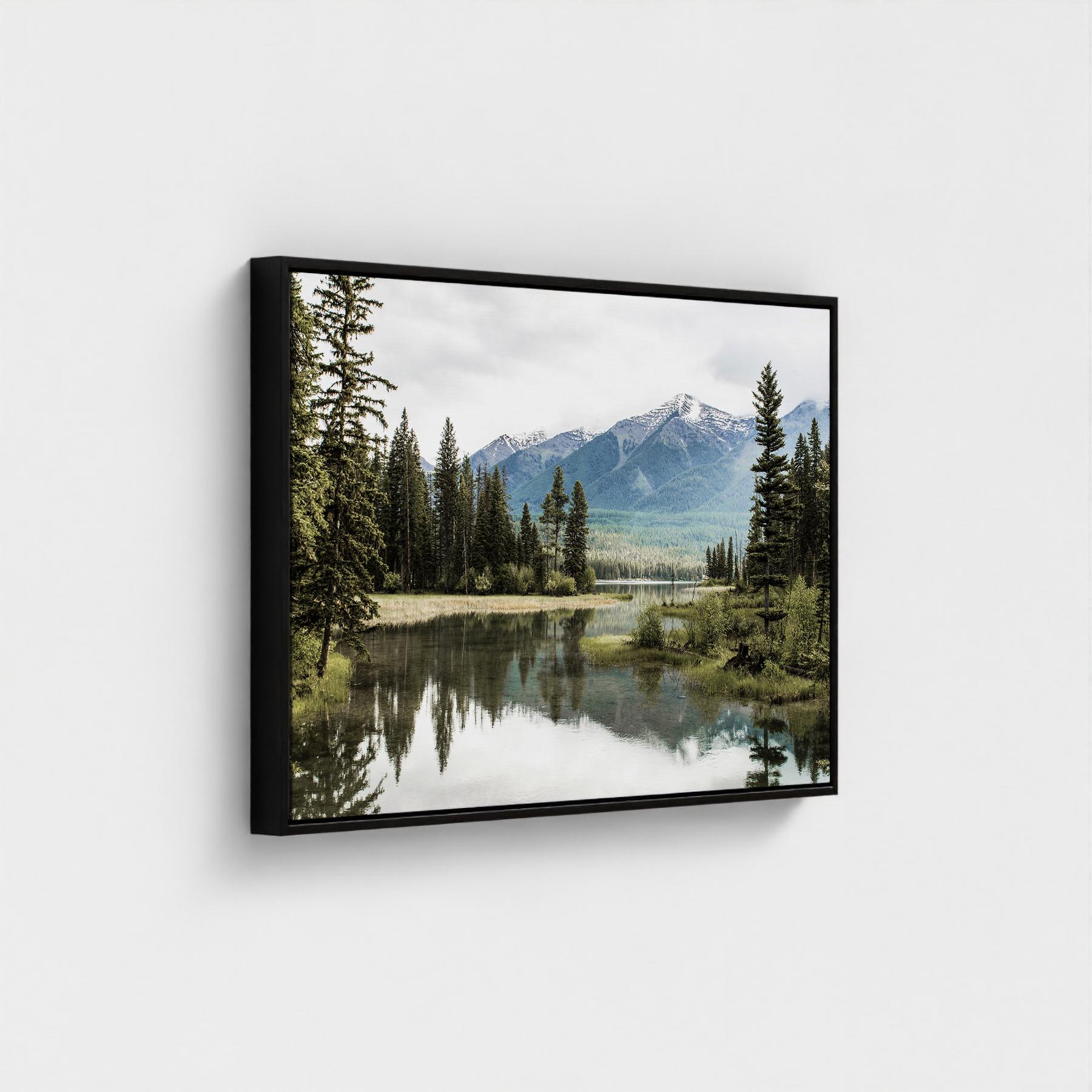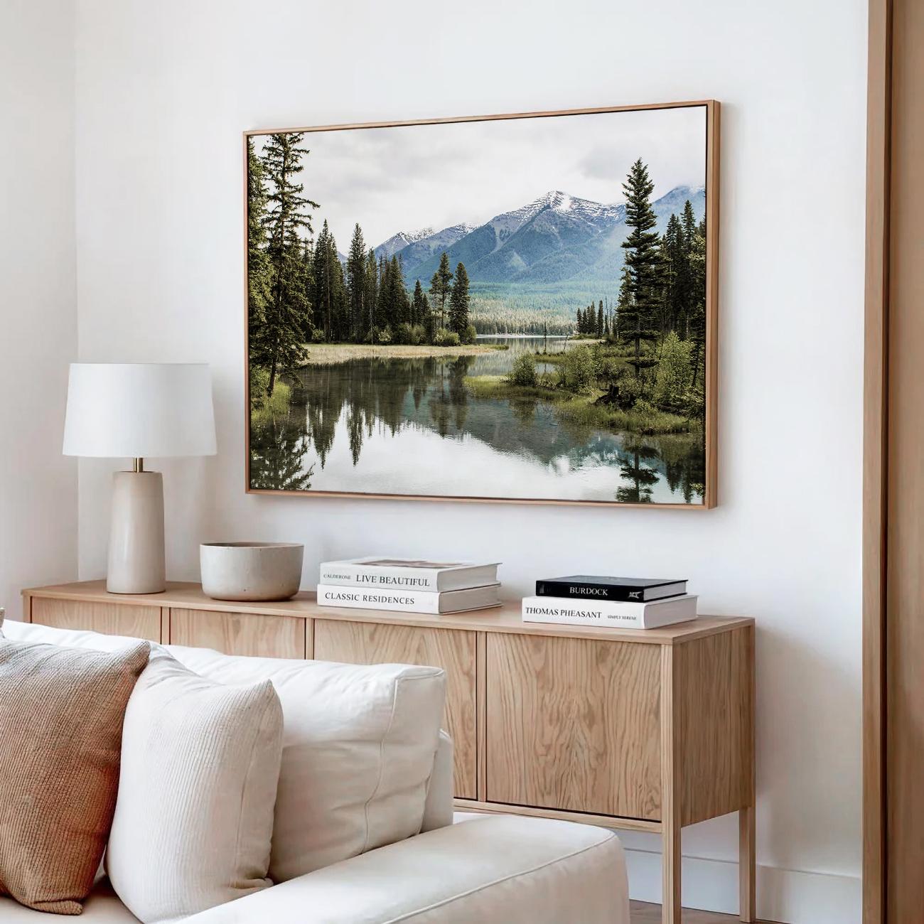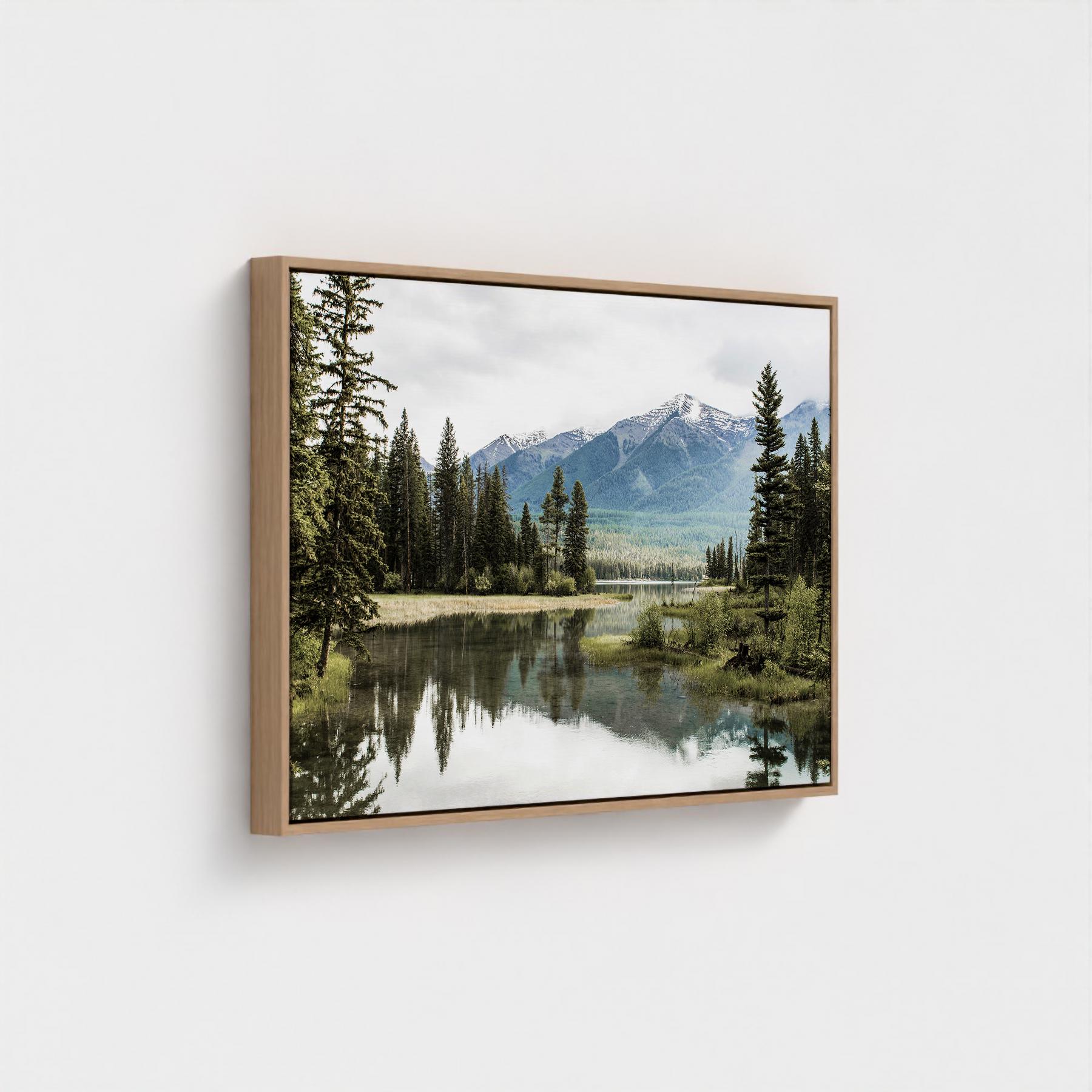 Fine art print featuring a peaceful mountain lake surrounded by gentle peaks and still water in soft, natural tones. This calming landscape brings a sense of balance and reflection into your home, offering a soothing atmosphere ideal for quiet living spaces. Giclee printed on premium 38mm stretched canvas, elegantly set within a classic floating frame. The thin wooden frame sitting 5mm from the canvas edge, creates a striking floating effect.