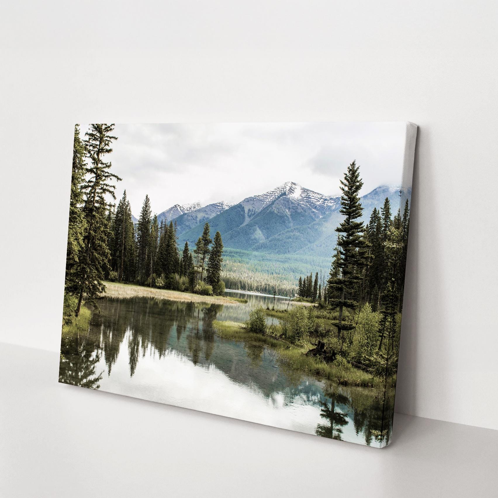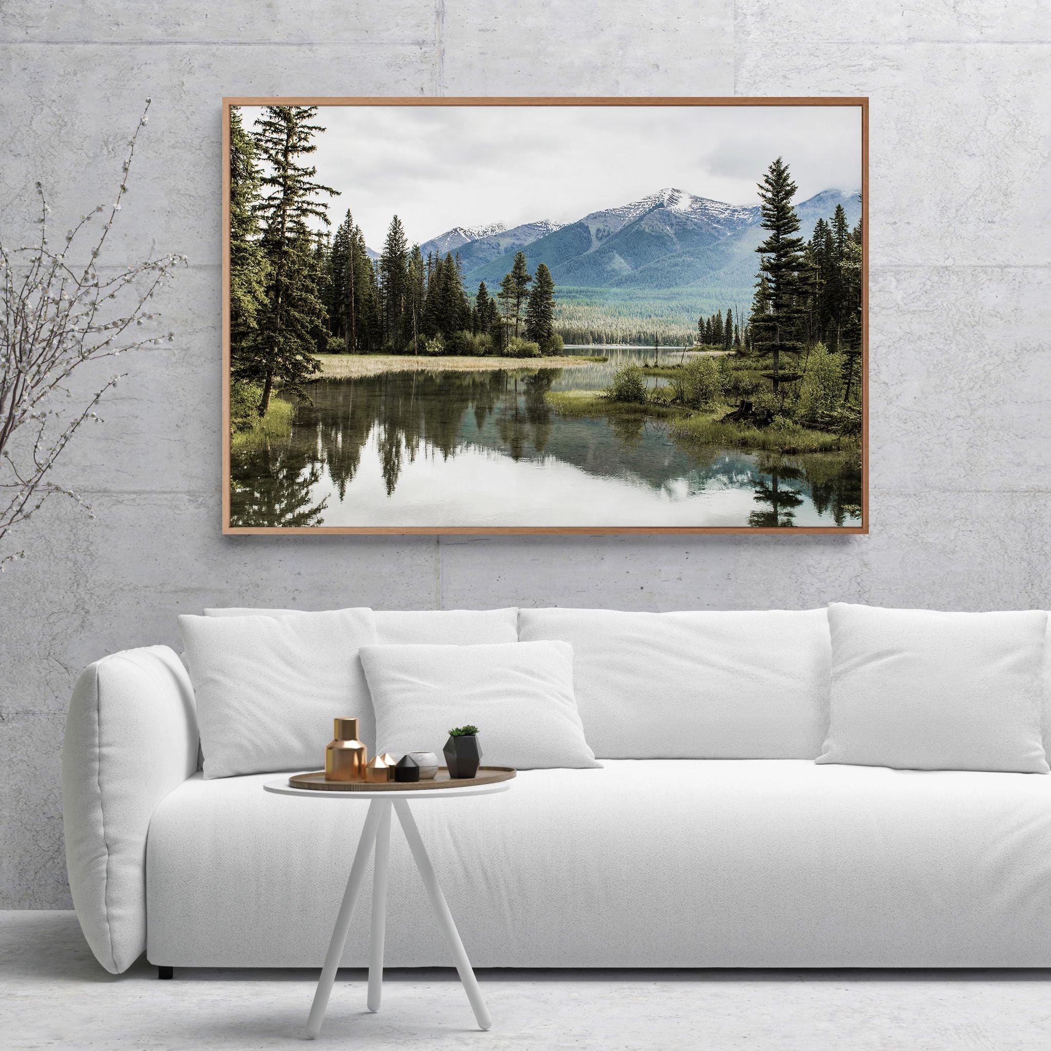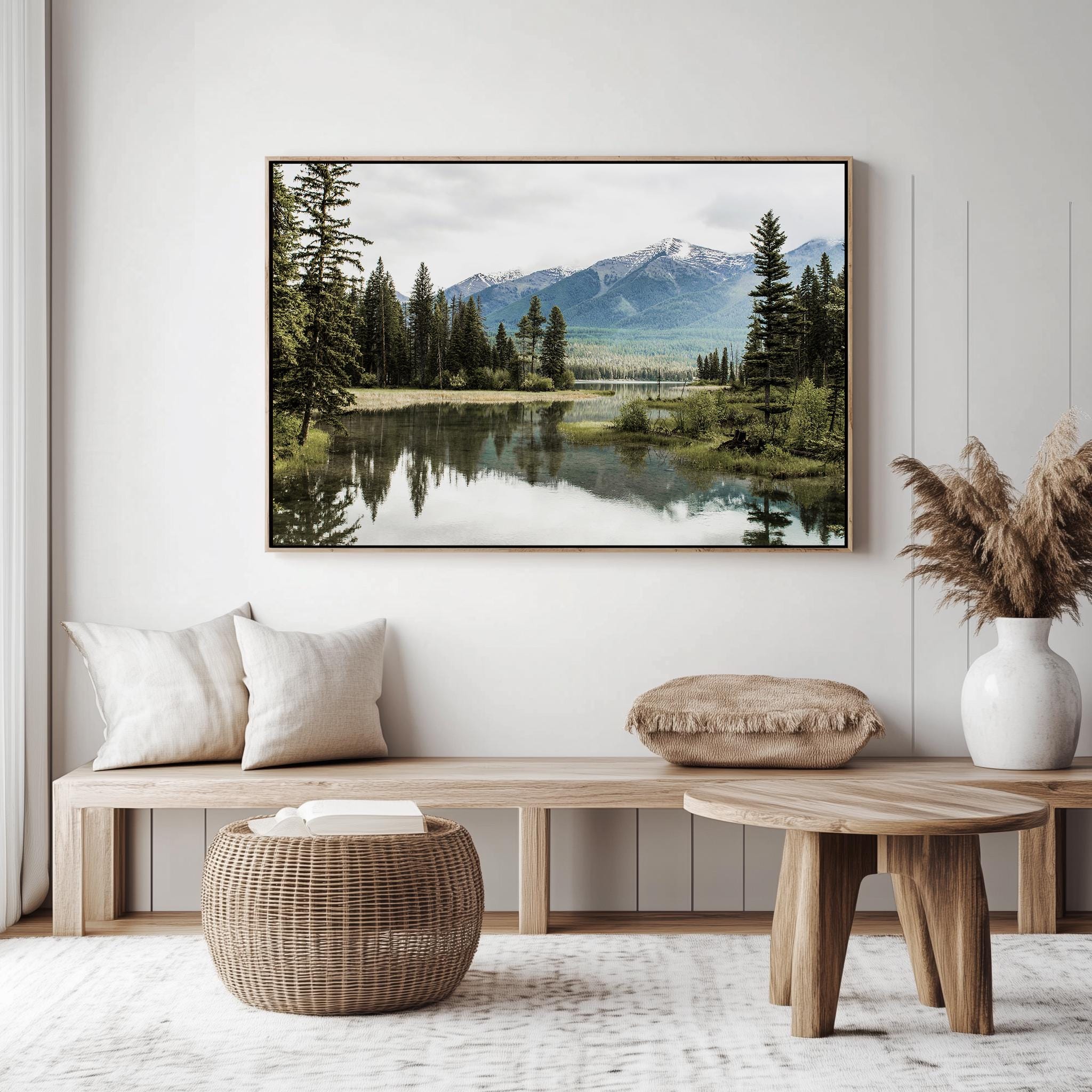 Fine art print featuring a peaceful mountain lake surrounded by gentle peaks and still water in soft, natural tones. This calming landscape brings a sense of balance and reflection into your home, offering a soothing atmosphere ideal for quiet living spaces. Giclee printed on premium 38mm stretched canvas, elegantly set within a classic floating frame. The thin wooden frame sitting 5mm from the canvas edge, creates a striking floating effect.