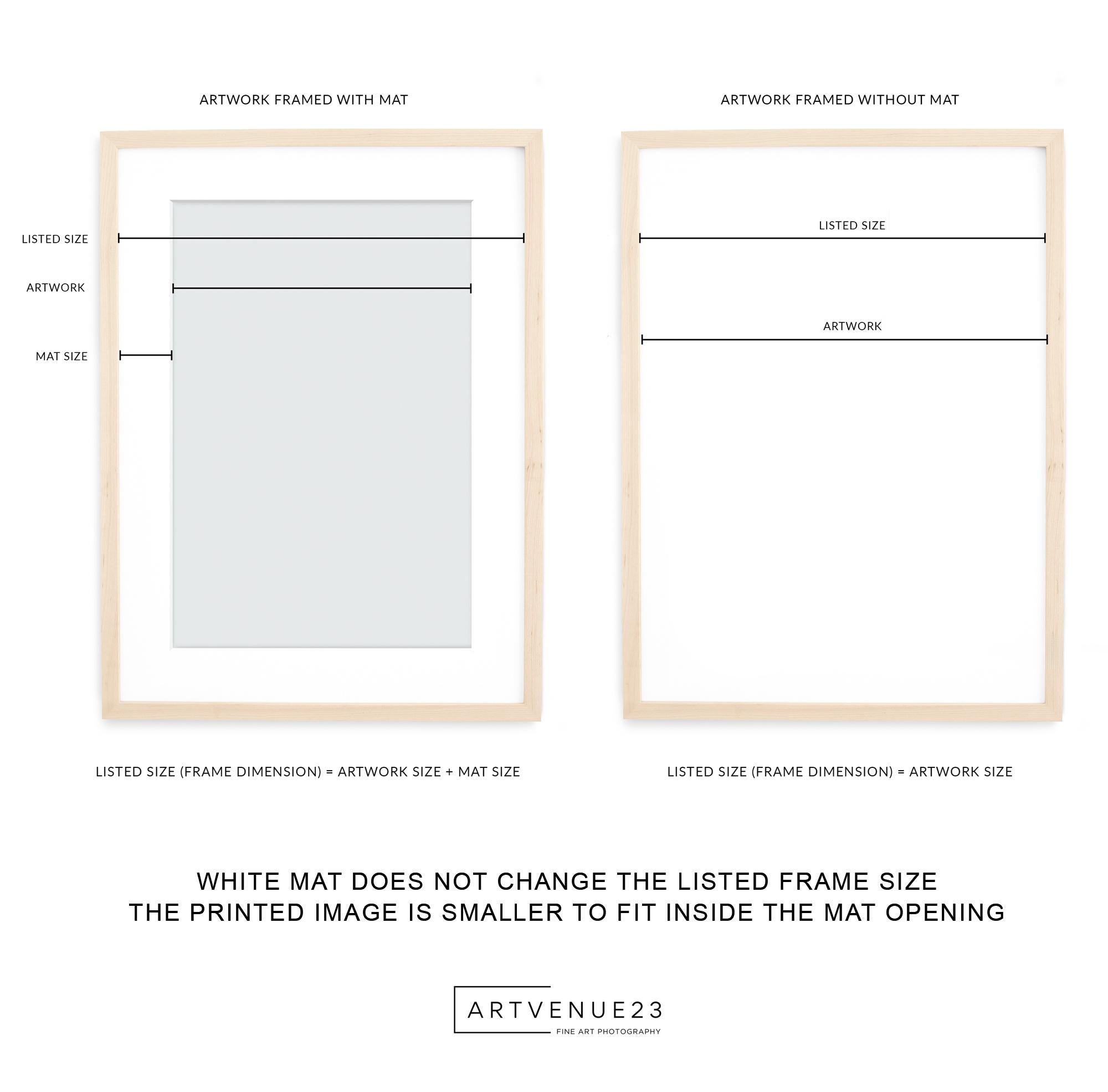 • Sizes listed refer to the artwork itself. When selecting the matted option, the frame size remains the same, while the visible artwork area becomes slightly smaller.