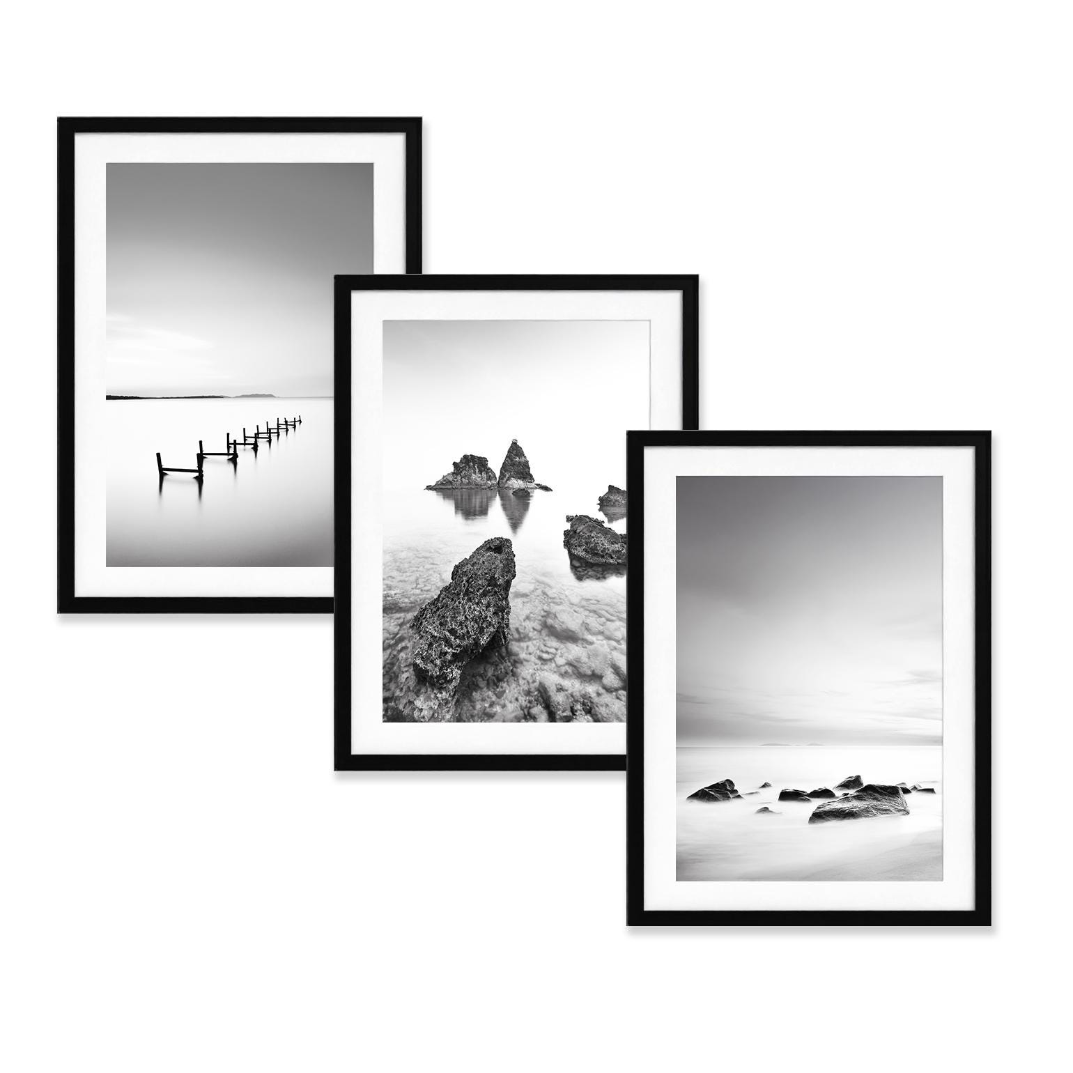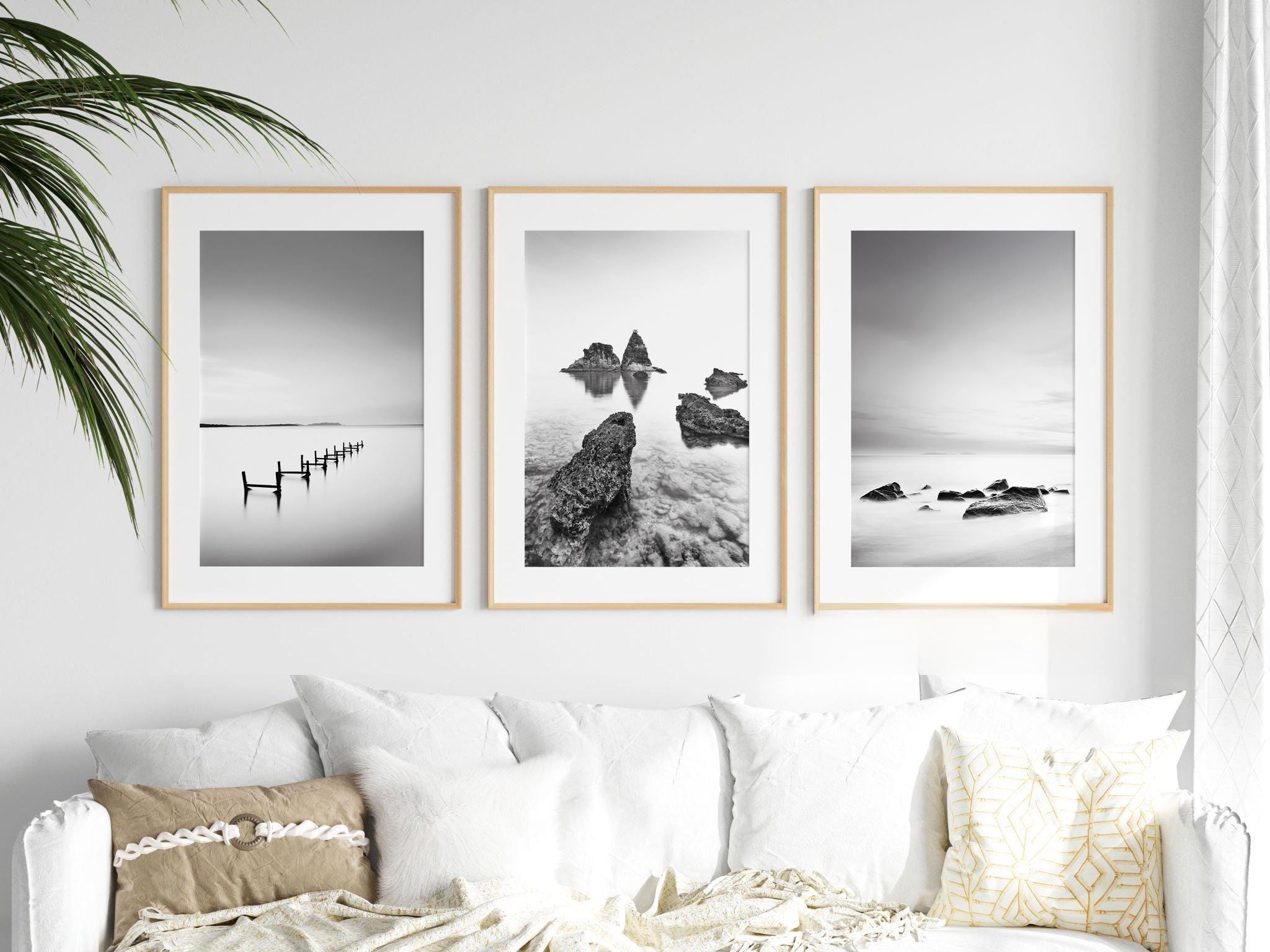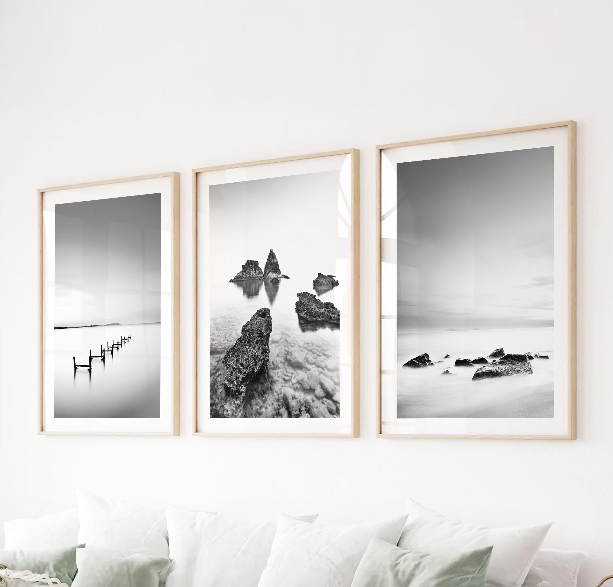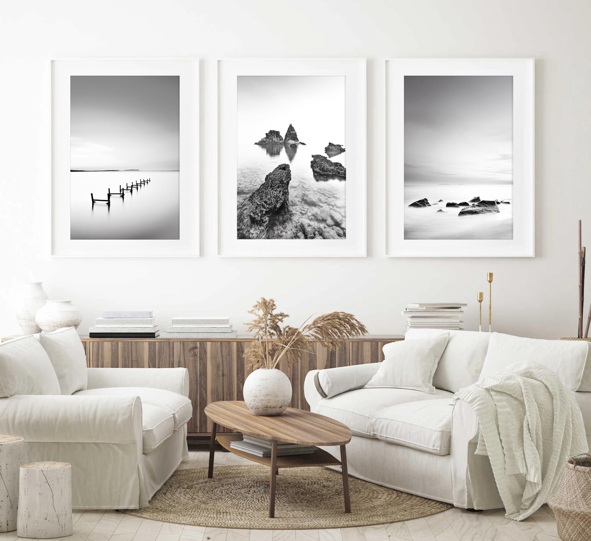 Fine art photography print set featuring three minimalist long exposure coastal scenes in black and white, with smooth water and serene horizons. This modern collection adds a tranquil coastal feel and timeless elegance to contemporary interiors.