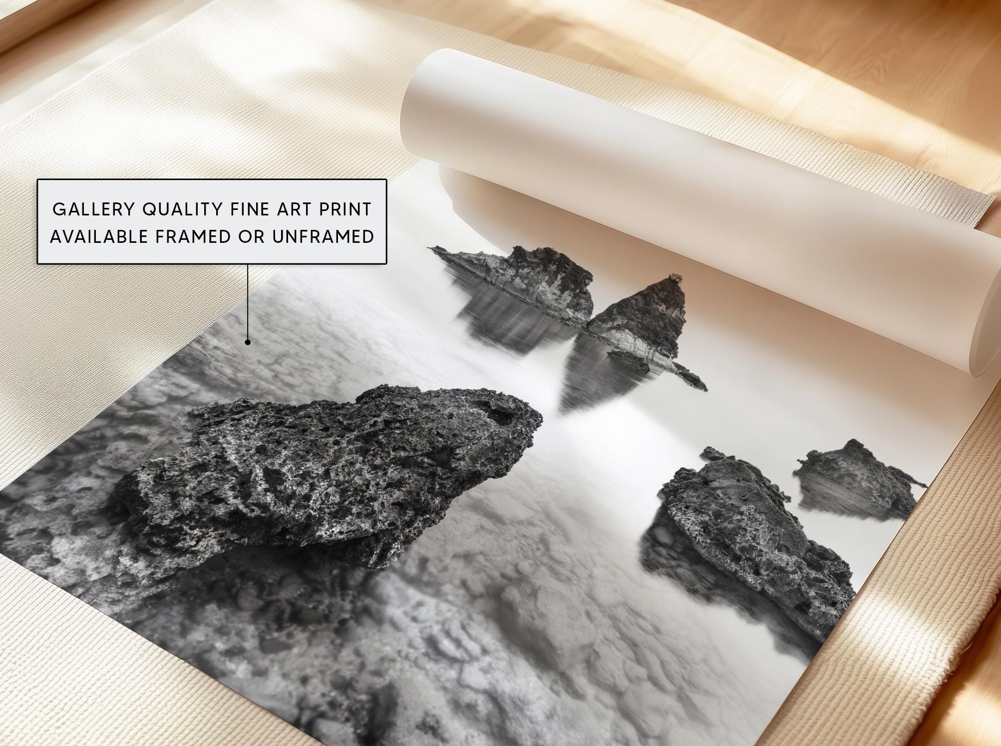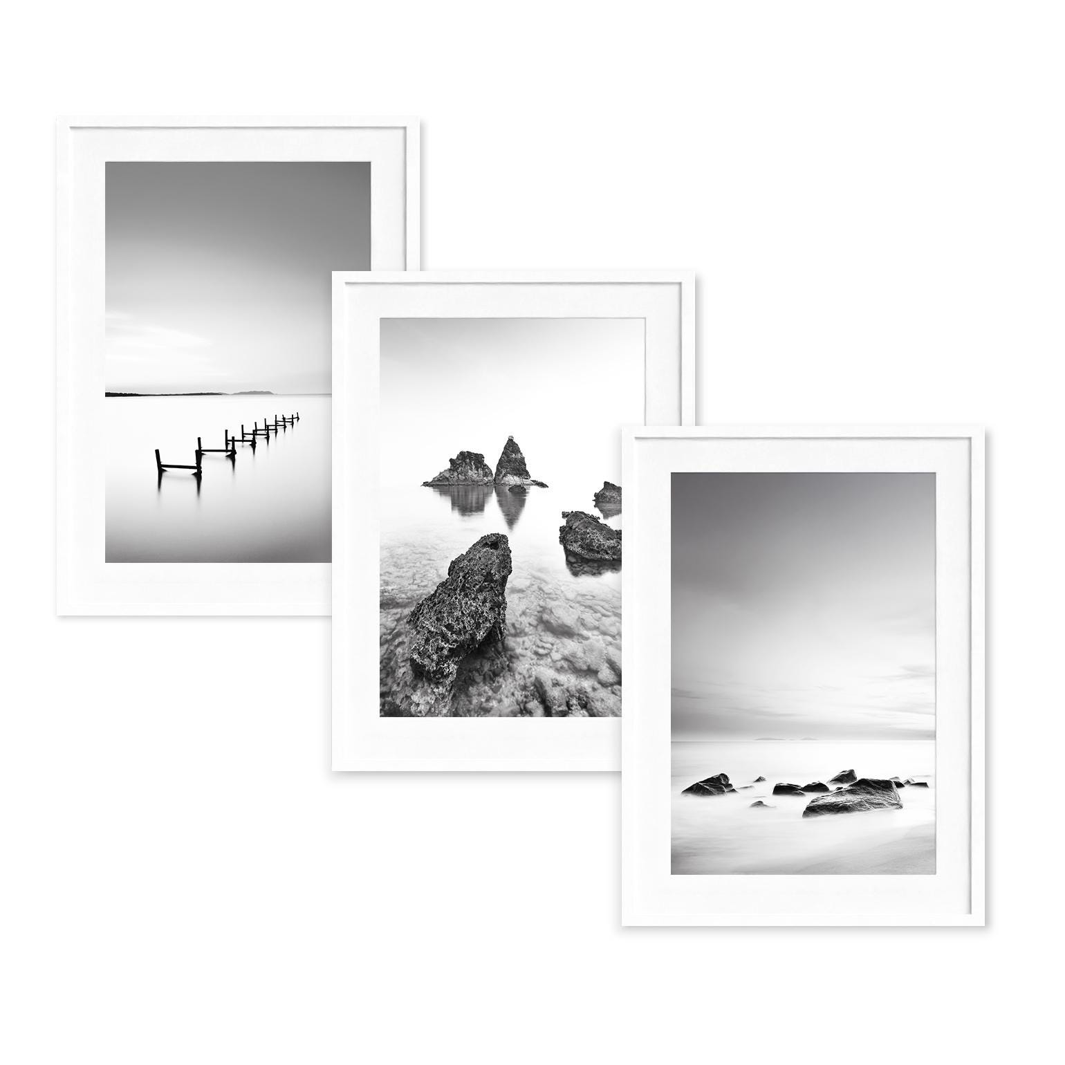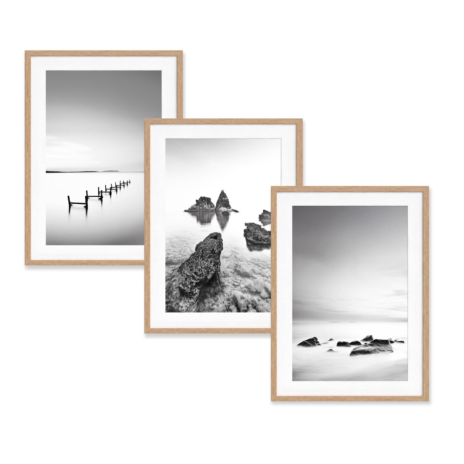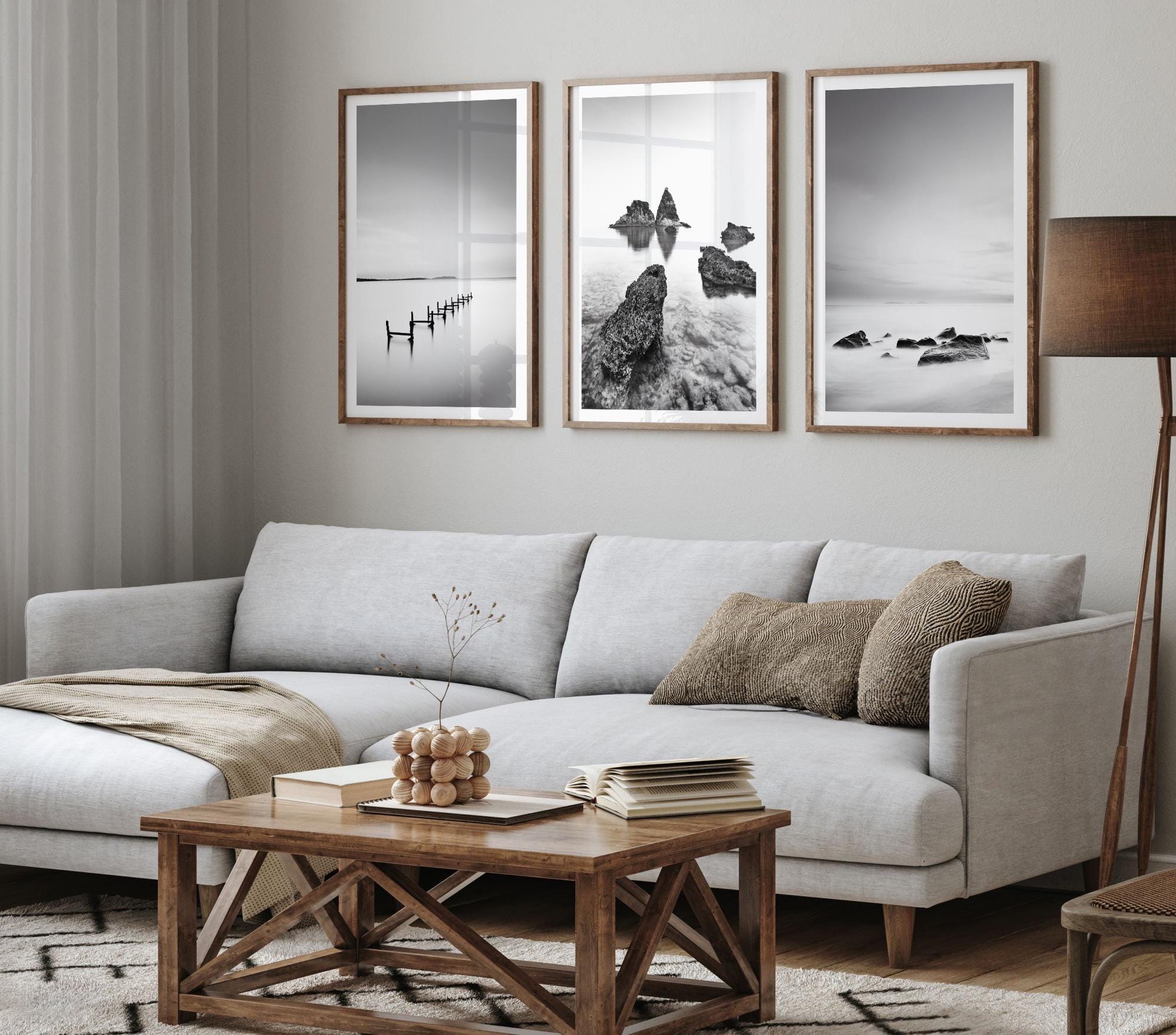 Fine art photography print set featuring three minimalist long exposure coastal scenes in black and white, with smooth water and serene horizons. This modern collection adds a tranquil coastal feel and timeless elegance to contemporary interiors.