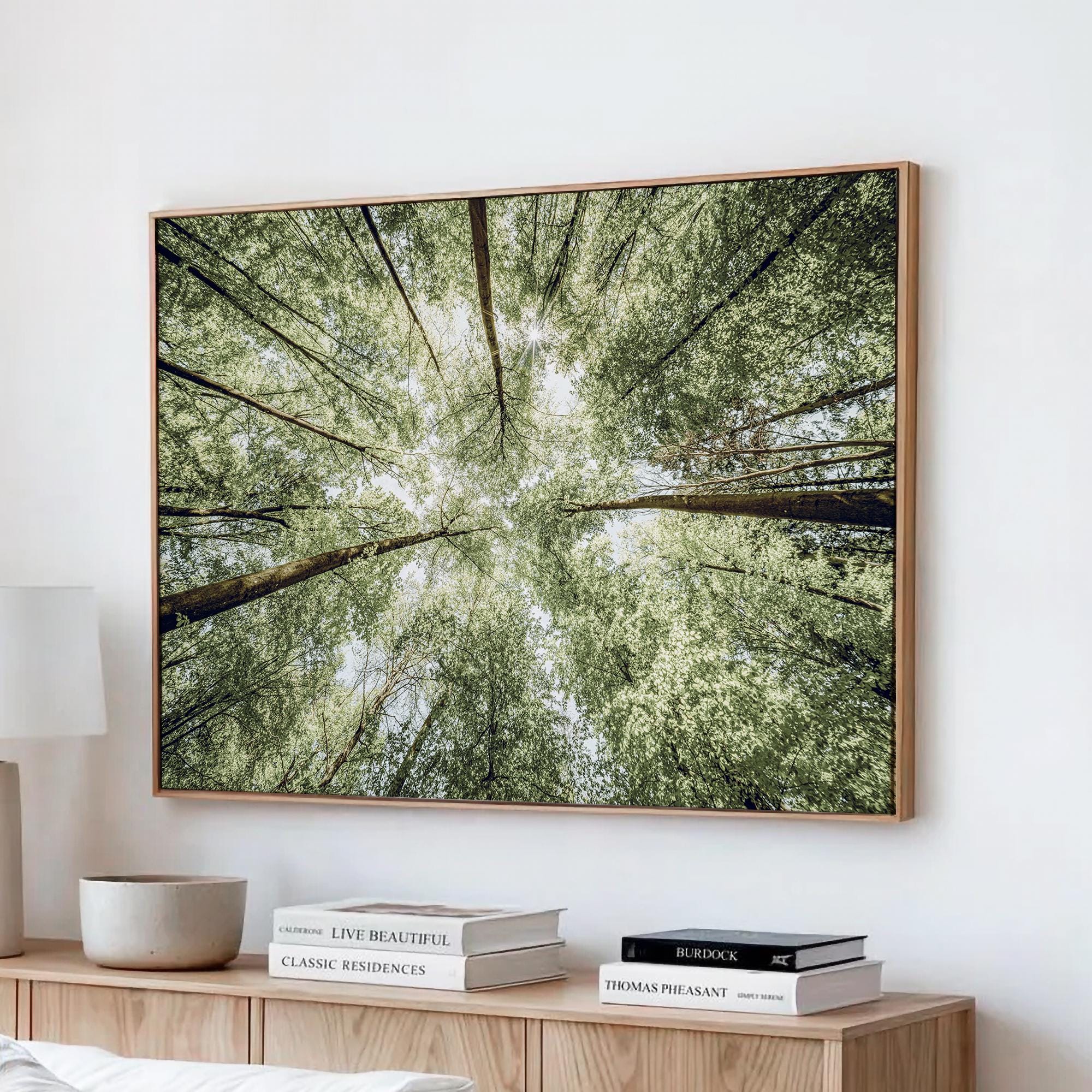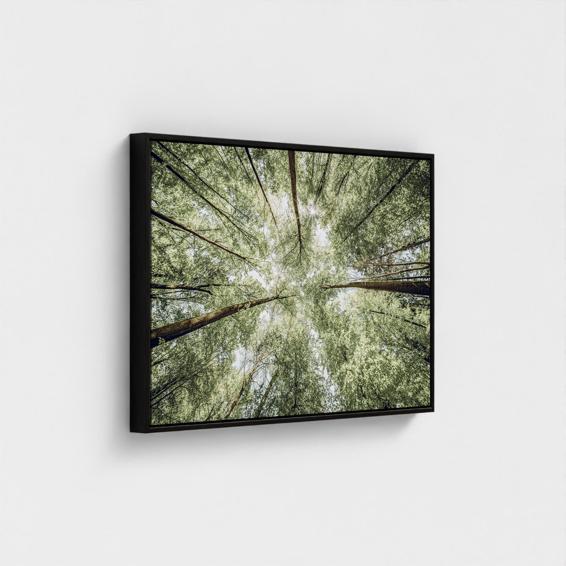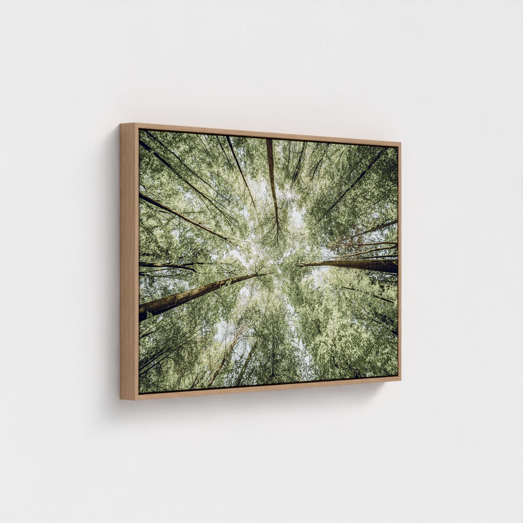Giclee printed on premium 38mm stretched canvas, elegantly set within a classic floating frame. The thin wooden frame sitting 5mm from the canvas edge, creates a striking floating effect. This peaceful woodland scene brings a grounding, natural accent to living rooms, bedrooms, or cozy cottage-style spaces.
