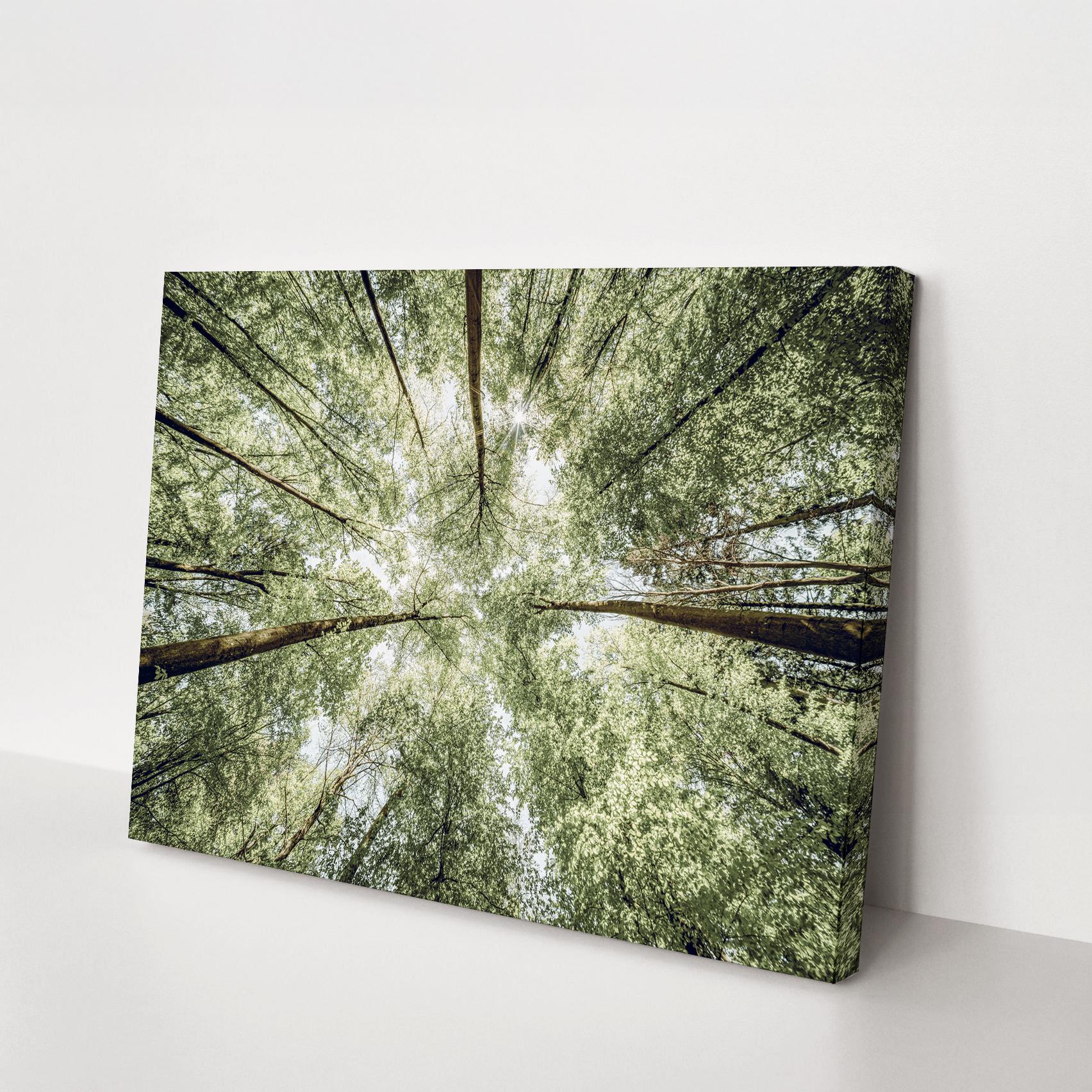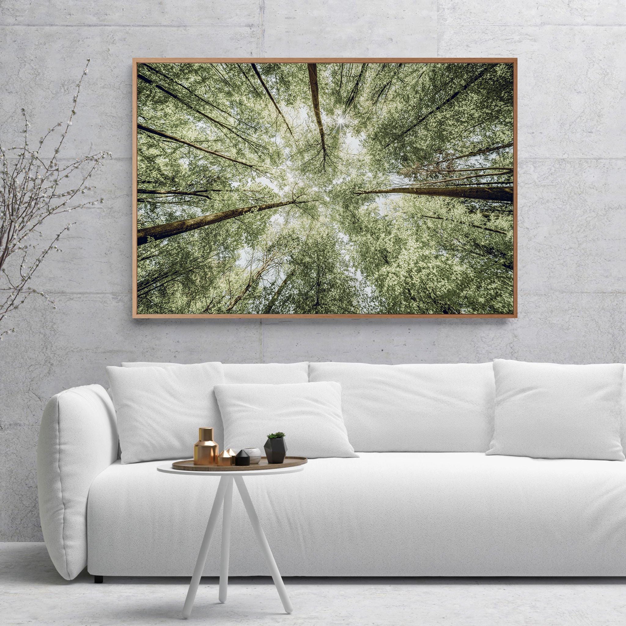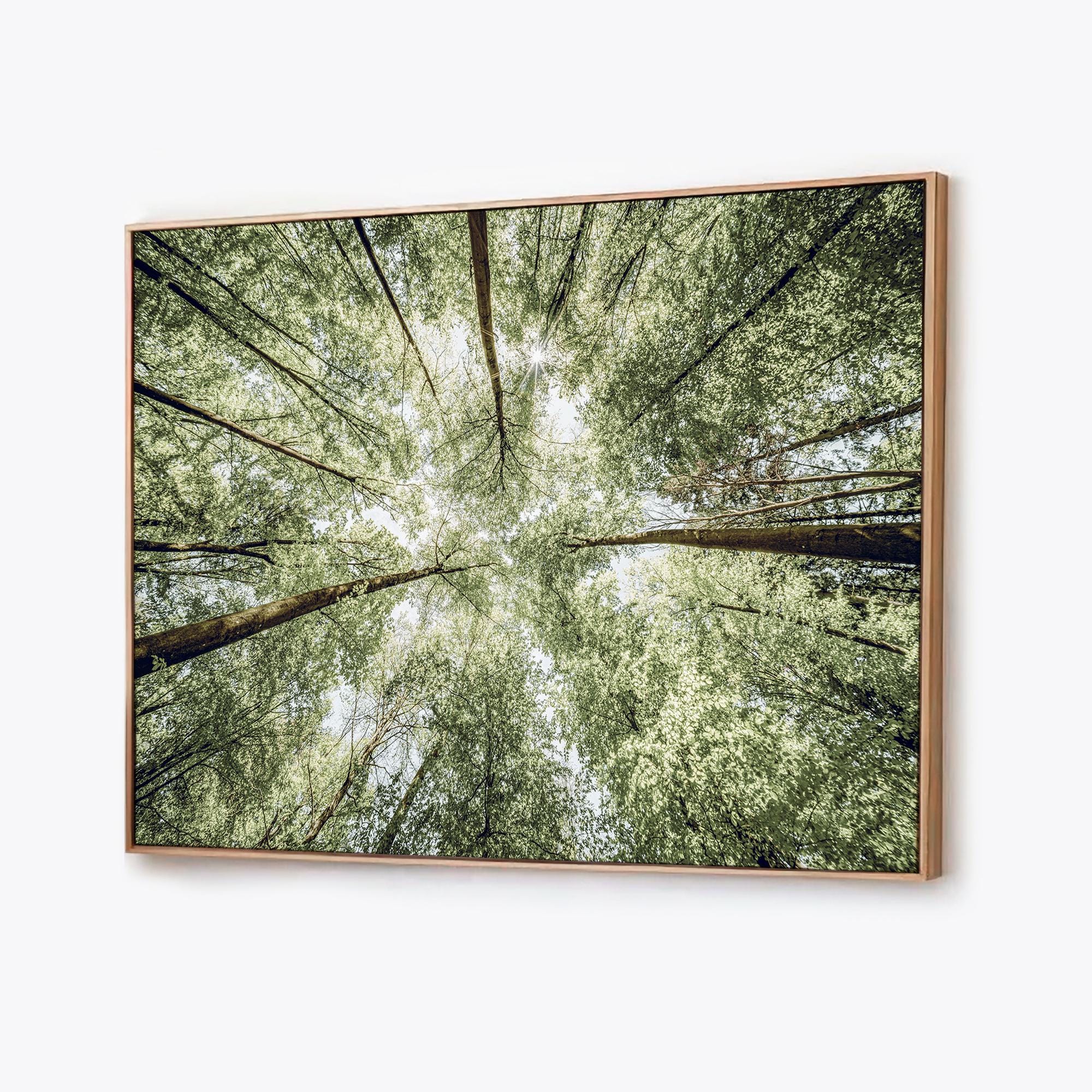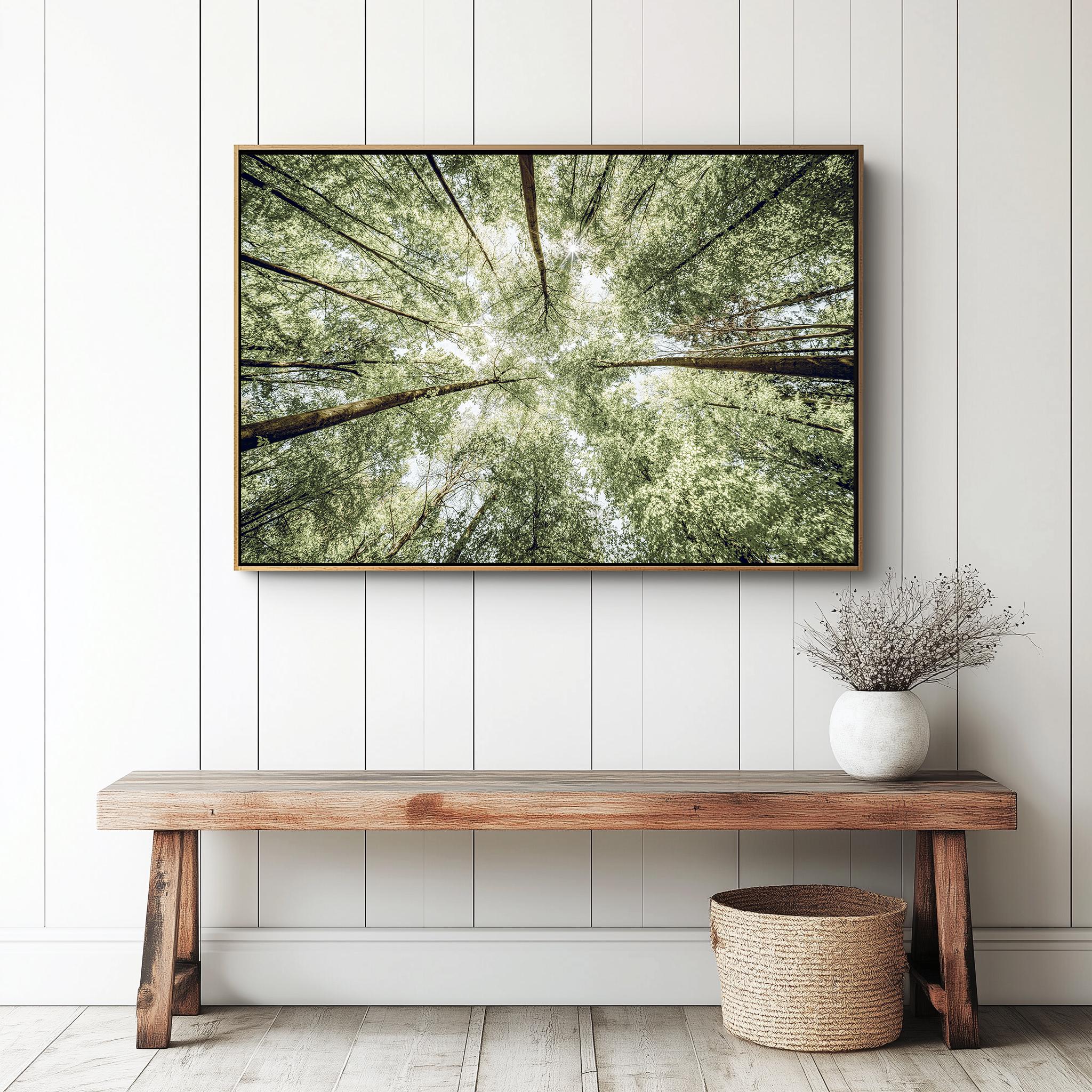 Giclee printed on premium 38mm stretched canvas, elegantly set within a classic floating frame. The thin wooden frame sitting 5mm from the canvas edge, creates a striking floating effect. This peaceful woodland scene brings a grounding, natural accent to living rooms, bedrooms, or cozy cottage-style spaces.