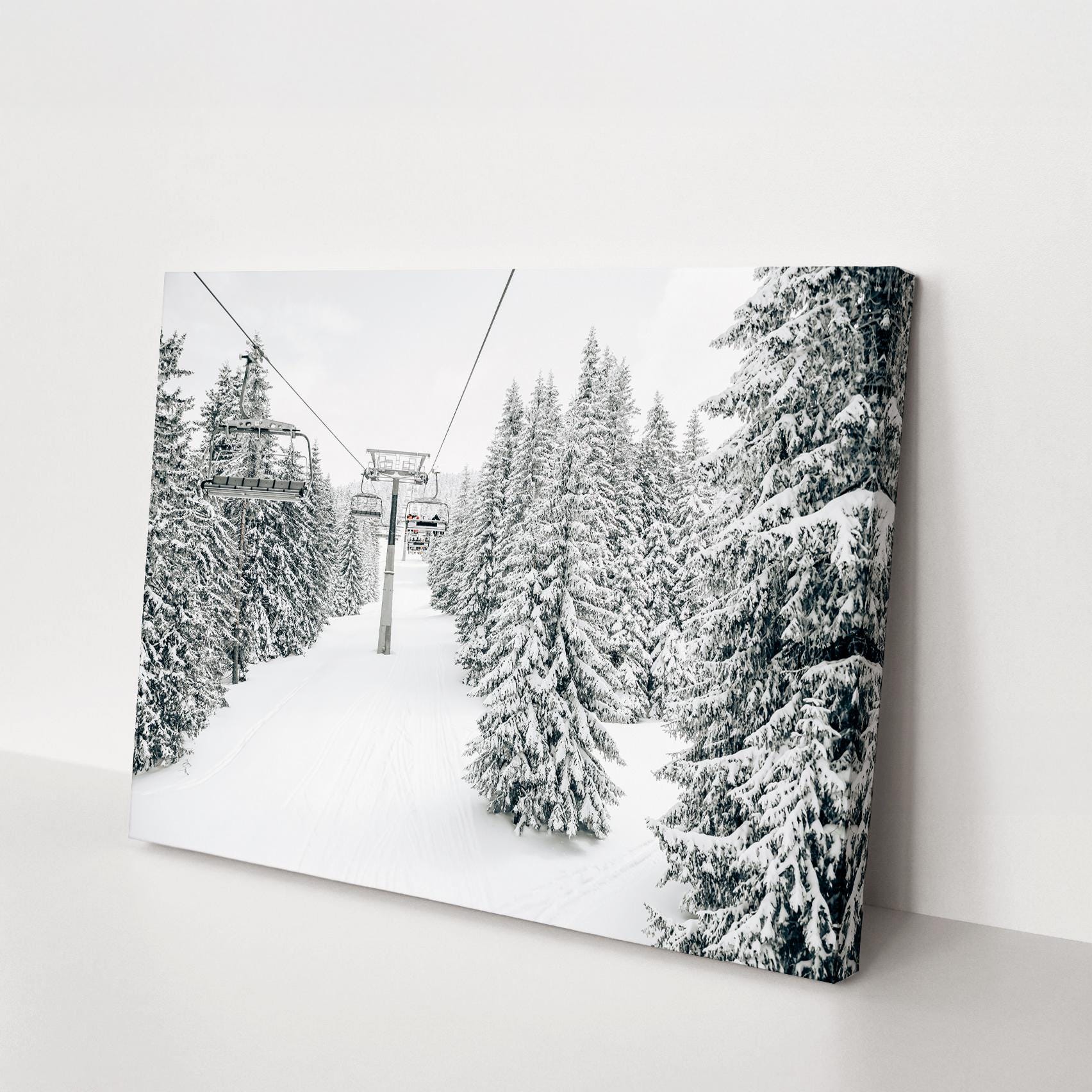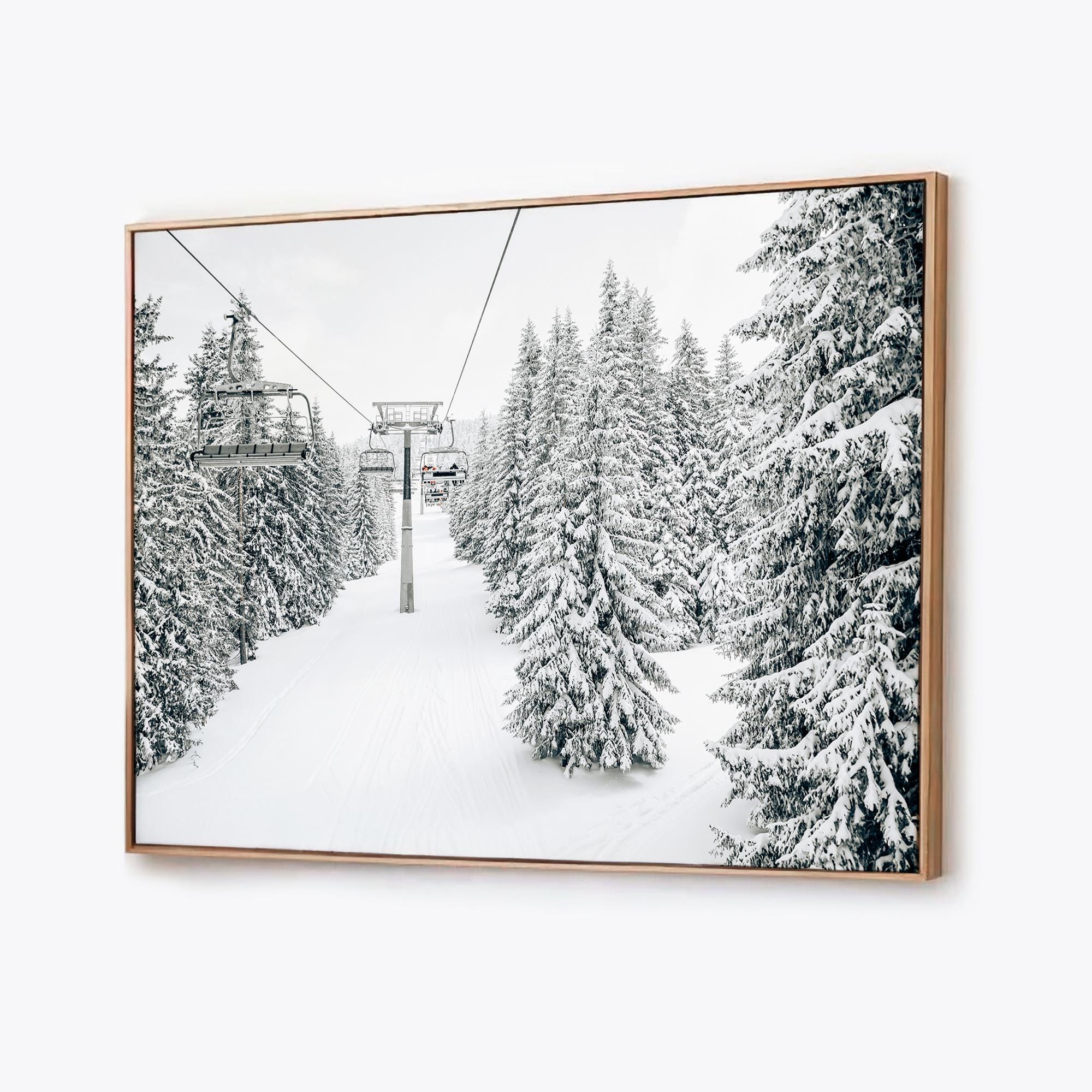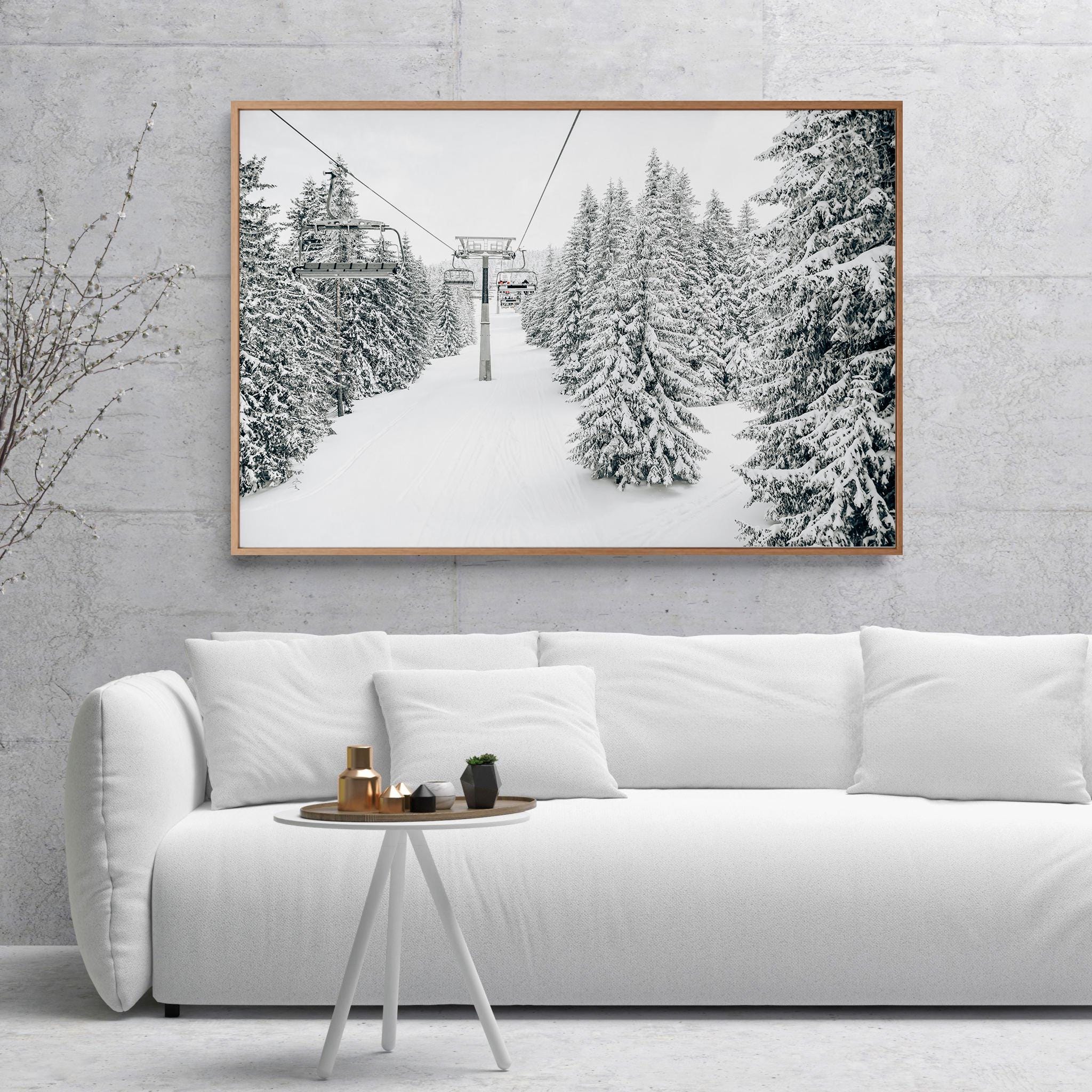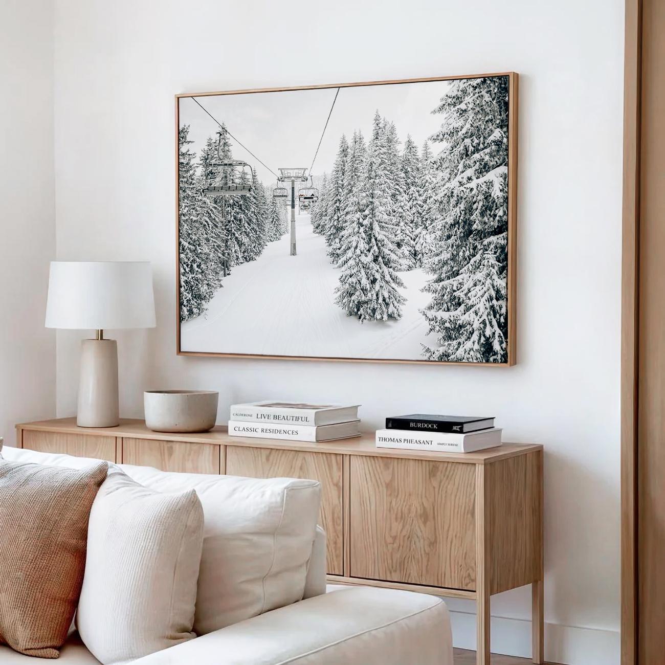 Bring a sense of calm and modern simplicity into your home with fine art photography giclee printed on premium 38mm stretched canvas. This serene winter landscape brings a cozy alpine feel to your space, ideal for cabin decor, ski homes, or seasonal wall art.