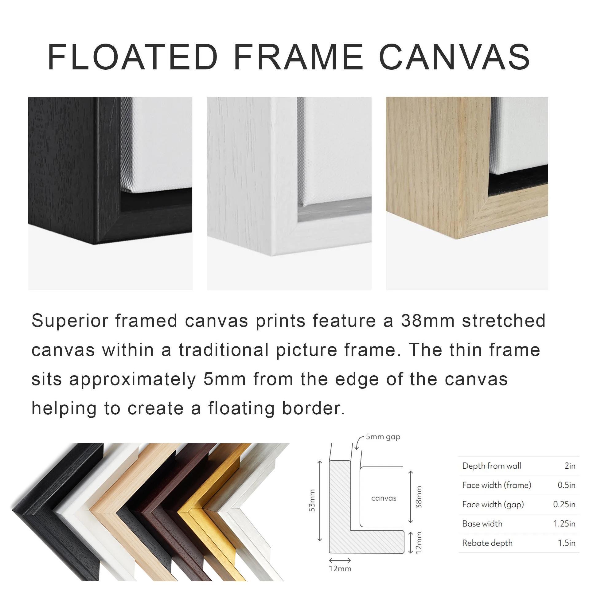 • Framed canvas are crafted from sustainably sourced wood. A thin, frame sits 5mm from the canvas edge, creating a floating effect.