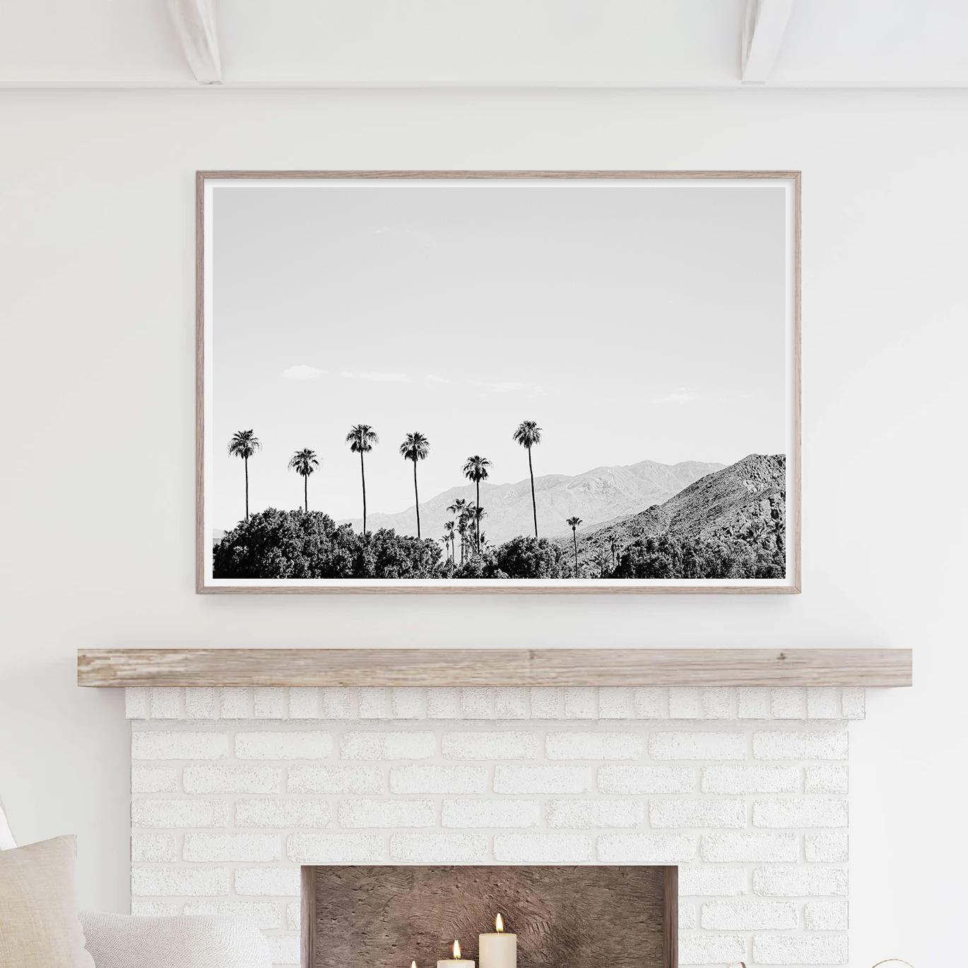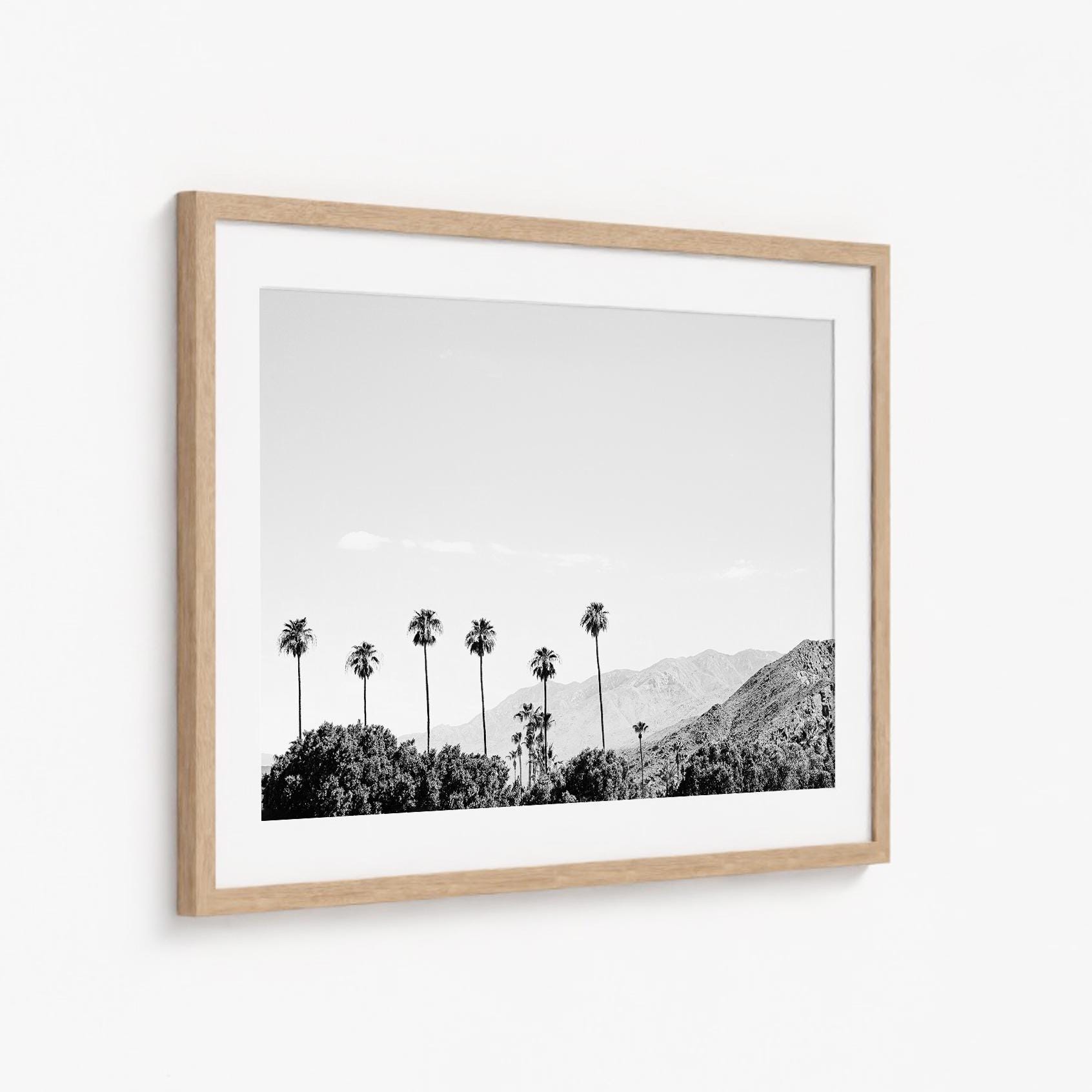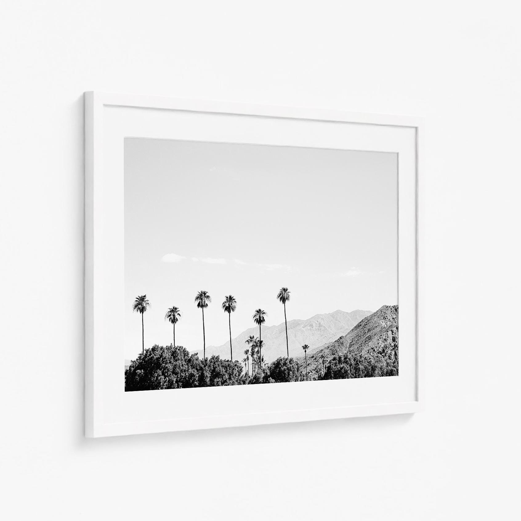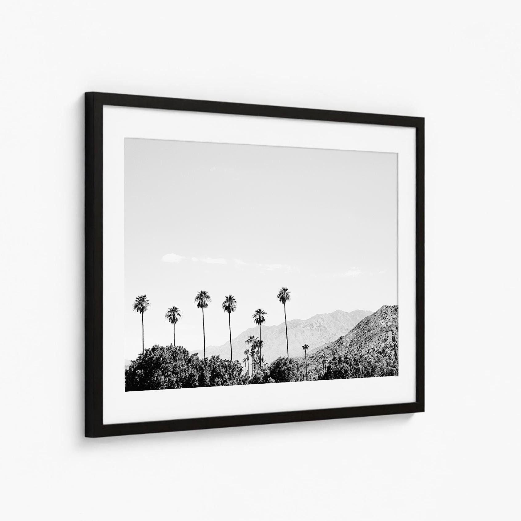 Bring timeless California charm into your space with this black and white Palm Springs wall art. Capturing tall palms rising against the desert mountains, this fine art print adds a sense of calm, open-air minimalism to any room.