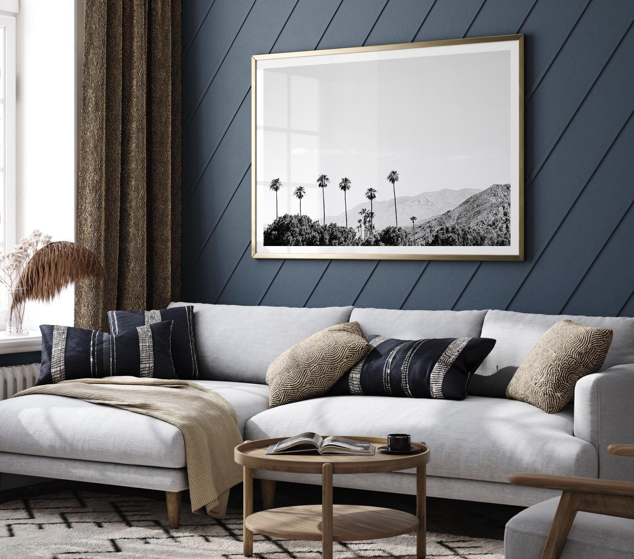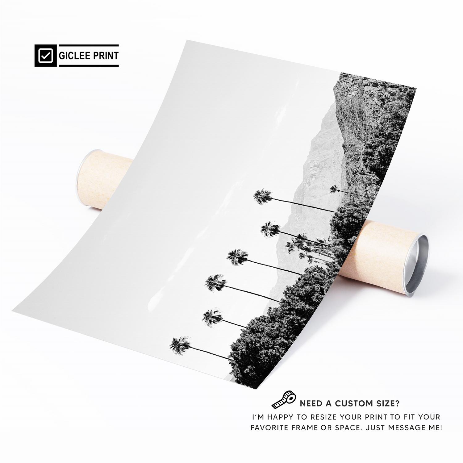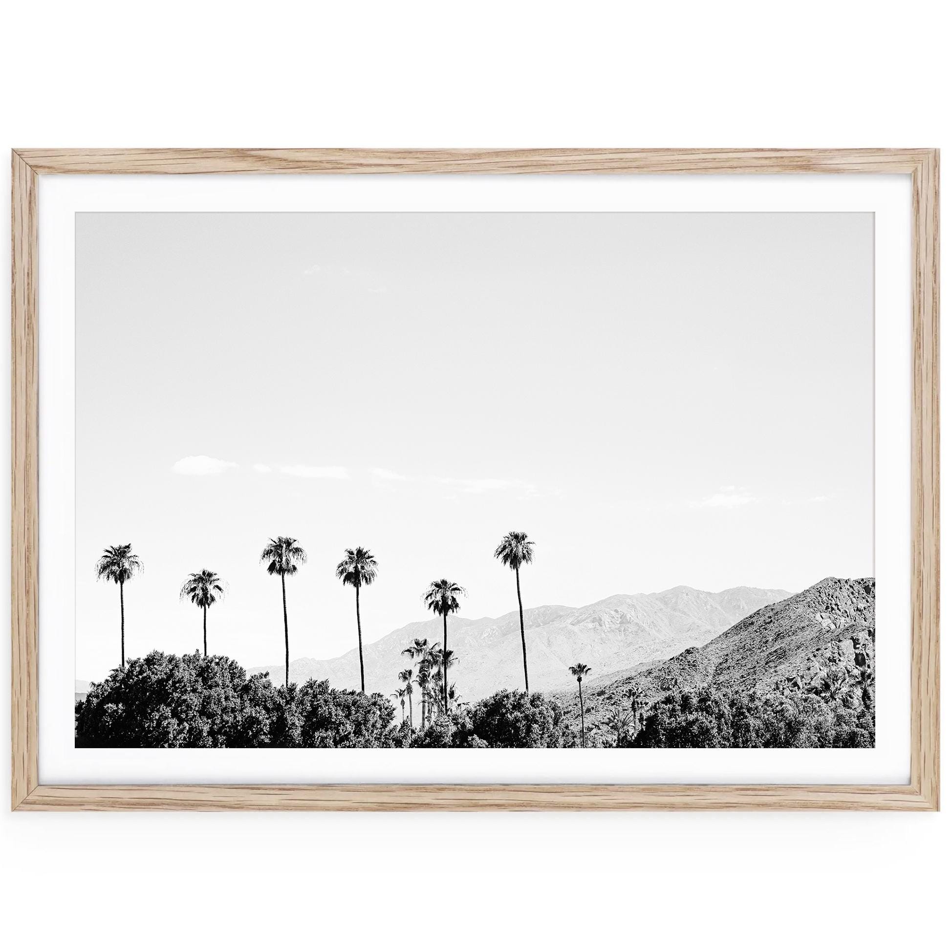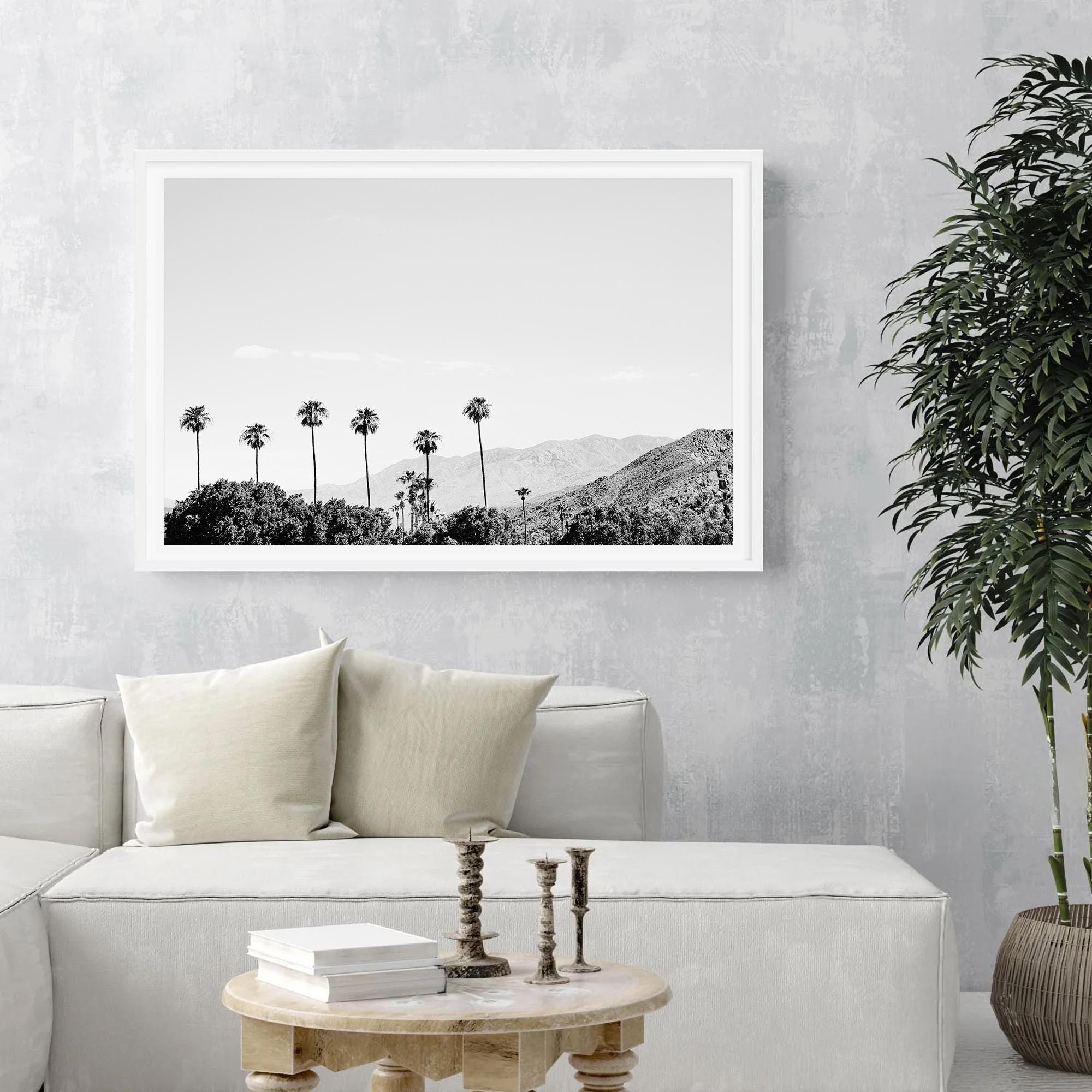 Bring timeless California charm into your space with this black and white Palm Springs wall art. Capturing tall palms rising against the desert mountains, this fine art print adds a sense of calm, open-air minimalism to any room.