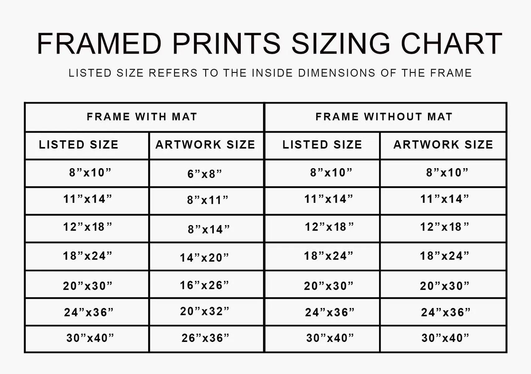 • Sizes listed refer to the artwork itself. When selecting the matted option, the frame size remains the same, while the visible artwork area becomes slightly smaller.