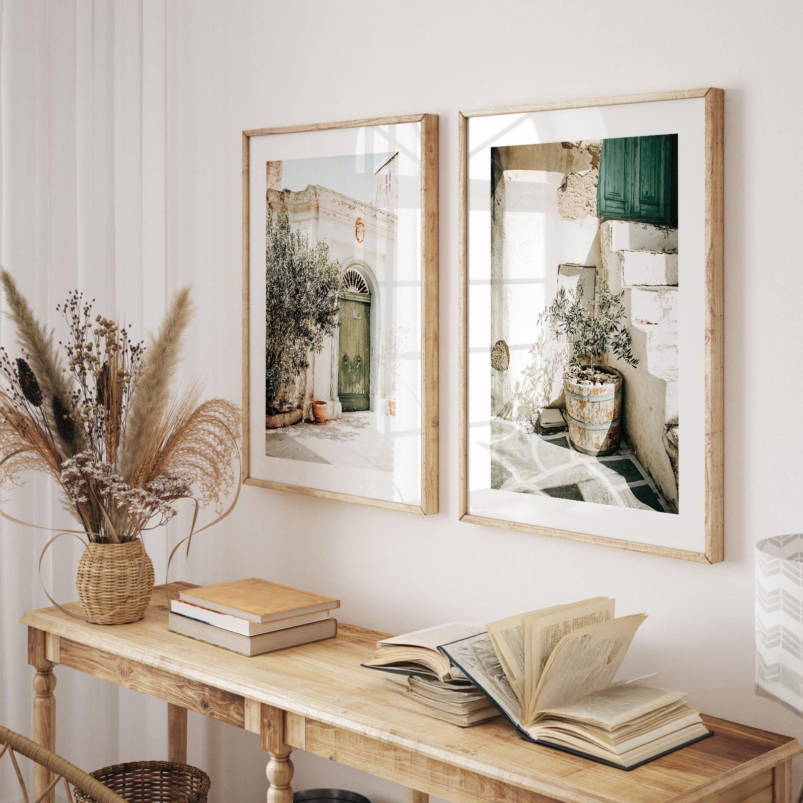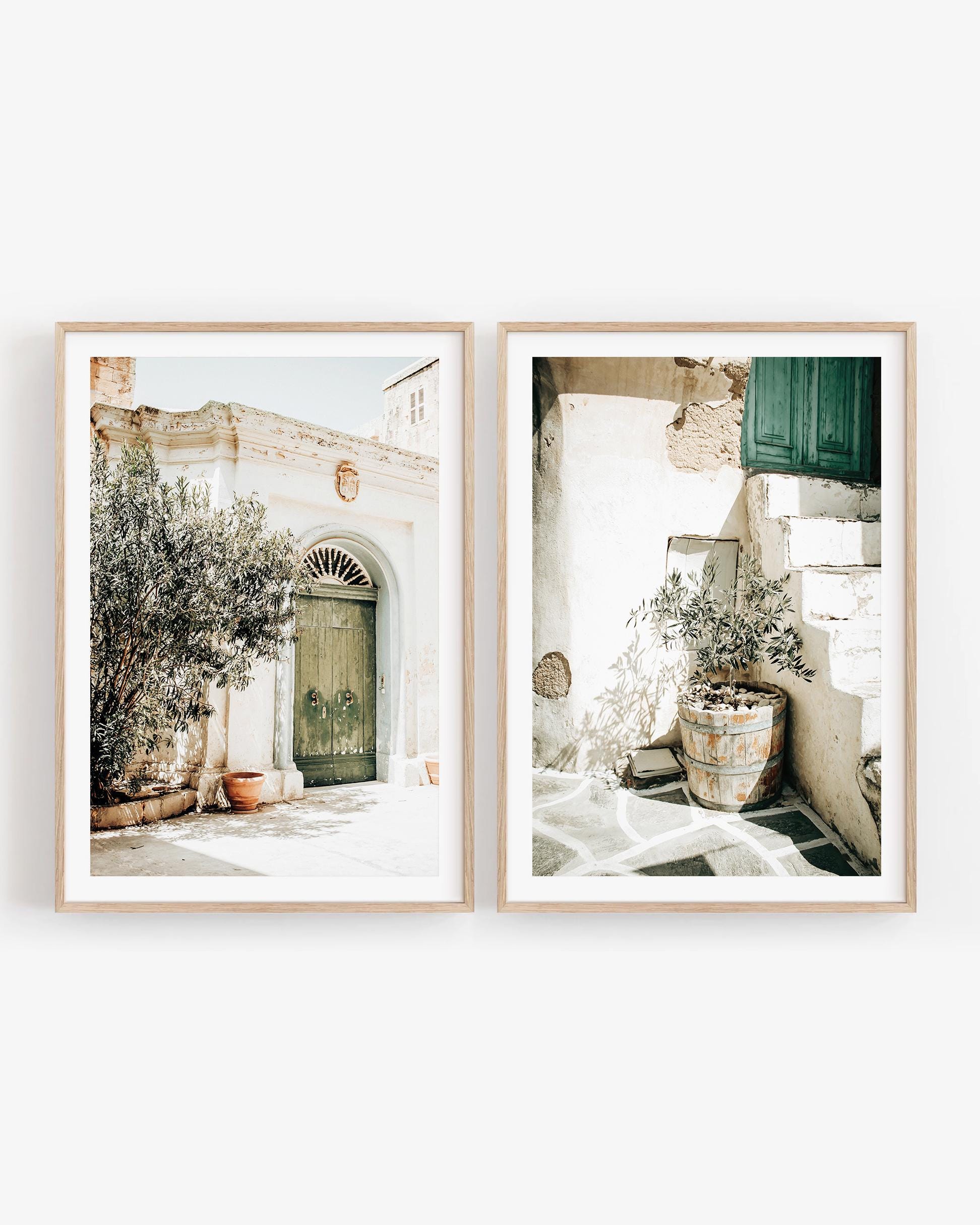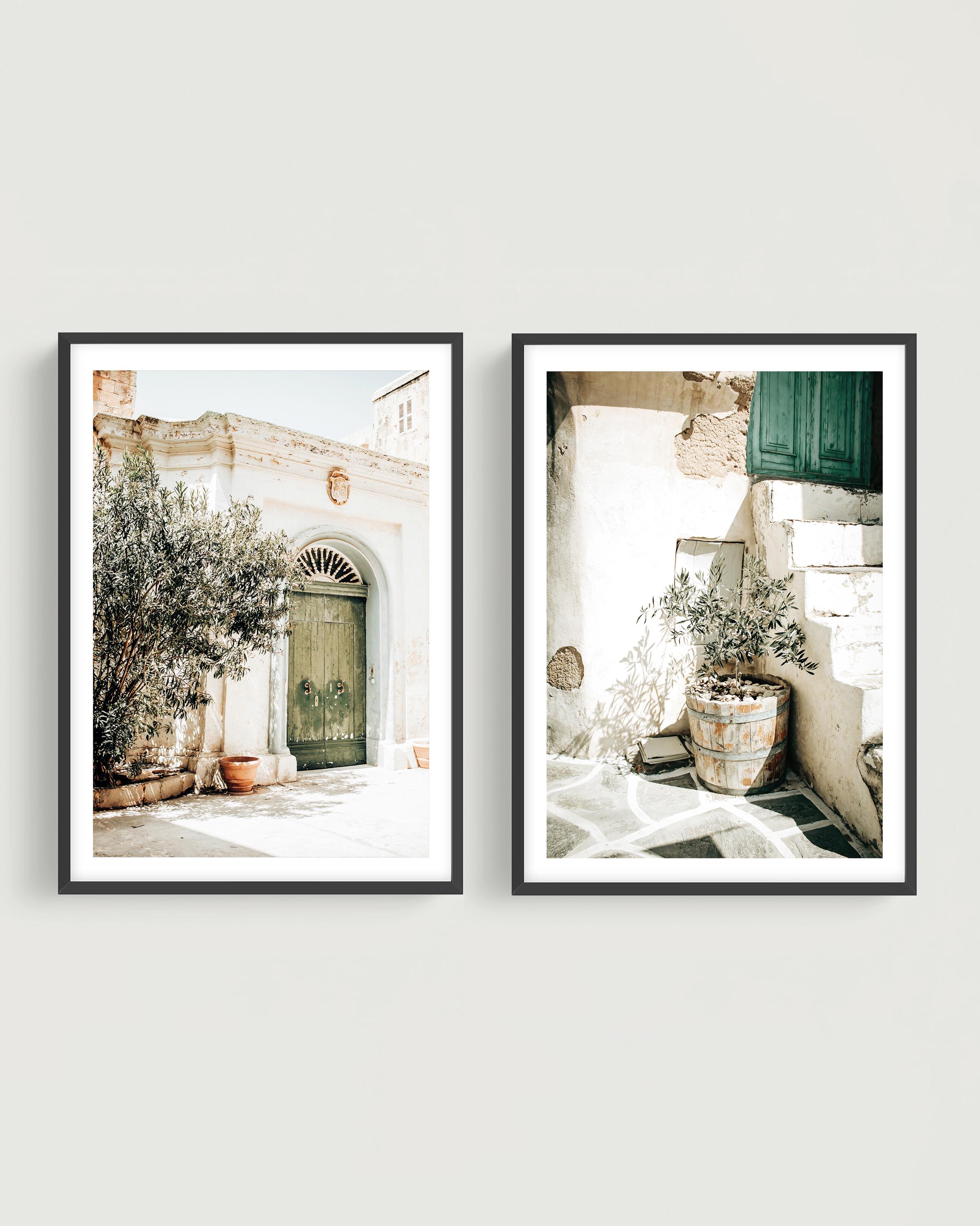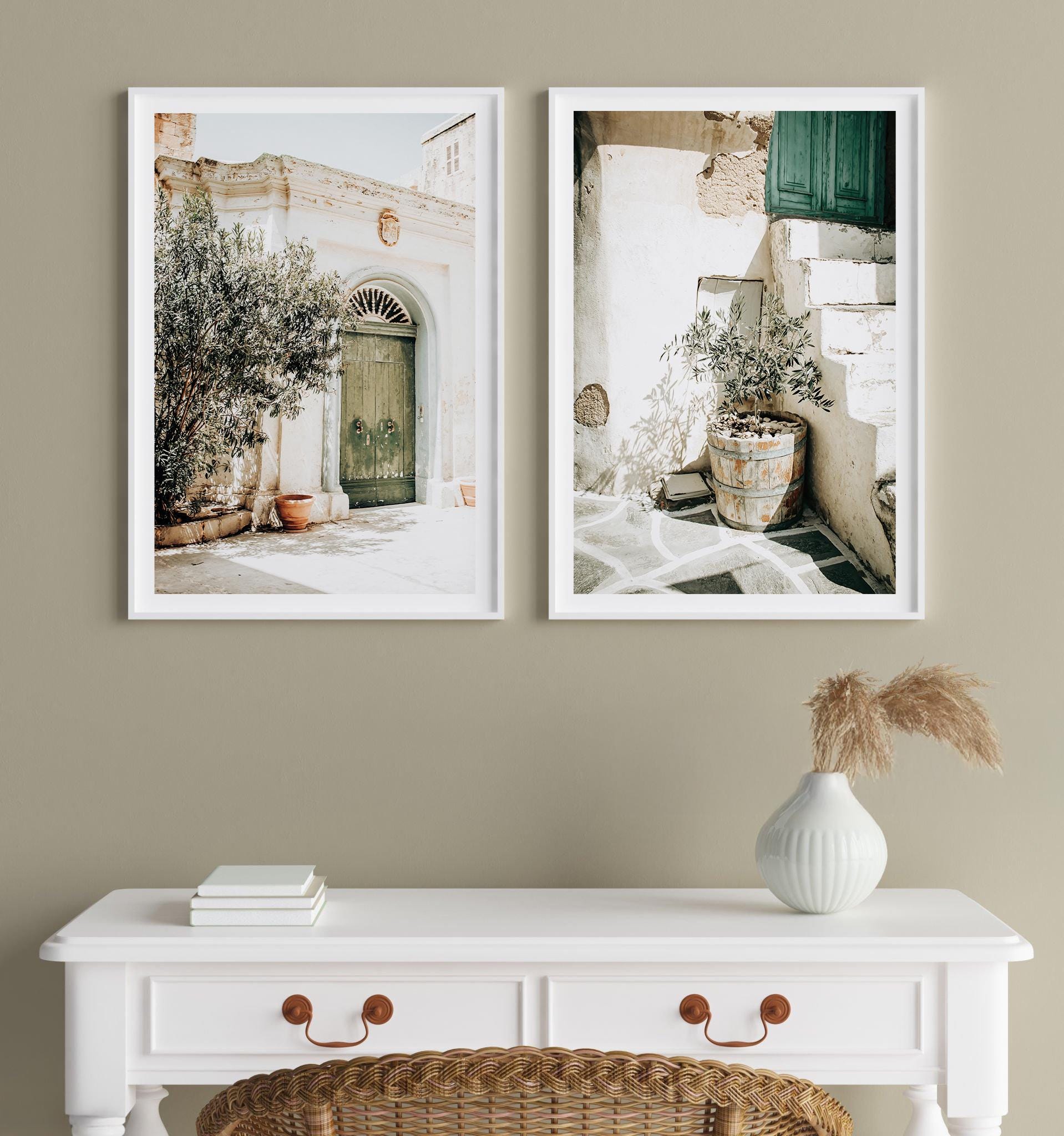 Bring a touch of Mediterranean calm to your home with this warm, rustic wall art set. These fine art prints capture the beauty of sunlit stone walls, weathered green doors, and olive trees. Effortlessly timeless, this artwork adds natural texture and serenity to coastal, farmhouse, or modern interiors.