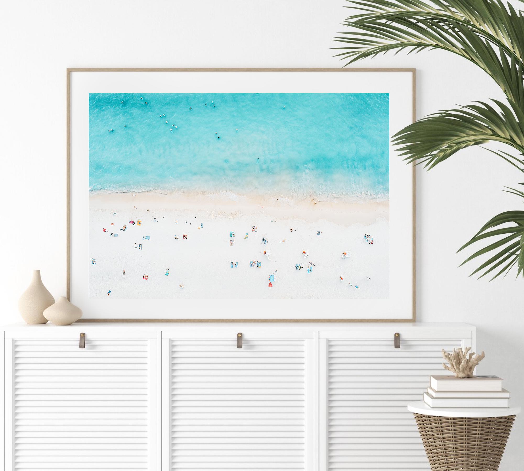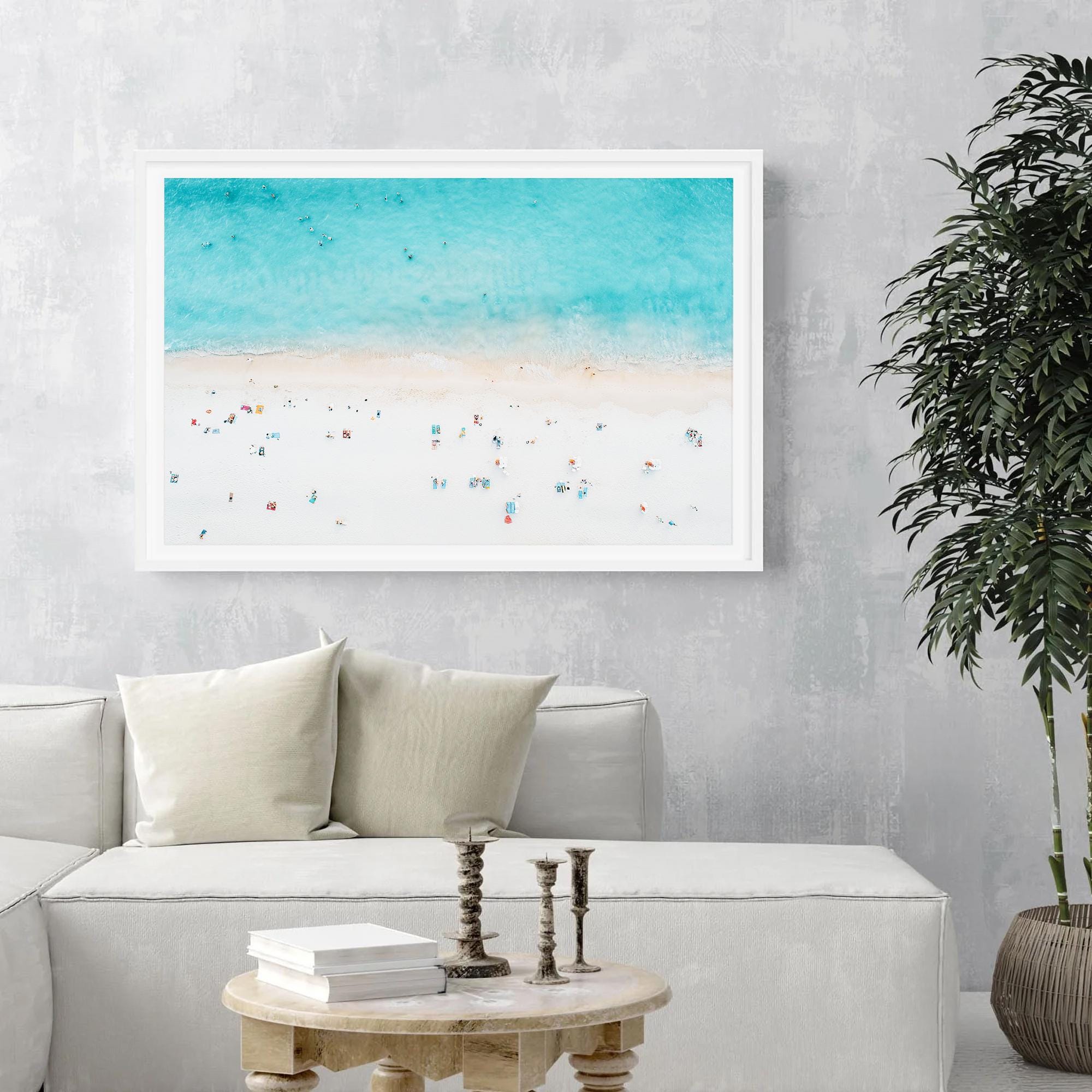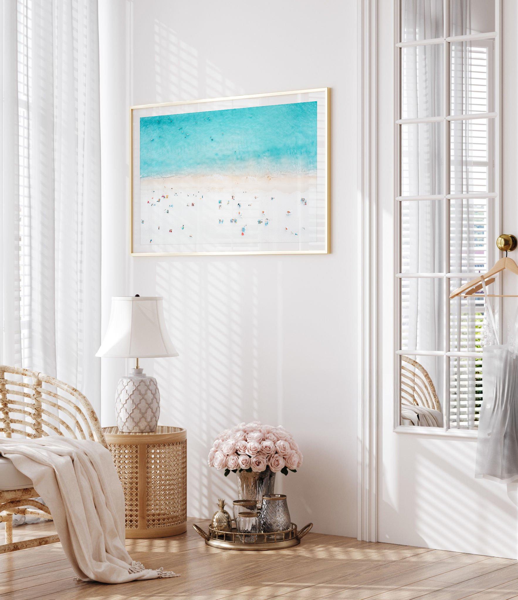 This airy beach aerial print instantly brings a calm, sun-washed vibe to your space. The soft turquoise water and minimal shoreline details create a clean, coastal look that blends effortlessly with modern, beachy, or relaxed interior styles.
