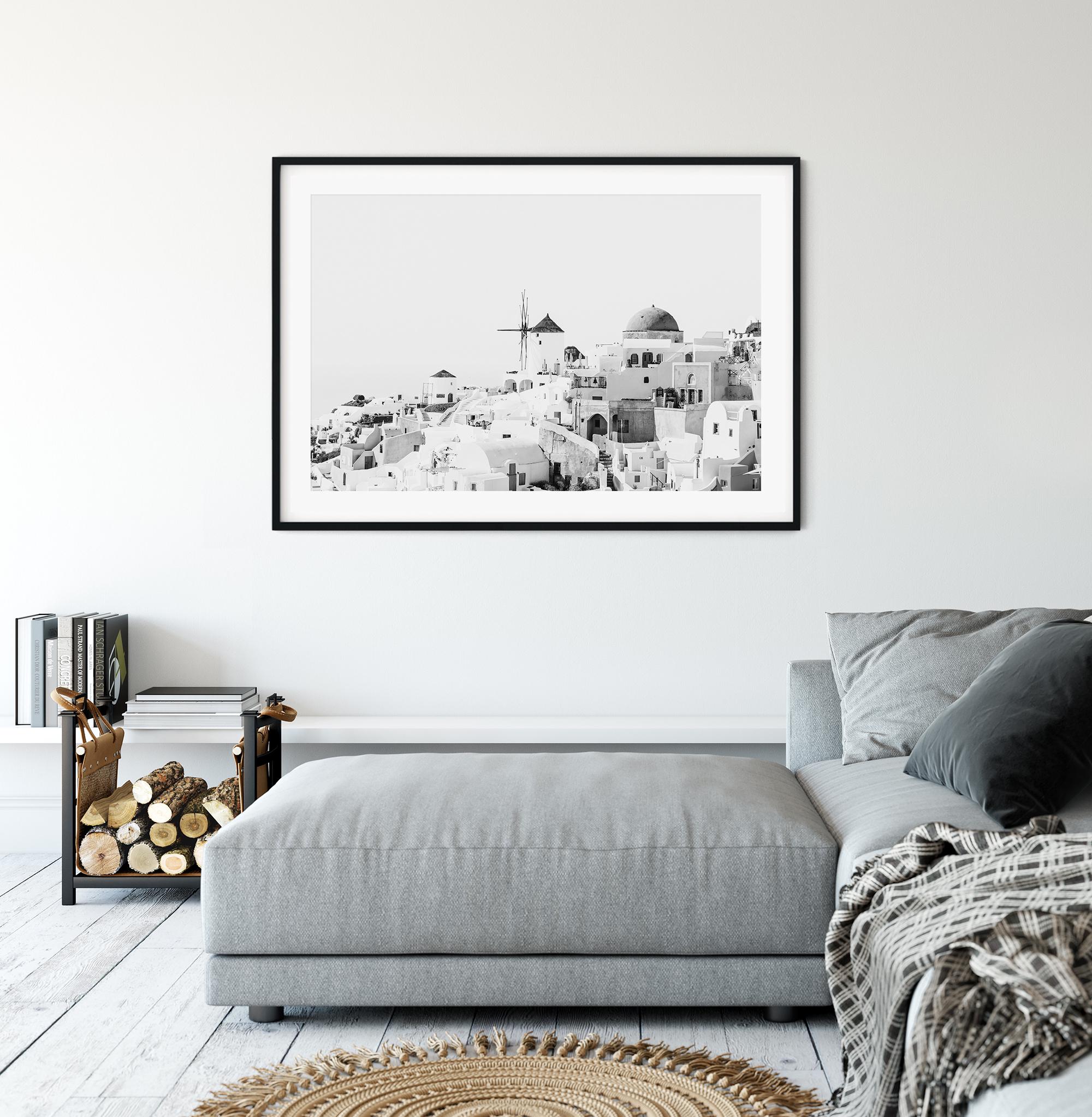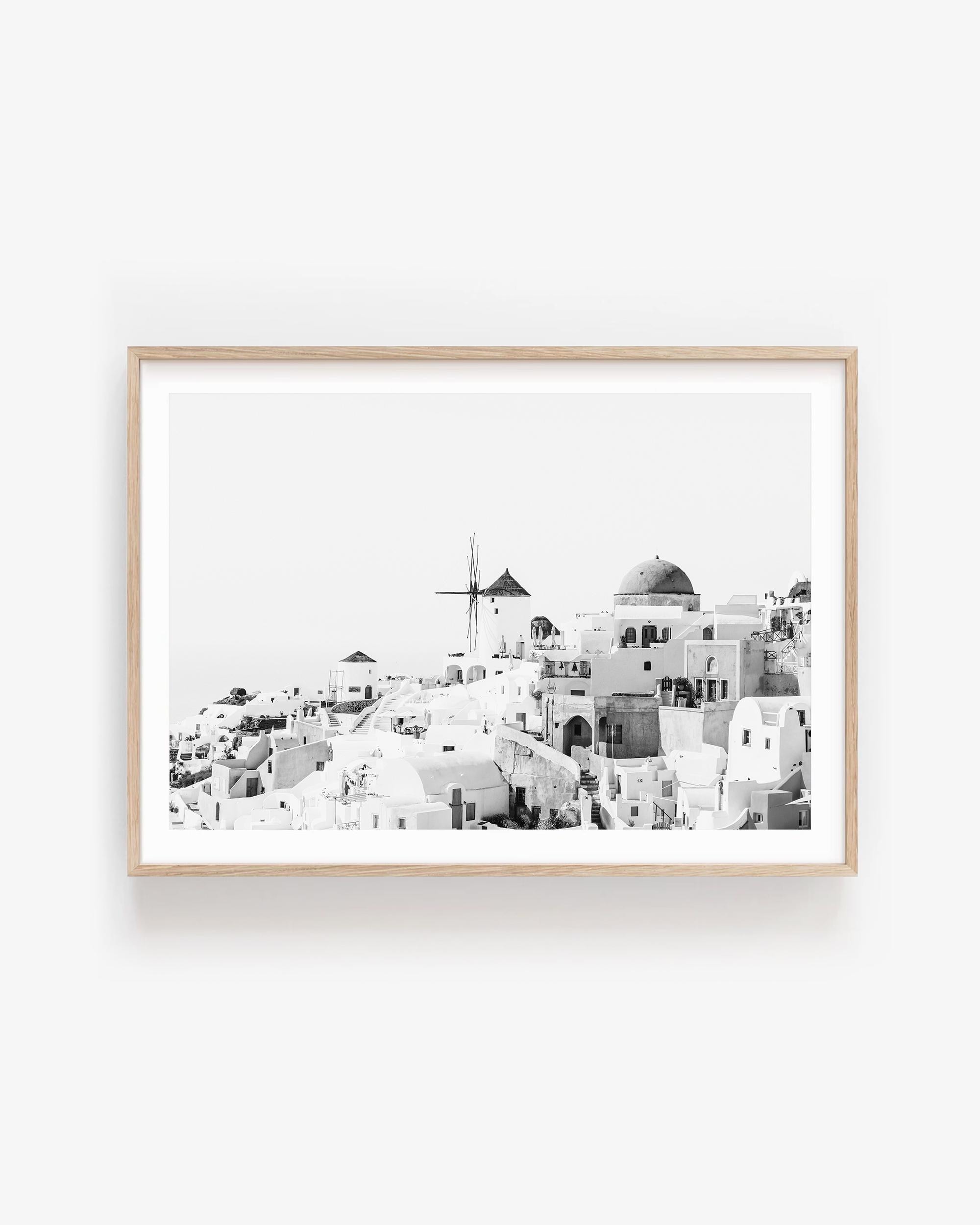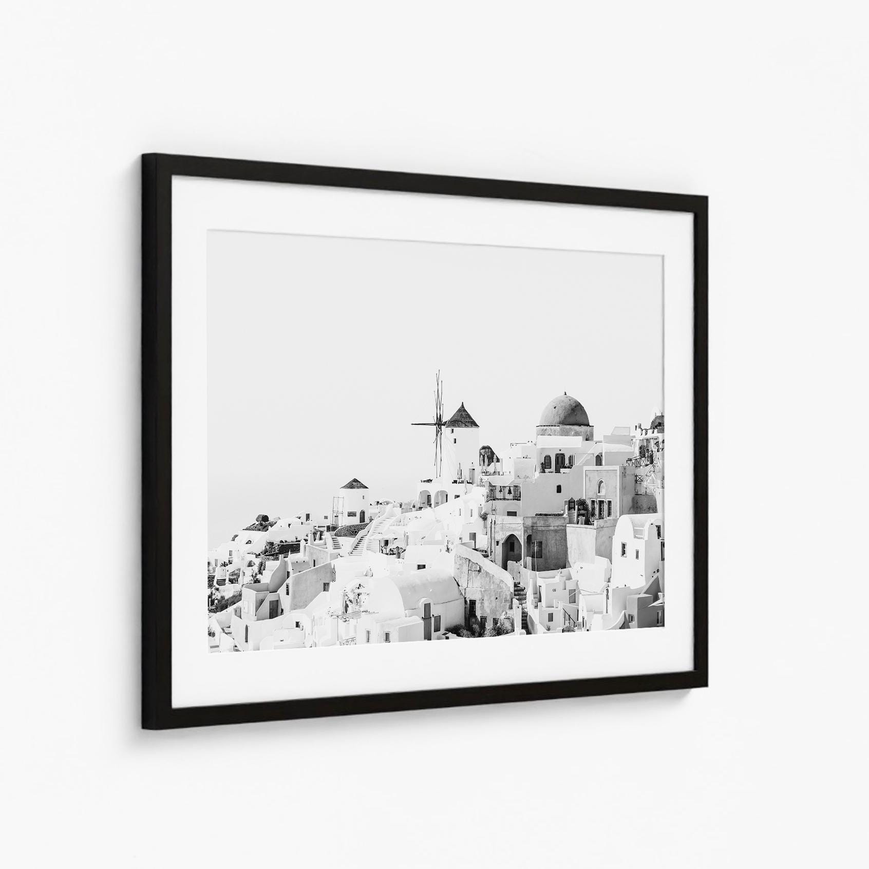 Bring effortless Mediterranean calm into your home with this black and white Santorini wall art, featuring the island’s iconic whitewashed architecture and hilltop windmill. The soft coastal tones and minimal style make it a relaxing, travel-inspired piece that blends beautifully into modern, airy interiors.