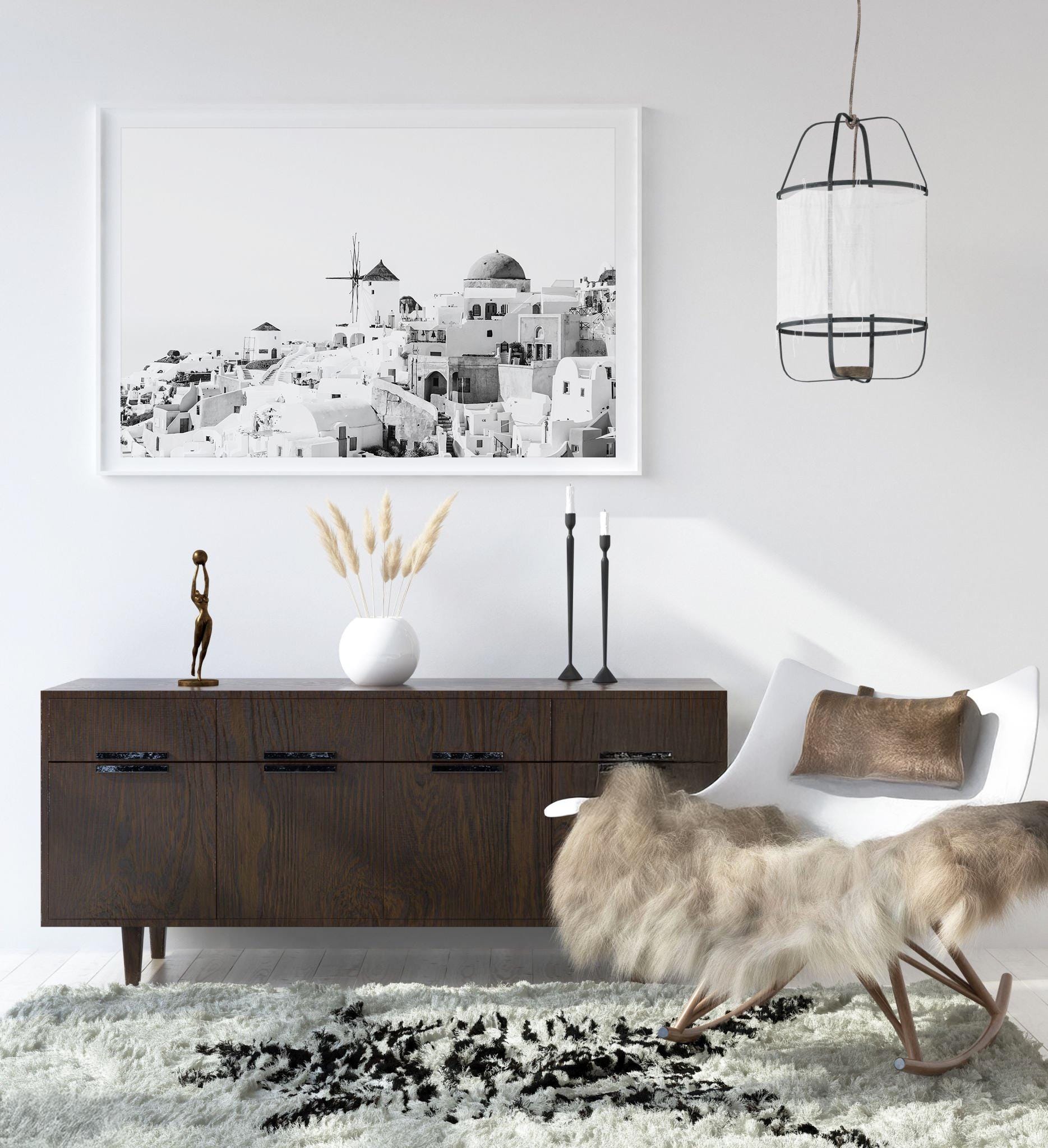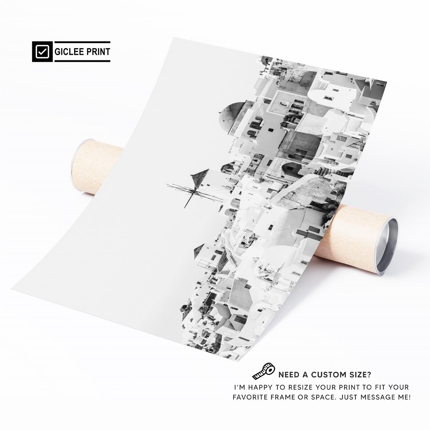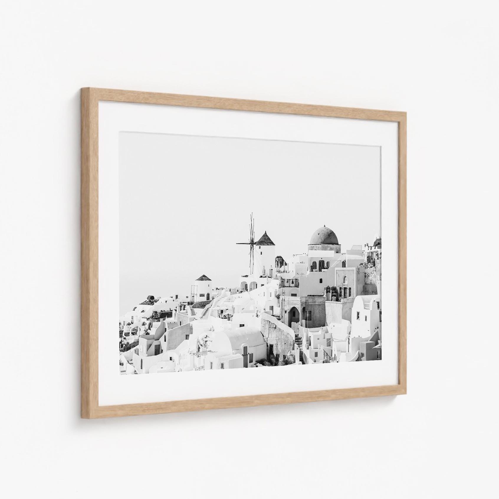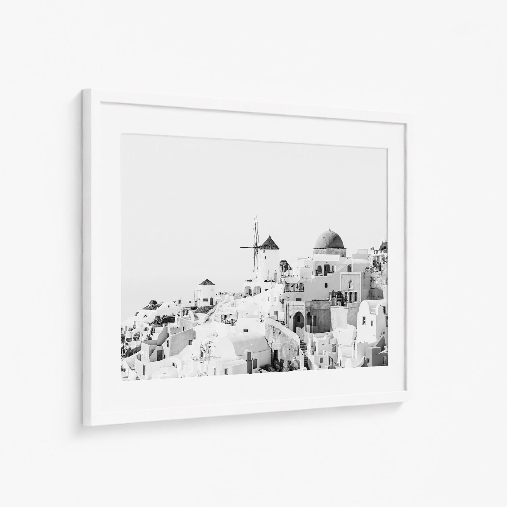 Bring effortless Mediterranean calm into your home with this black and white Santorini wall art, featuring the island’s iconic whitewashed architecture and hilltop windmill. The soft coastal tones and minimal style make it a relaxing, travel-inspired piece that blends beautifully into modern, airy interiors.