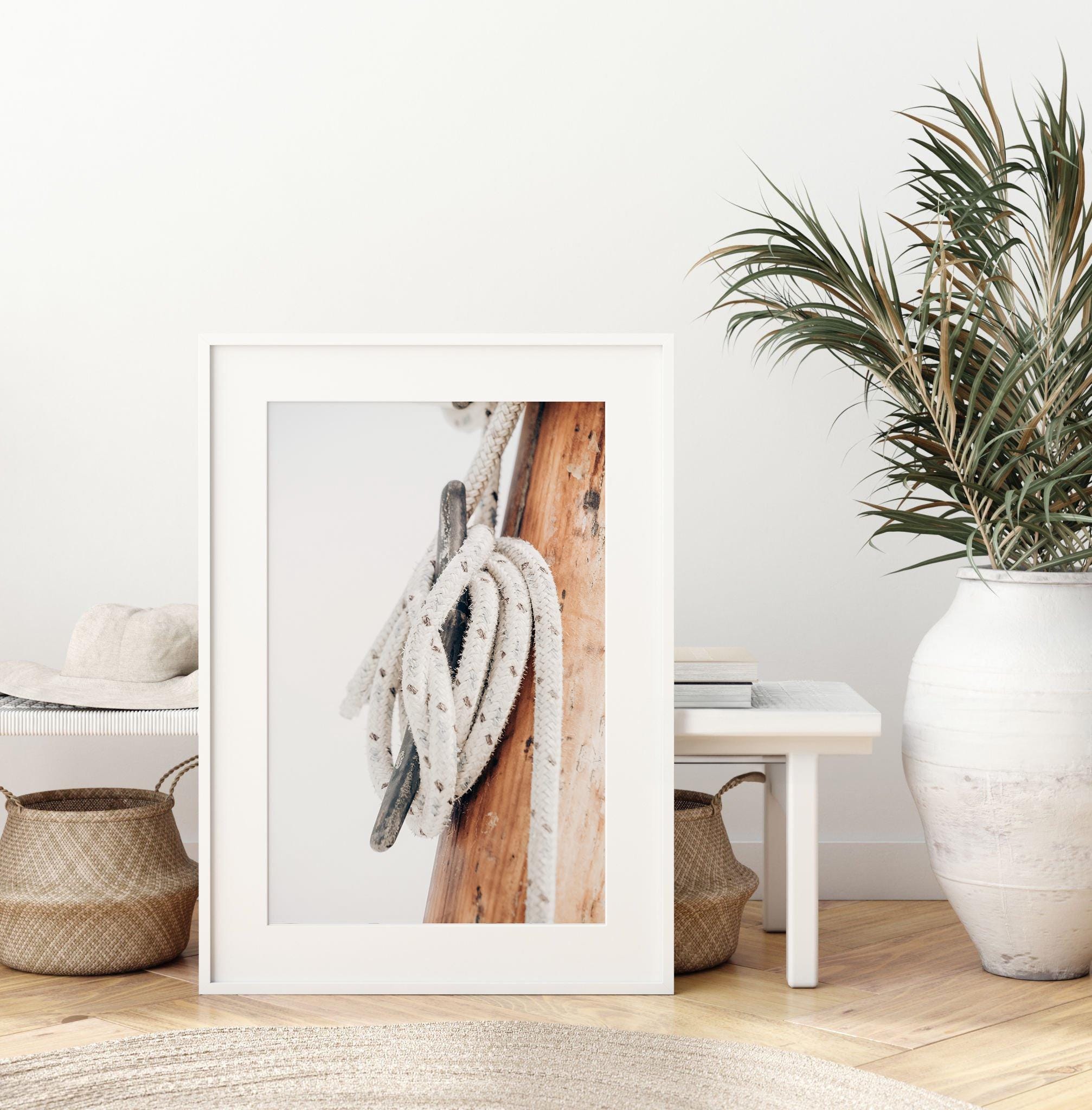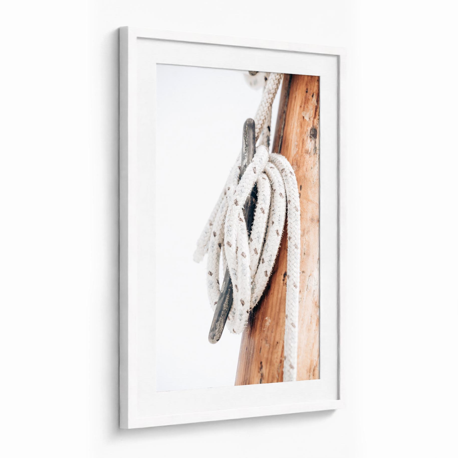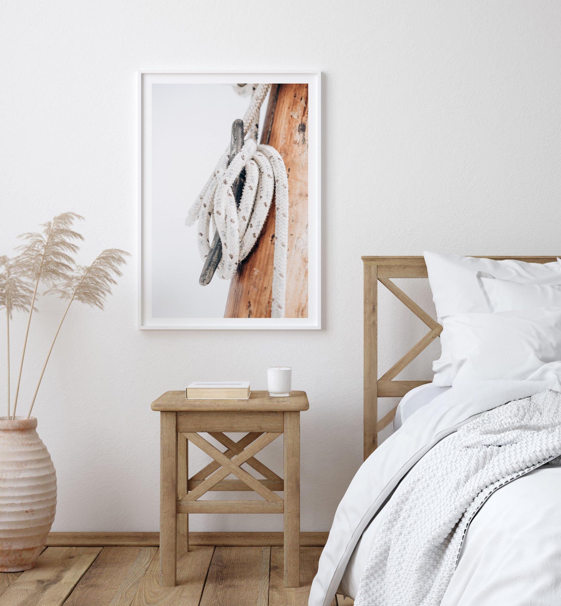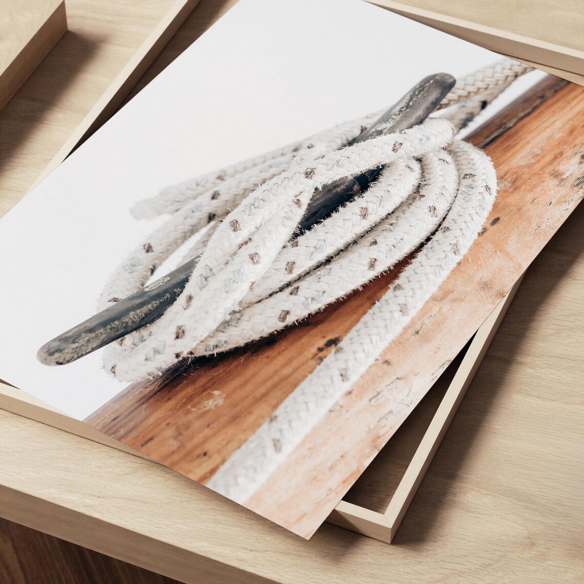 Soft and refined, this minimal nautical print captures the quiet beauty of handcrafted sailing elements. The warm wood tones and textured rope bring subtle coastal character making it perfect for calm, neutral interiors.