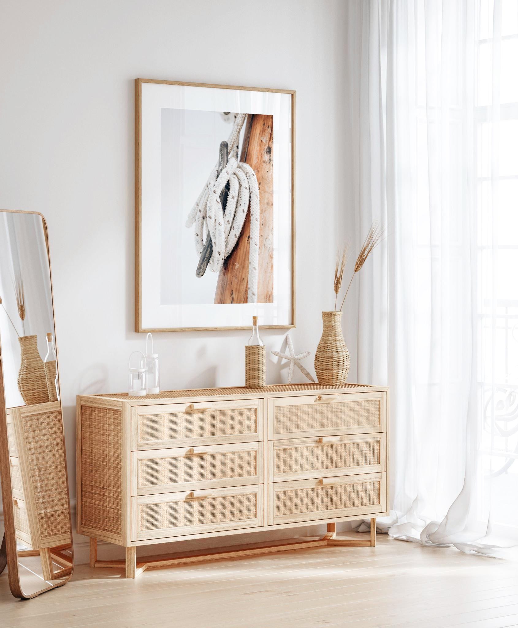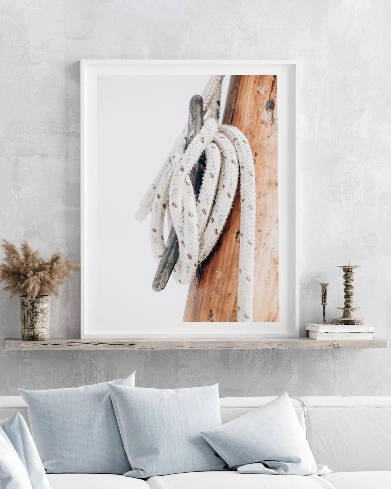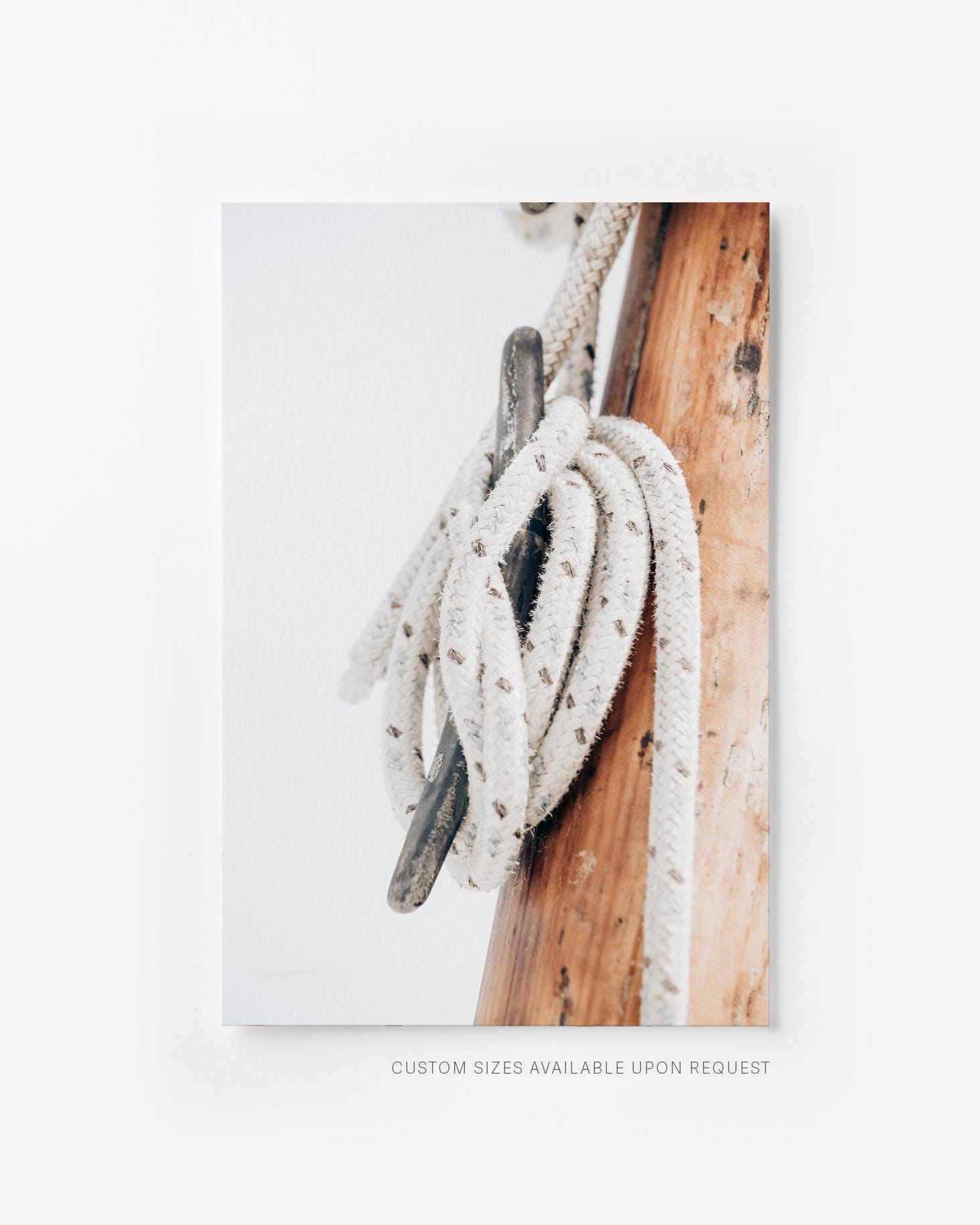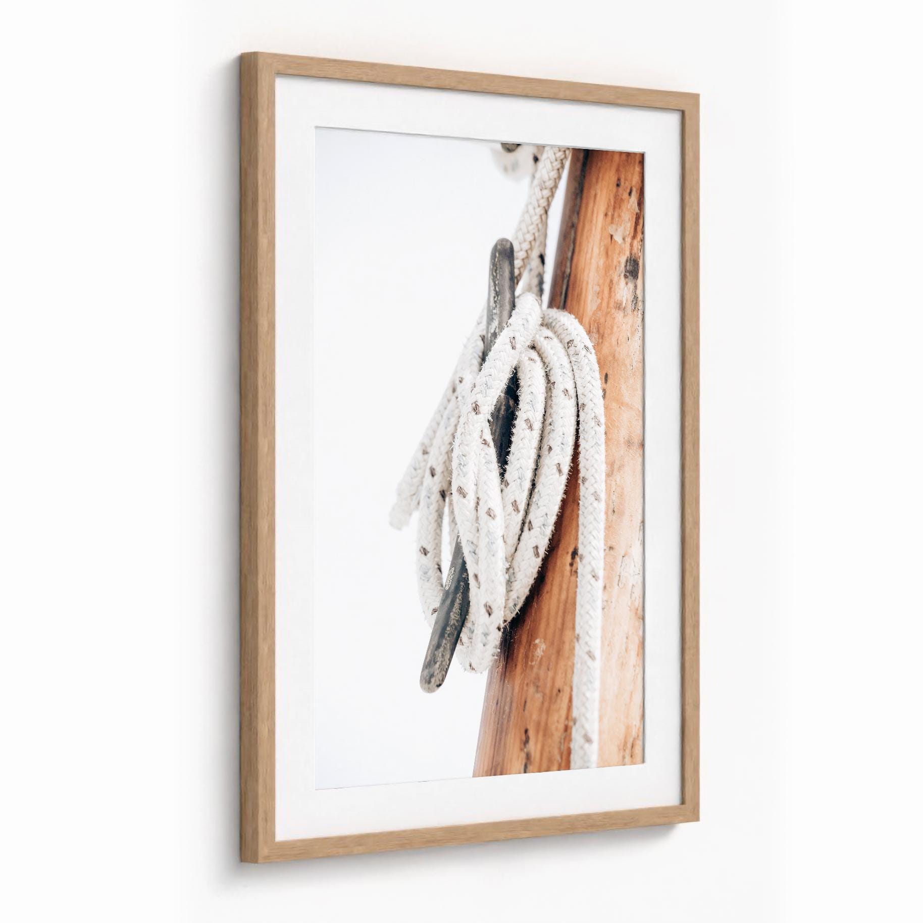Soft and refined, this minimal nautical print captures the quiet beauty of handcrafted sailing elements. The warm wood tones and textured rope bring subtle coastal character making it perfect for calm, neutral interiors.