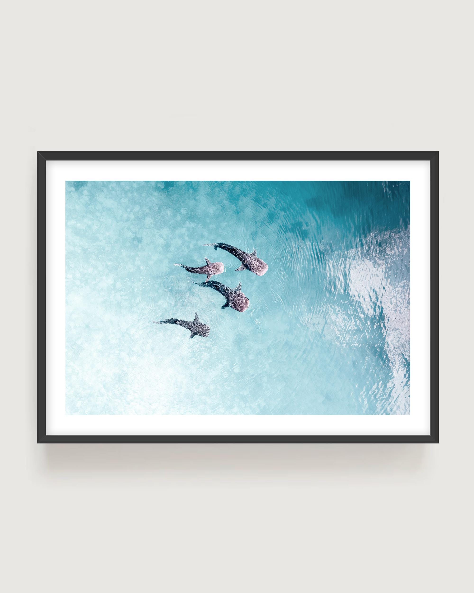 Aerial Sharks Photography Print - Minimal Soft Aqua Ocean Wall Art for Coastal Interiors