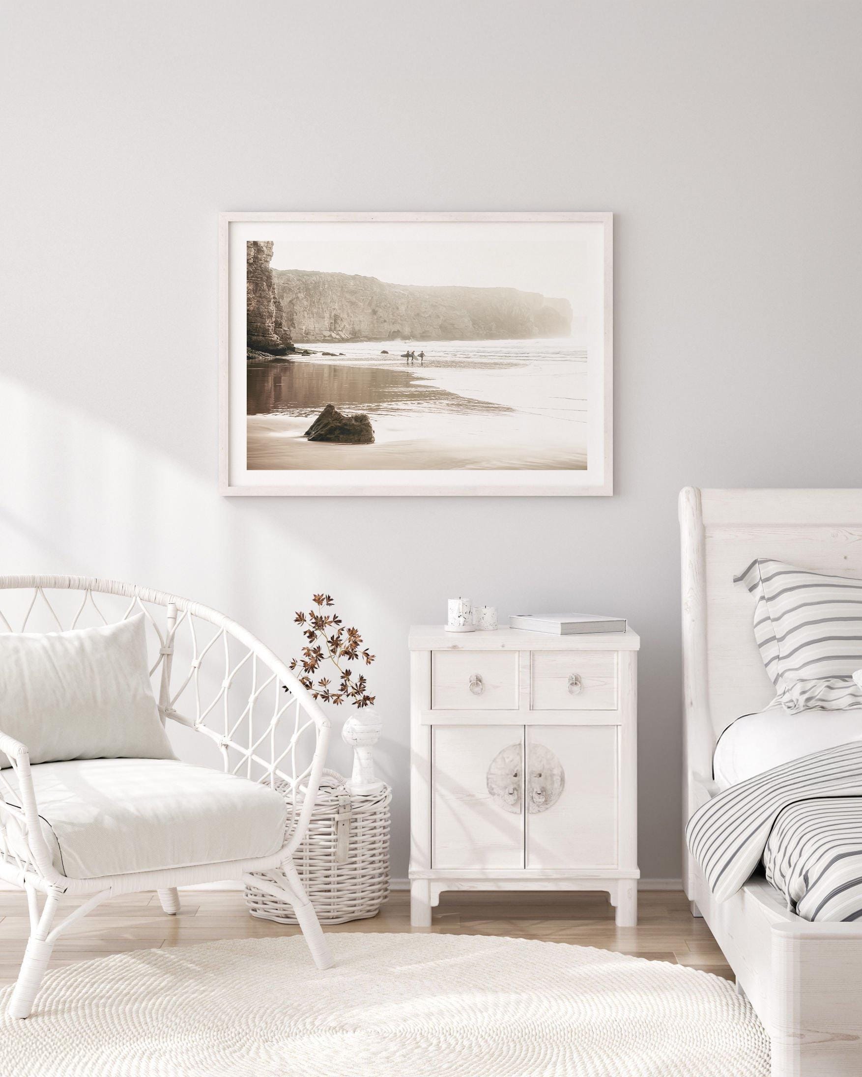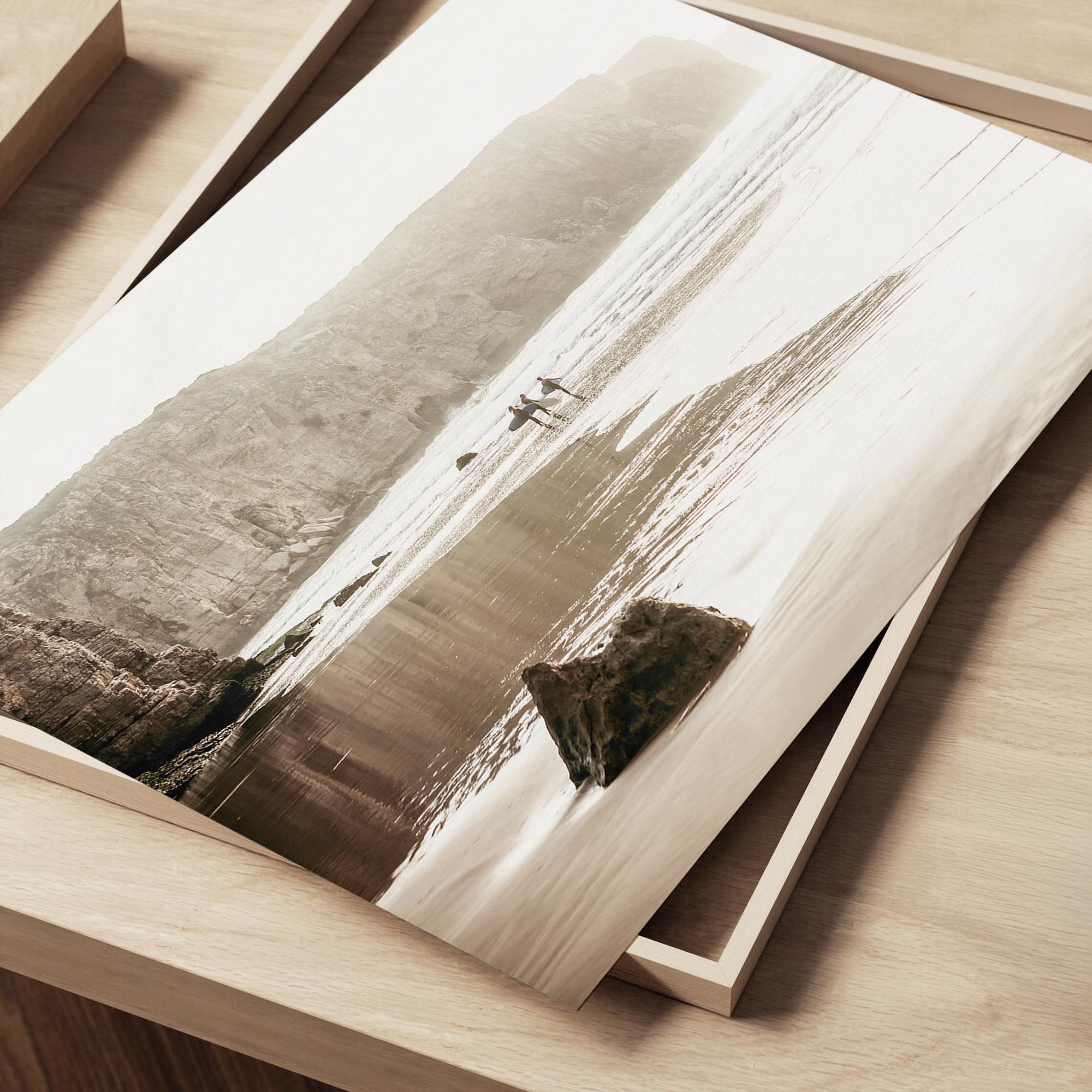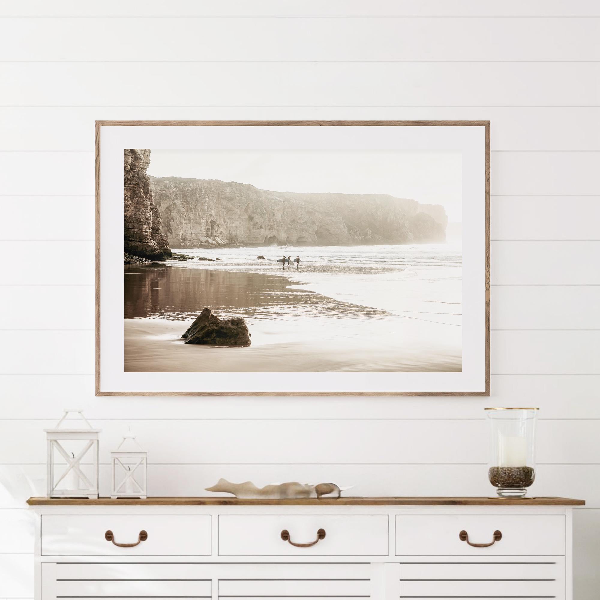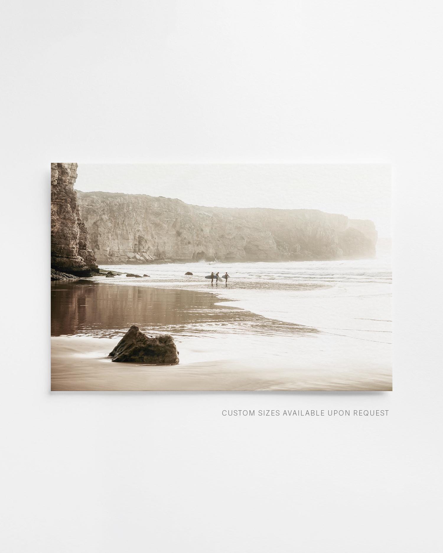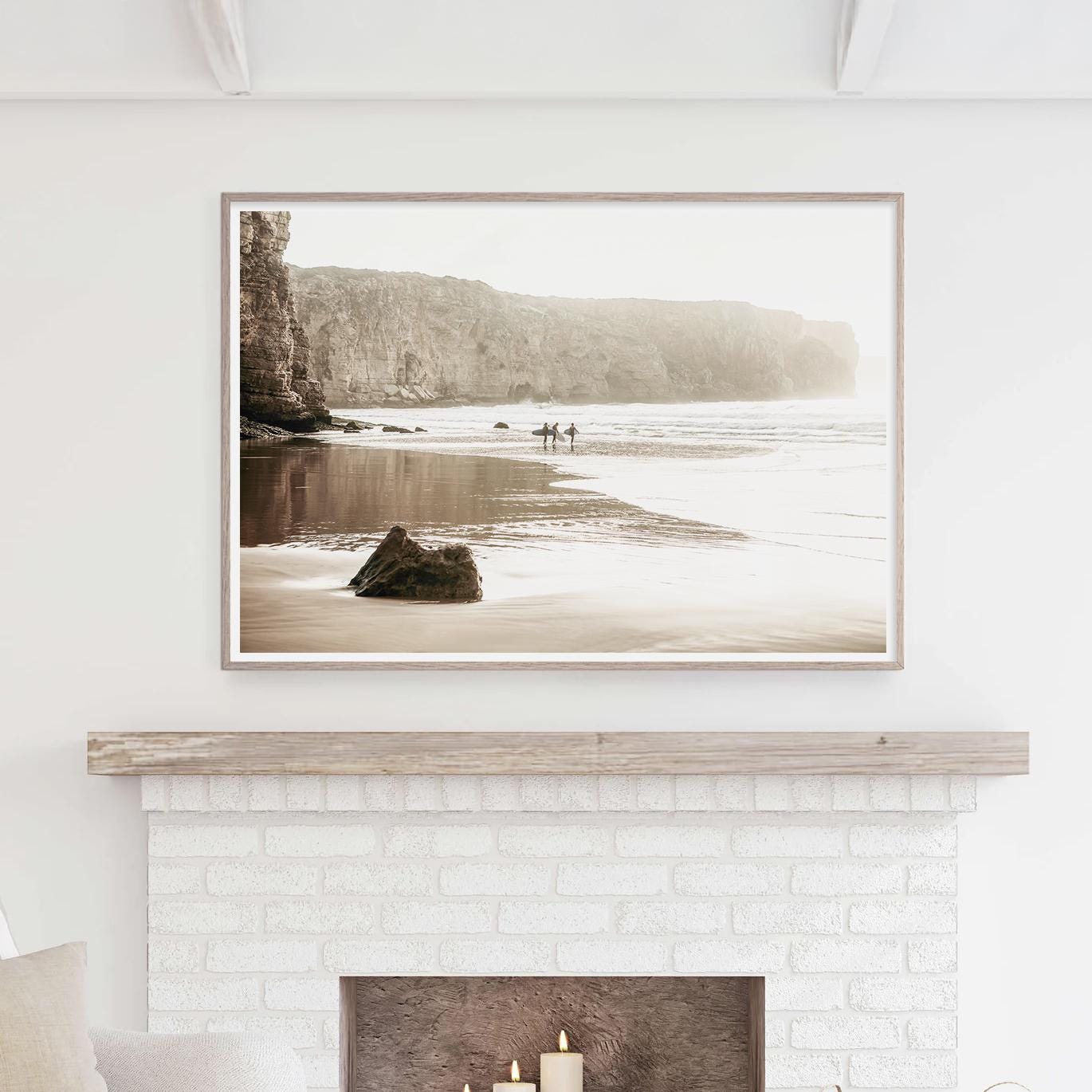 Bring coastal warmth into your home with this softly toned surf landscape. Gentle morning light, and distant figures create a quiet, relaxed mood that suits neutral, minimalist, and organic interiors. This refined beach scene blends seamlessly into your space, offering understated luxury without overpowering your decor.