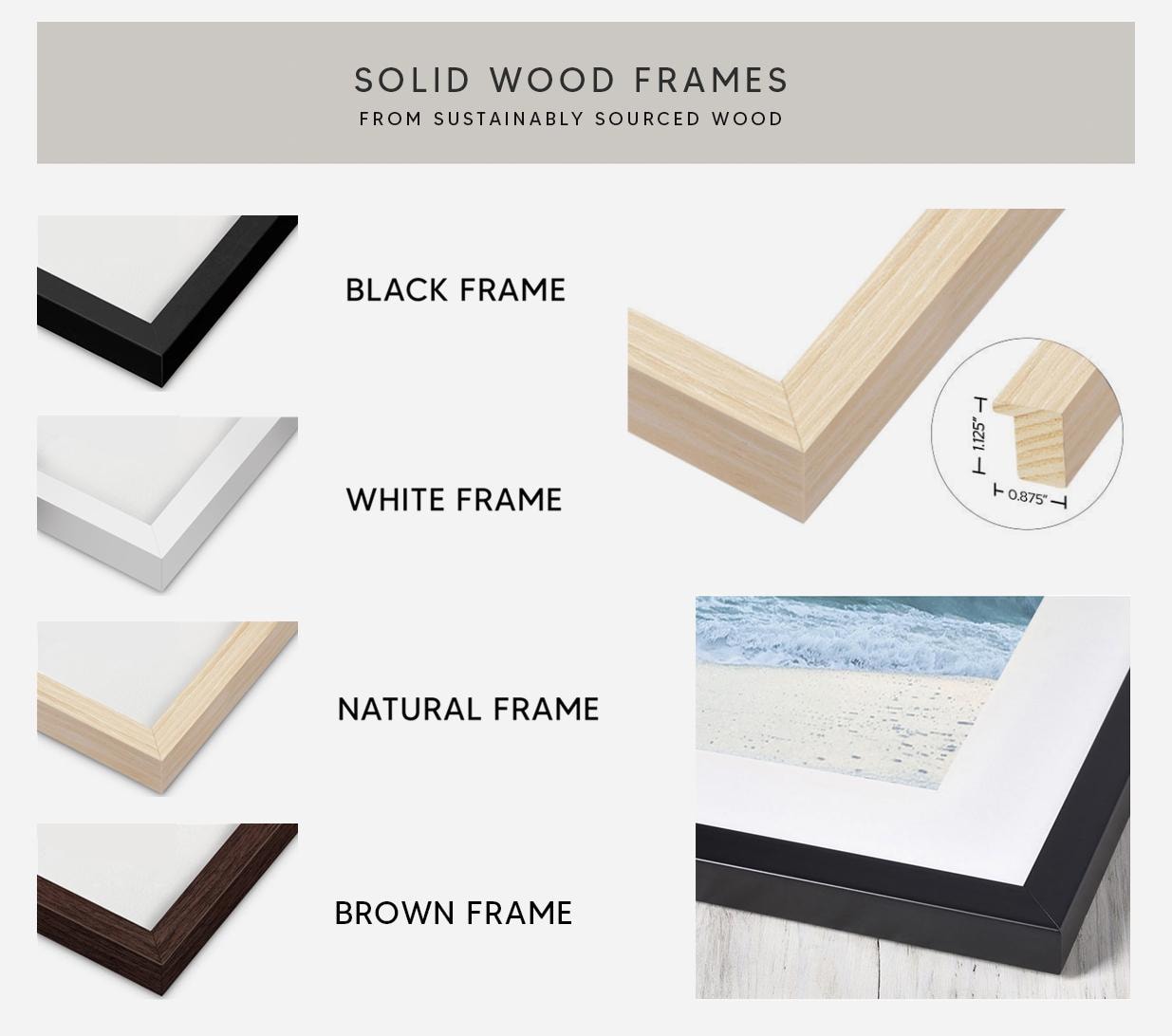 • Sizes refer to the visible print area inside the frame. Matted options keep the same frame size, but reduce the visible artwork area slightly.