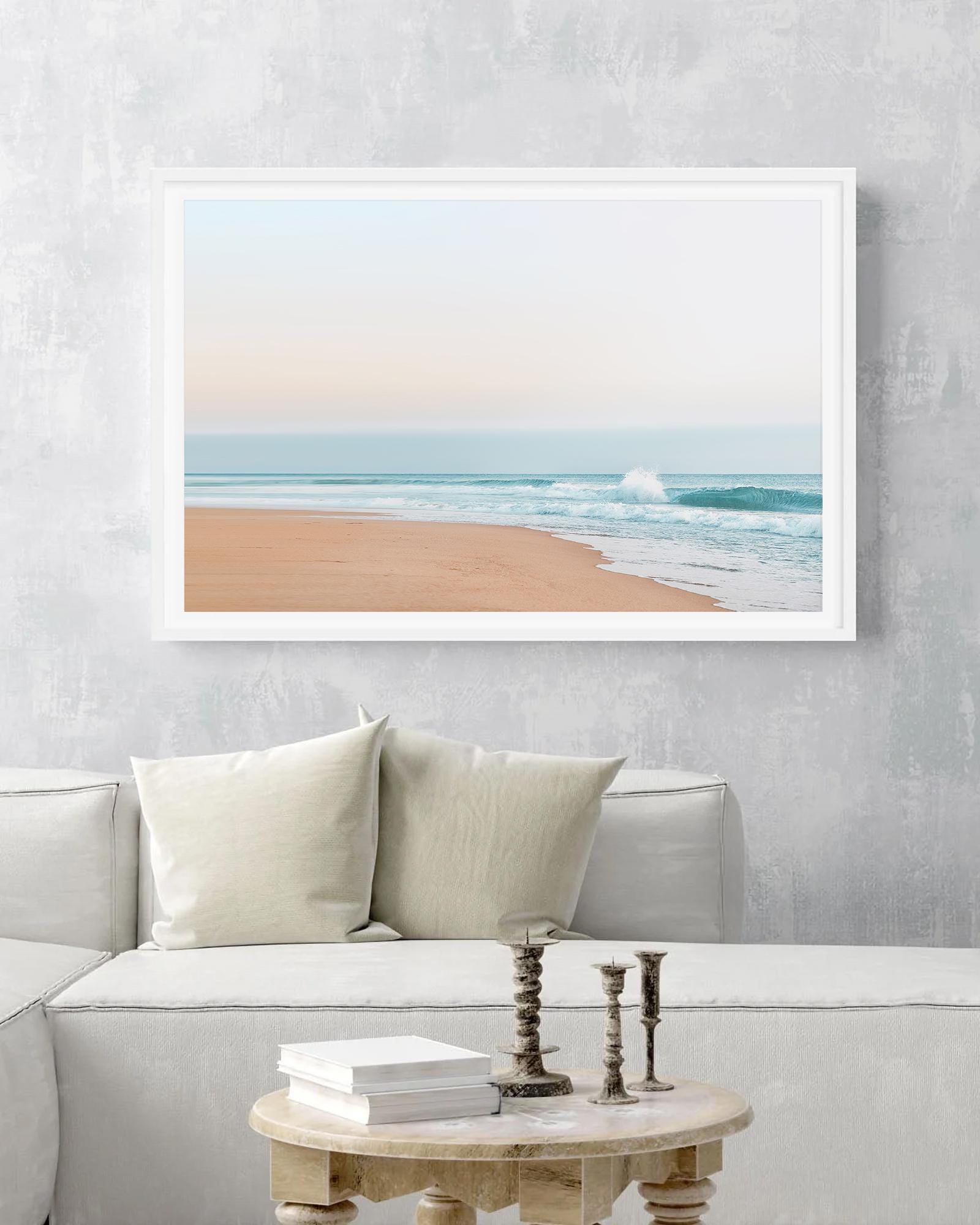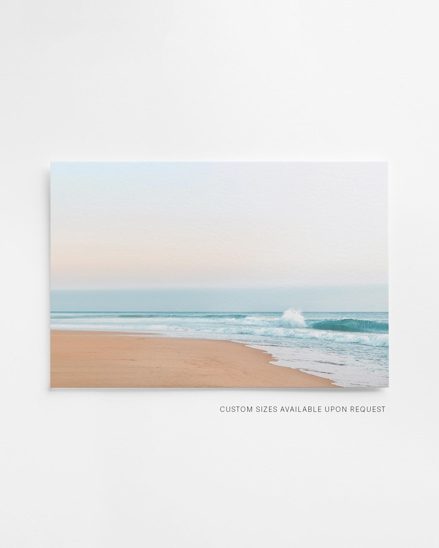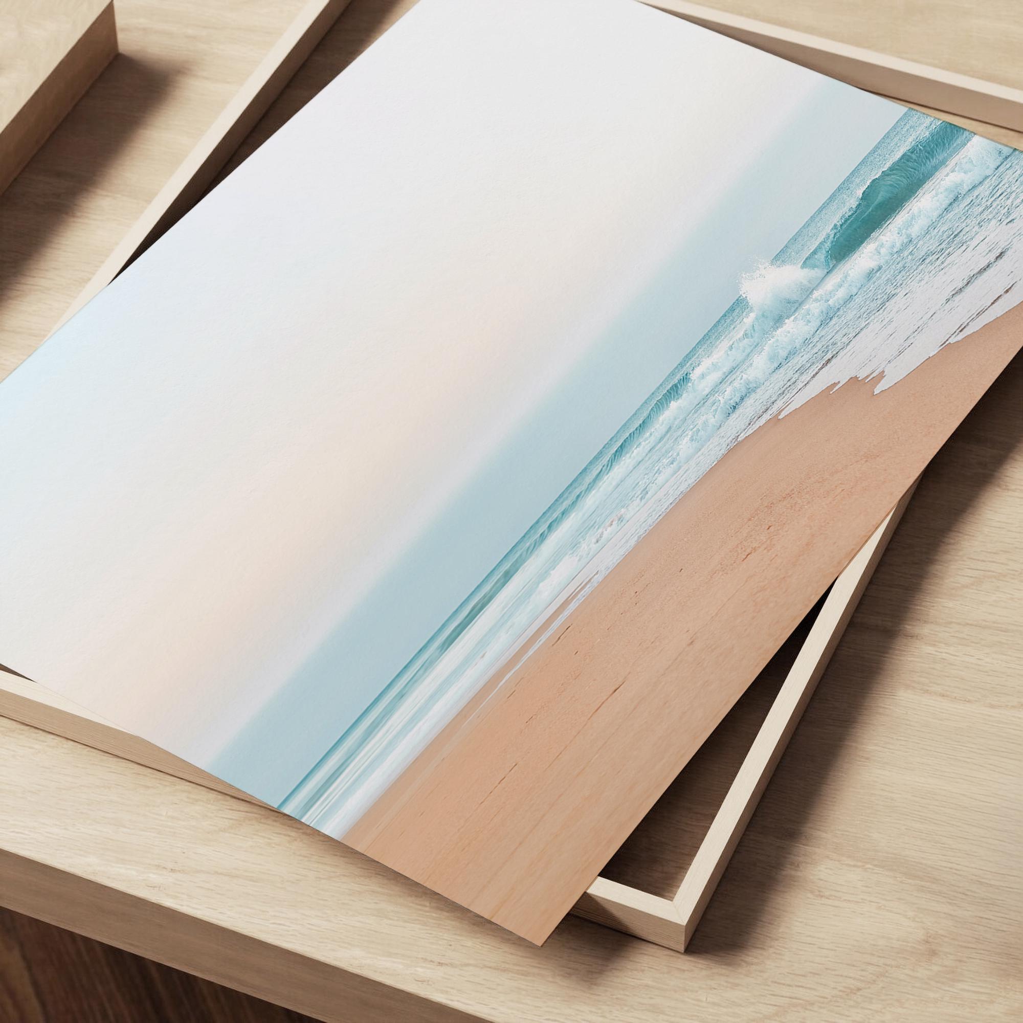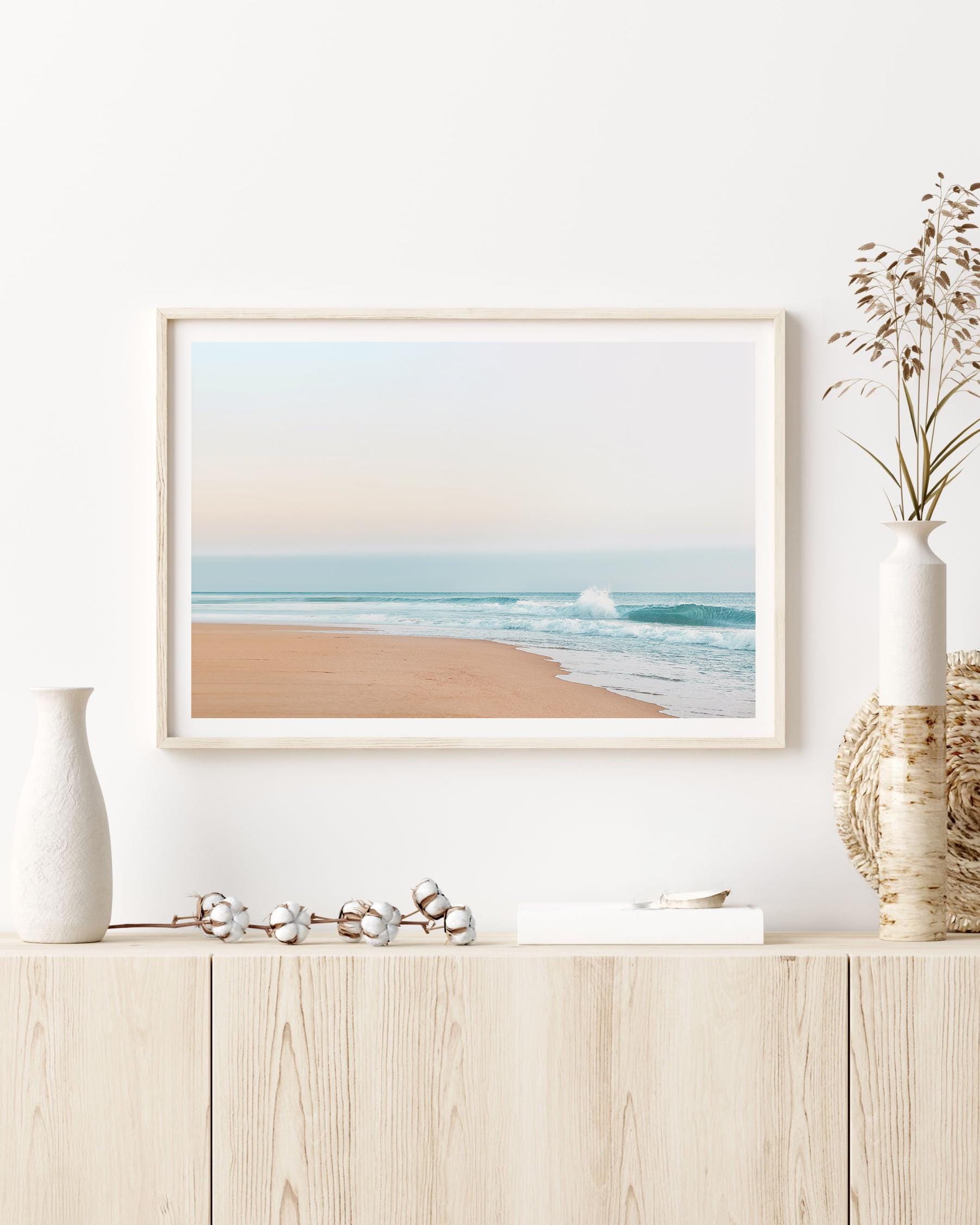 Breathe a sense of ease into your home with this serene beach wall art print, featuring soft ocean waves and a wide stretch of minimalist shoreline. The gentle tones and airy composition create a warm, refined calm that blends beautifully with neutral or coastal interiors.