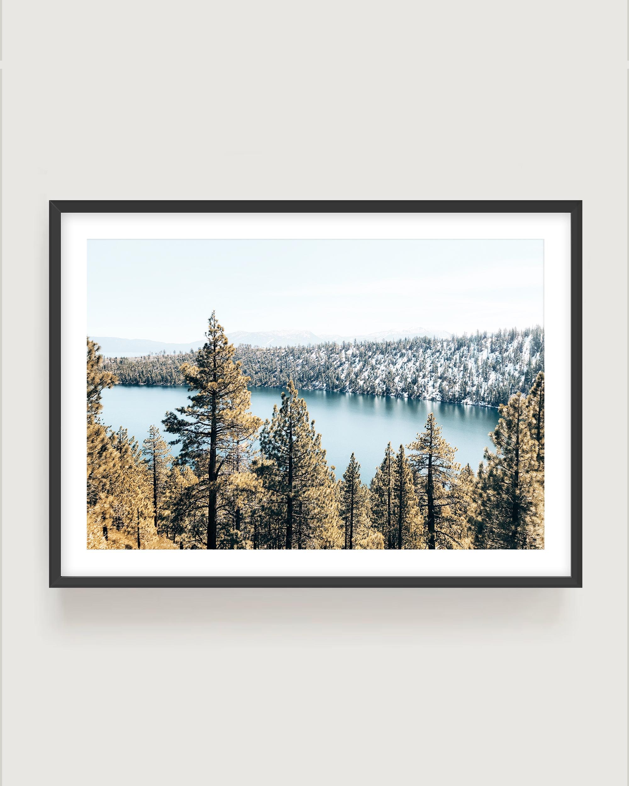 Soft winter light settles over Lake Tahoe in this peaceful landscape print, where snow-dusted pines frame the stillness of a calm mountain lake. The muted blues and gentle neutrals bring a sense of quiet clarity, creating a refined and grounding presence in any interior.