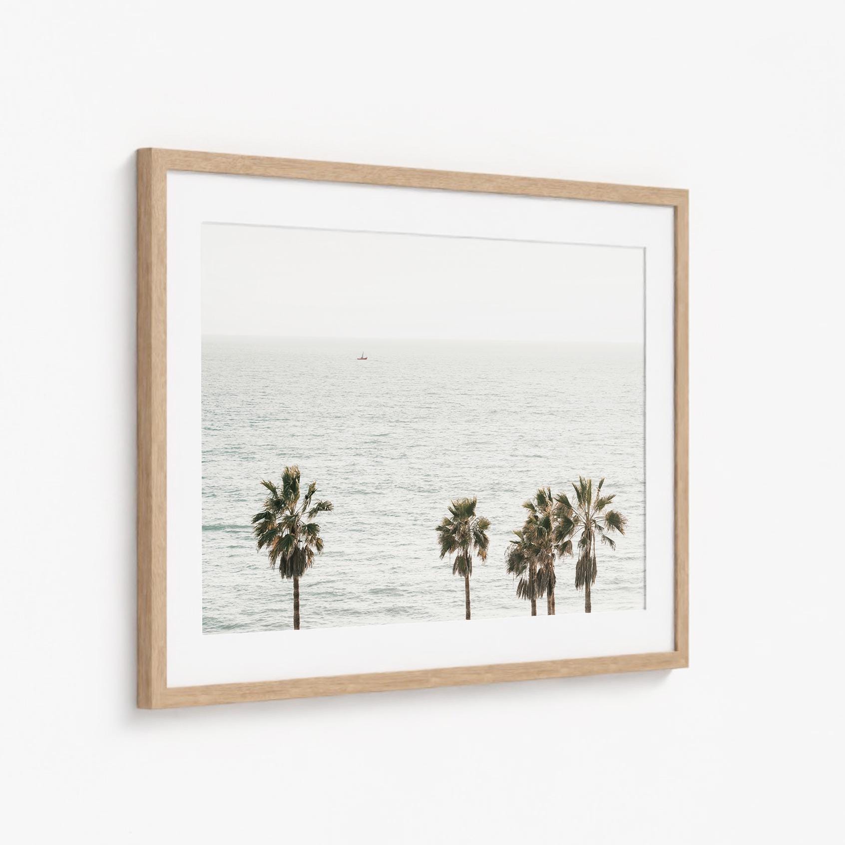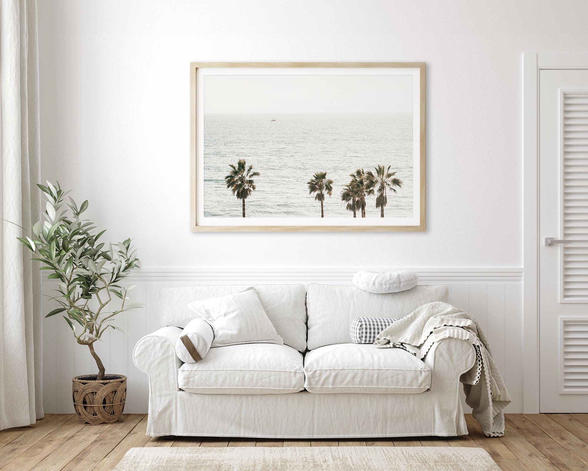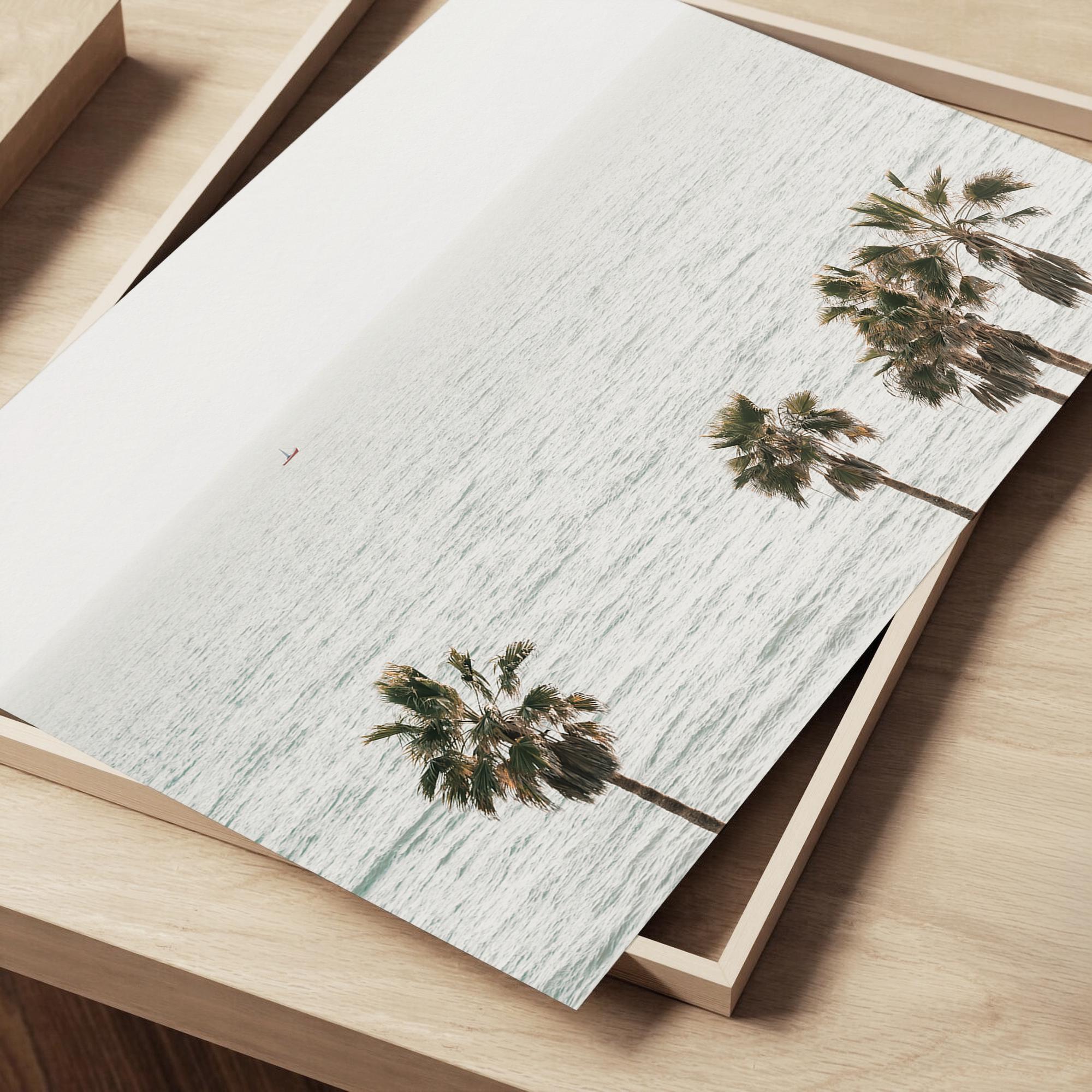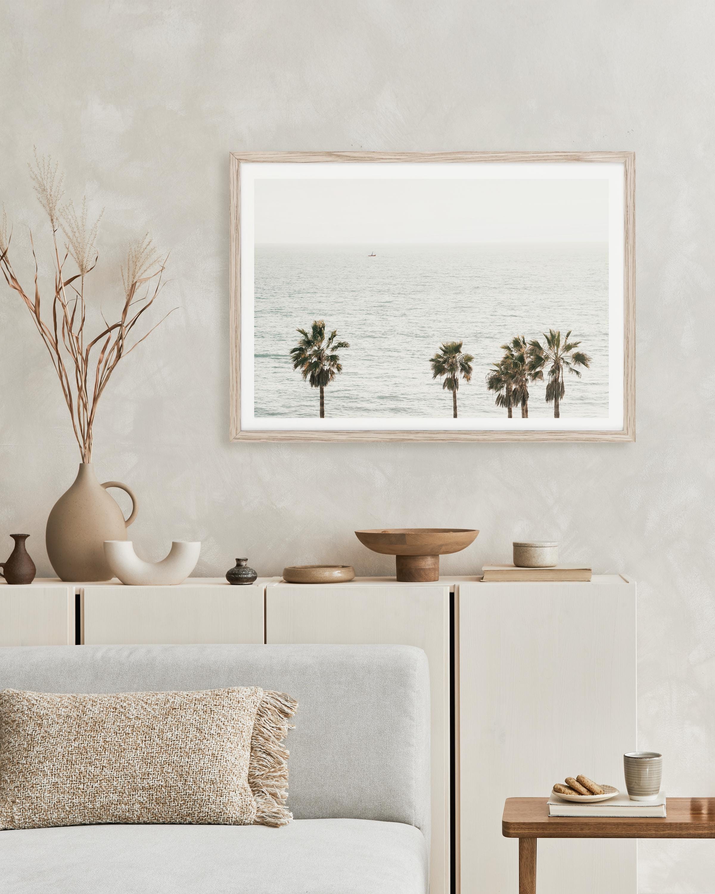 Soft light and quiet coastal tones define this muted ocean print, where palms rise gently against a serene, hazy shoreline. The understated palette and minimal composition create a warm, refined calm that blends effortlessly with neutral interiors.
