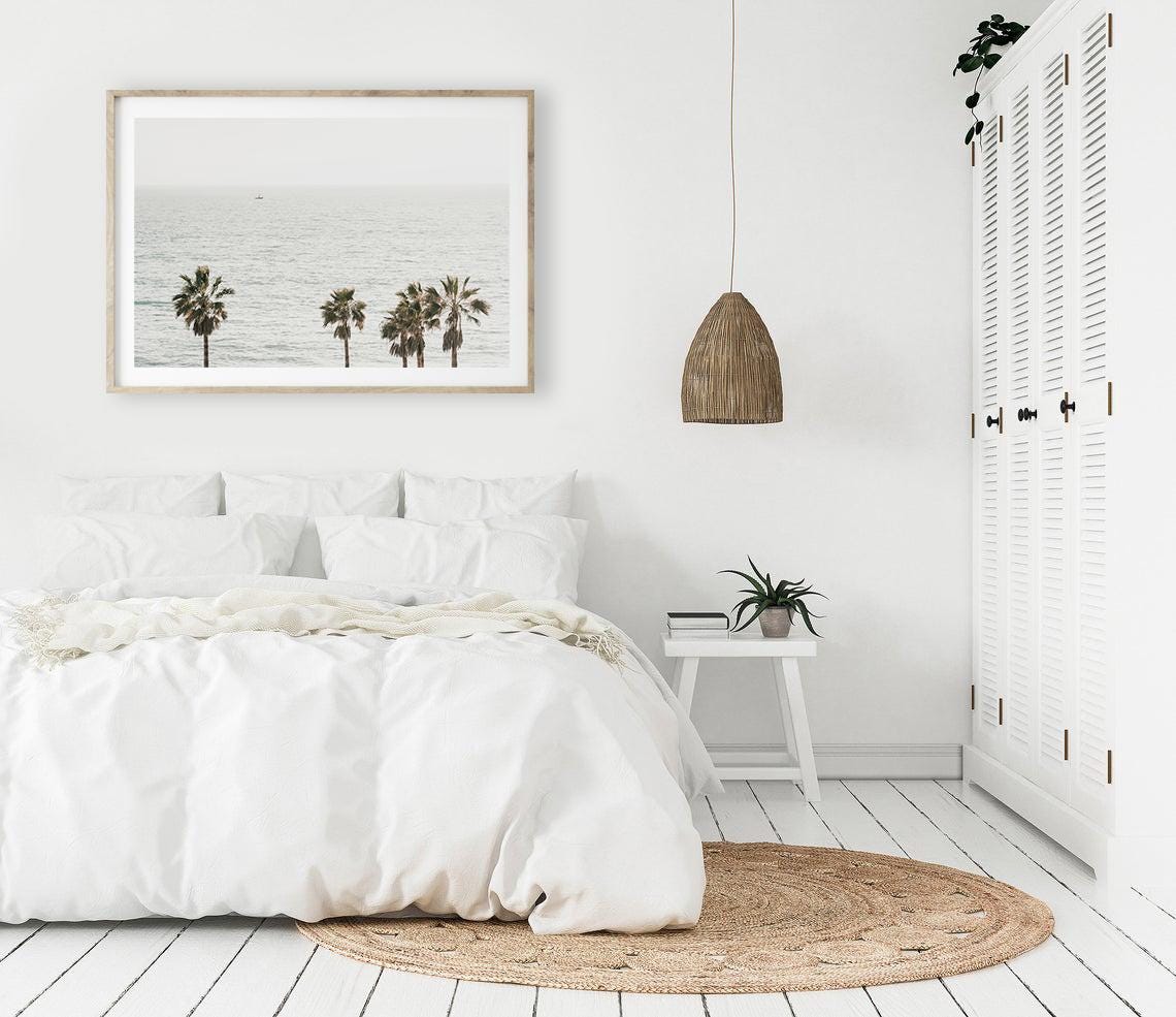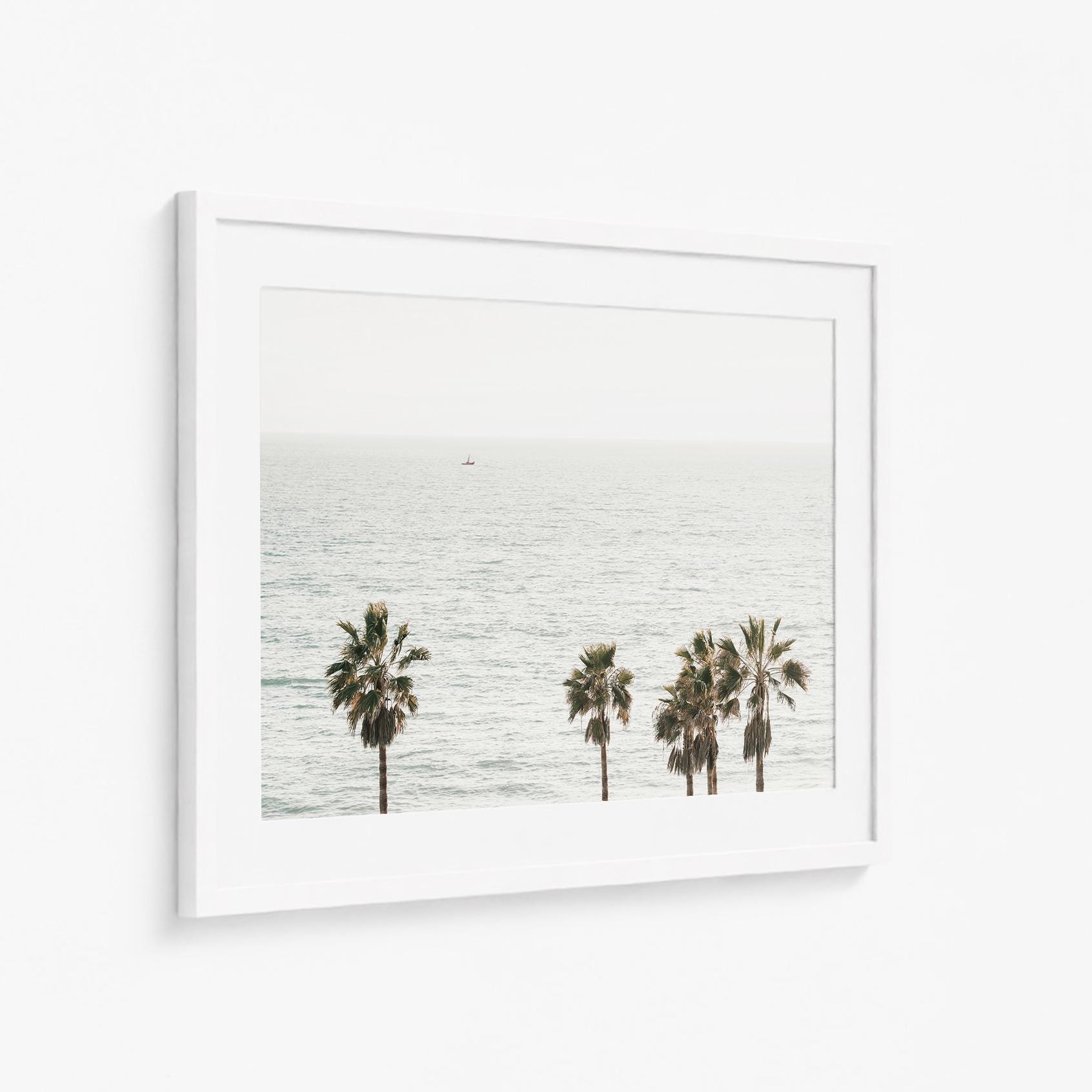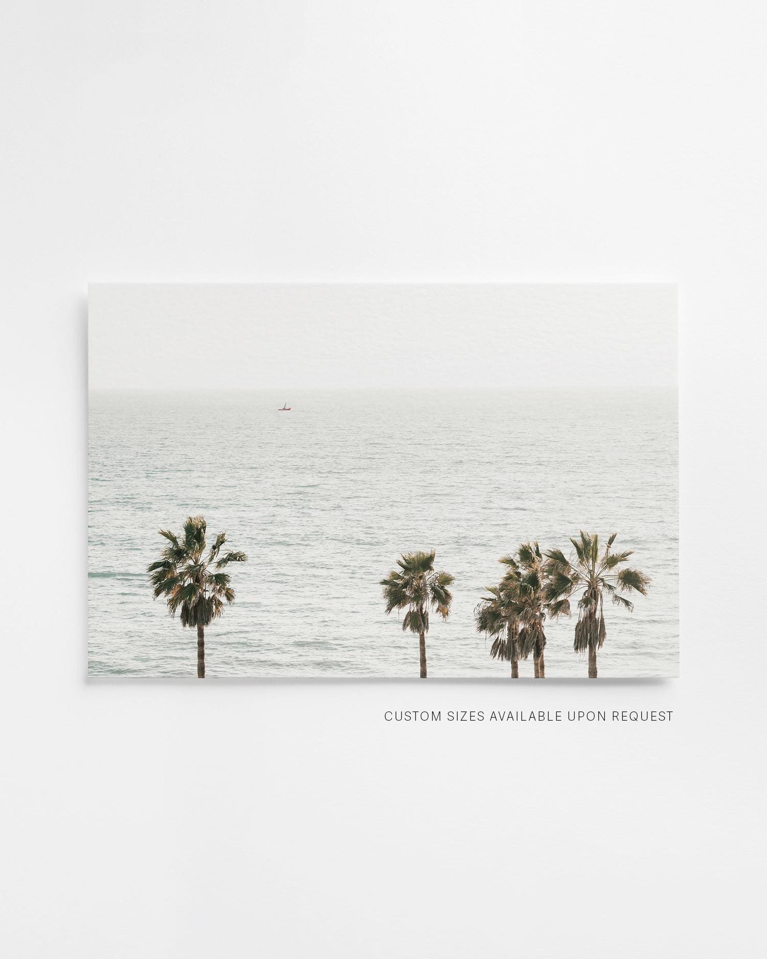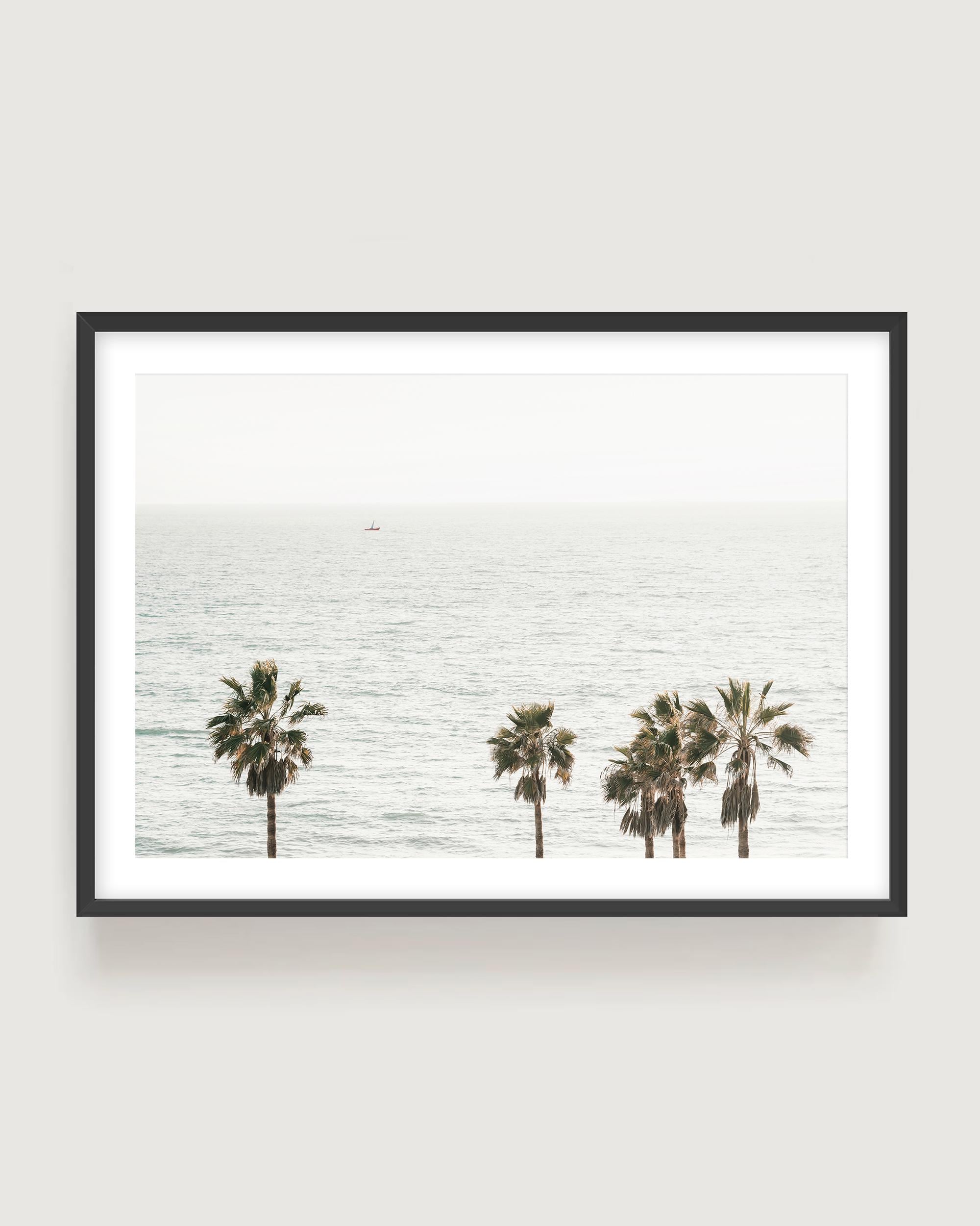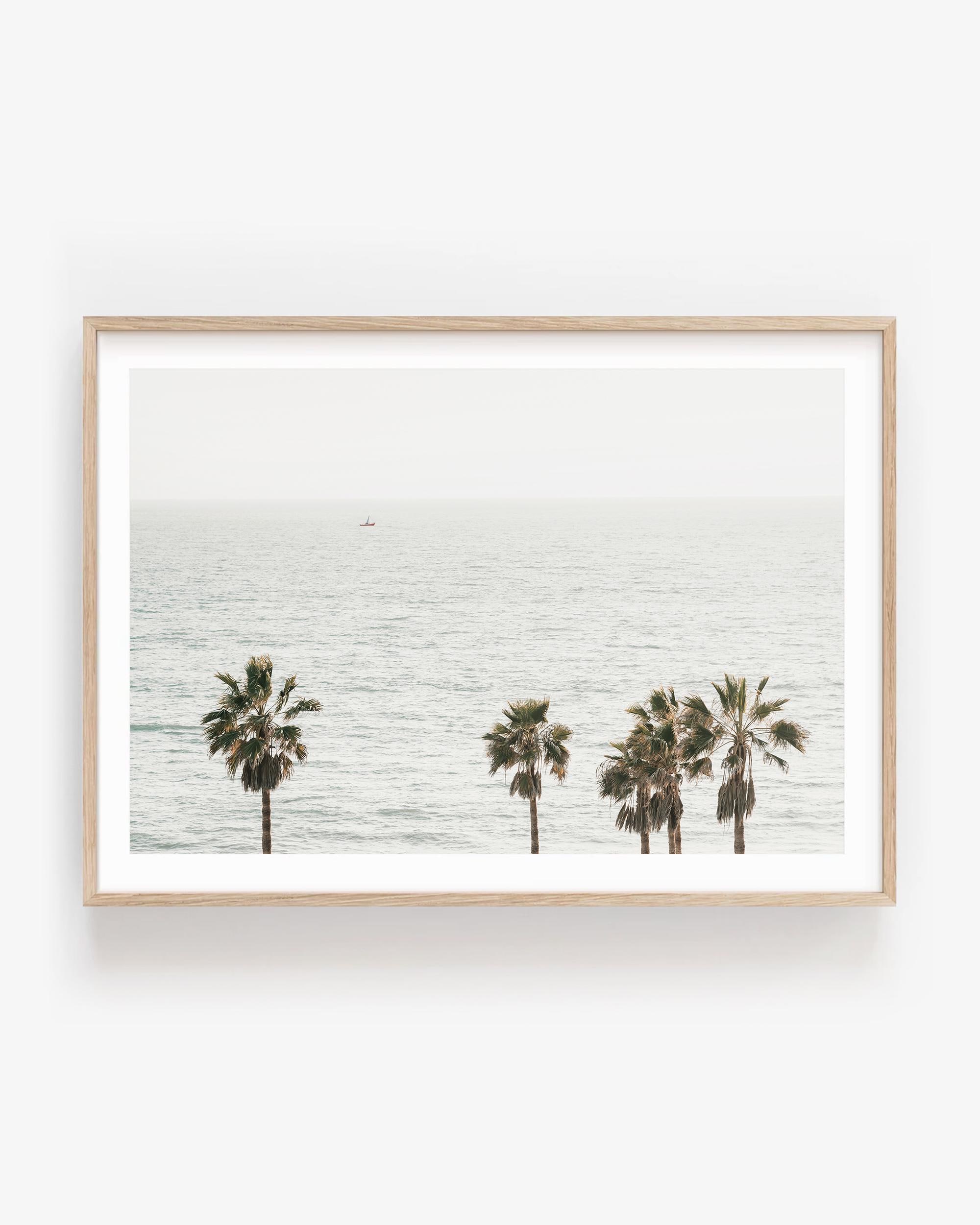 Soft light and quiet coastal tones define this muted ocean print, where palms rise gently against a serene, hazy shoreline. The understated palette and minimal composition create a warm, refined calm that blends effortlessly with neutral interiors.